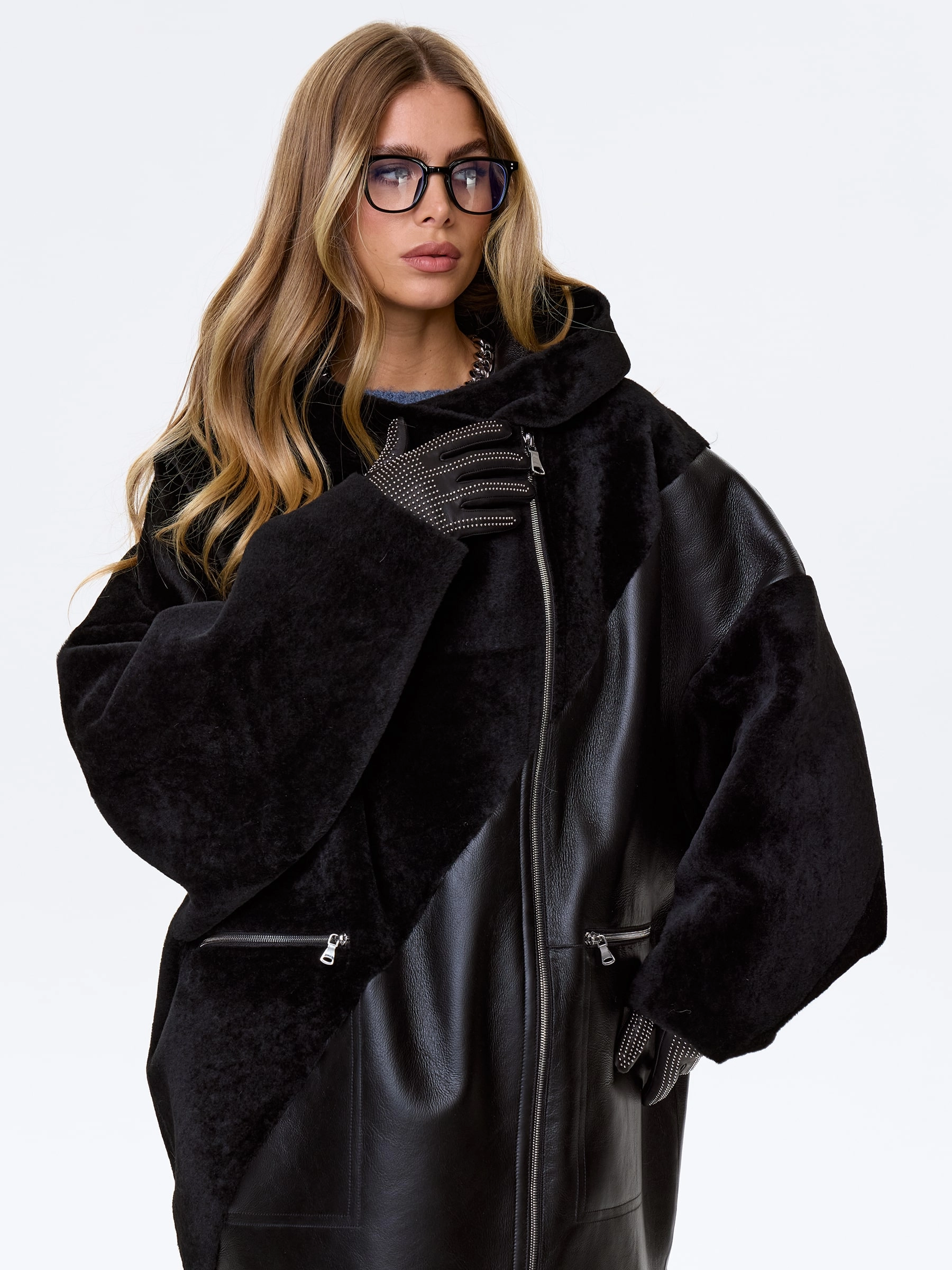 Женская дубленка оверсайз с капюшоном премиум класса 2055, черная, размер 50, артикул 62450