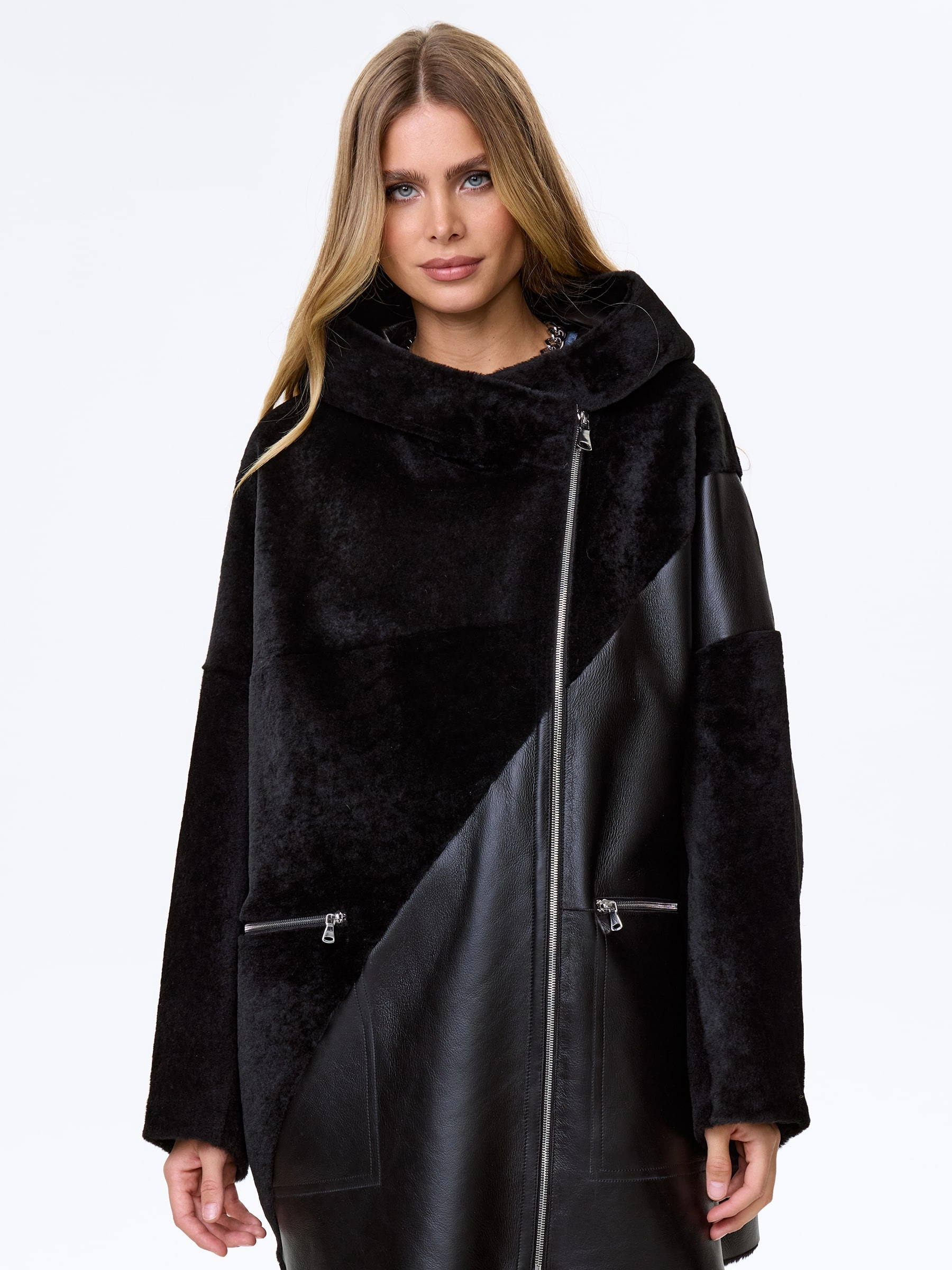 Товар женская дубленка оверсайз с капюшоном премиум класса 2055, черная, размер 50, артикул 62450 выполнен из овчина "мерино" с застежкой молния. Рассчитан на сезон: осень-зима. Длина изделия 80 см, силуэт свободный.