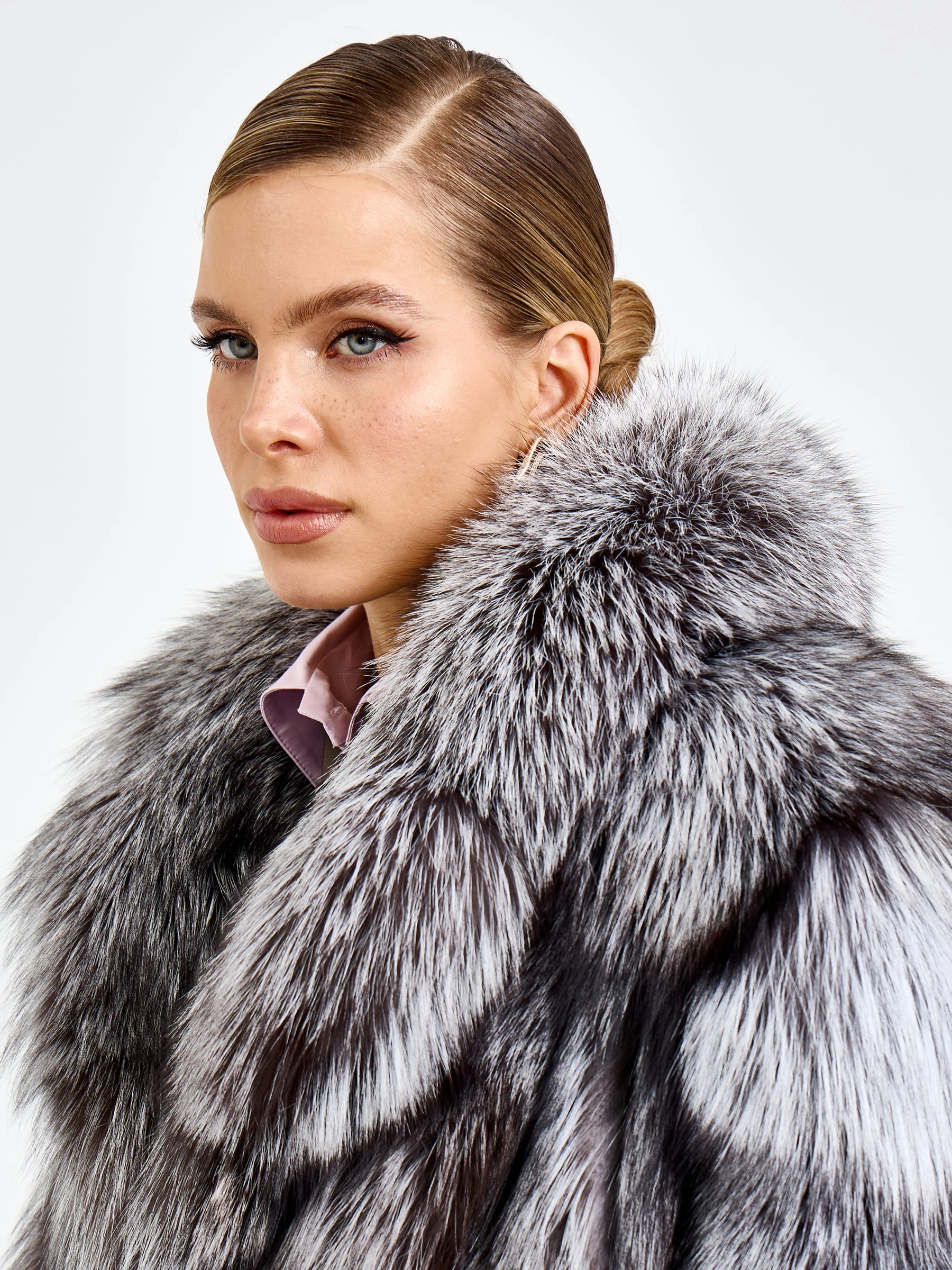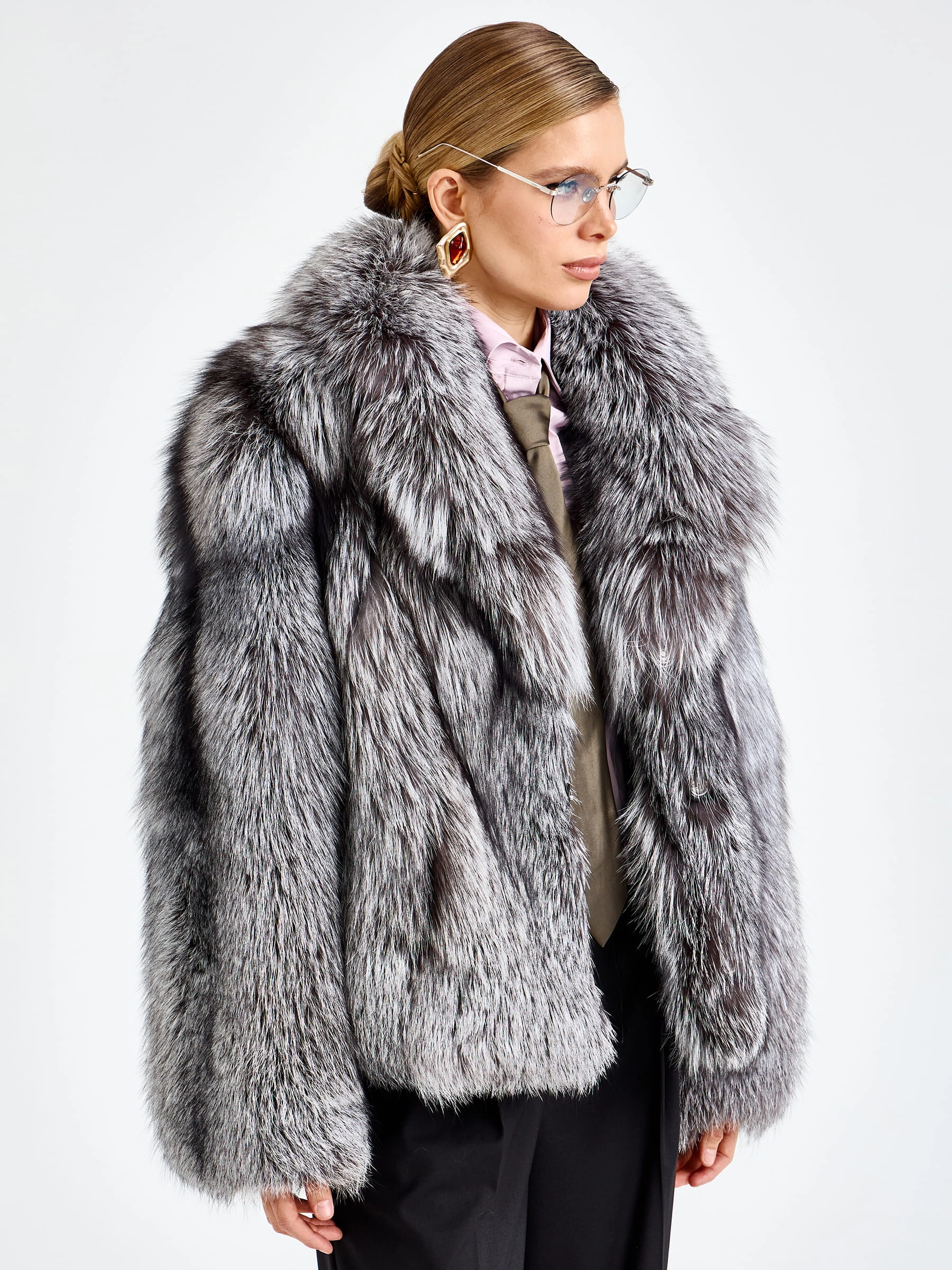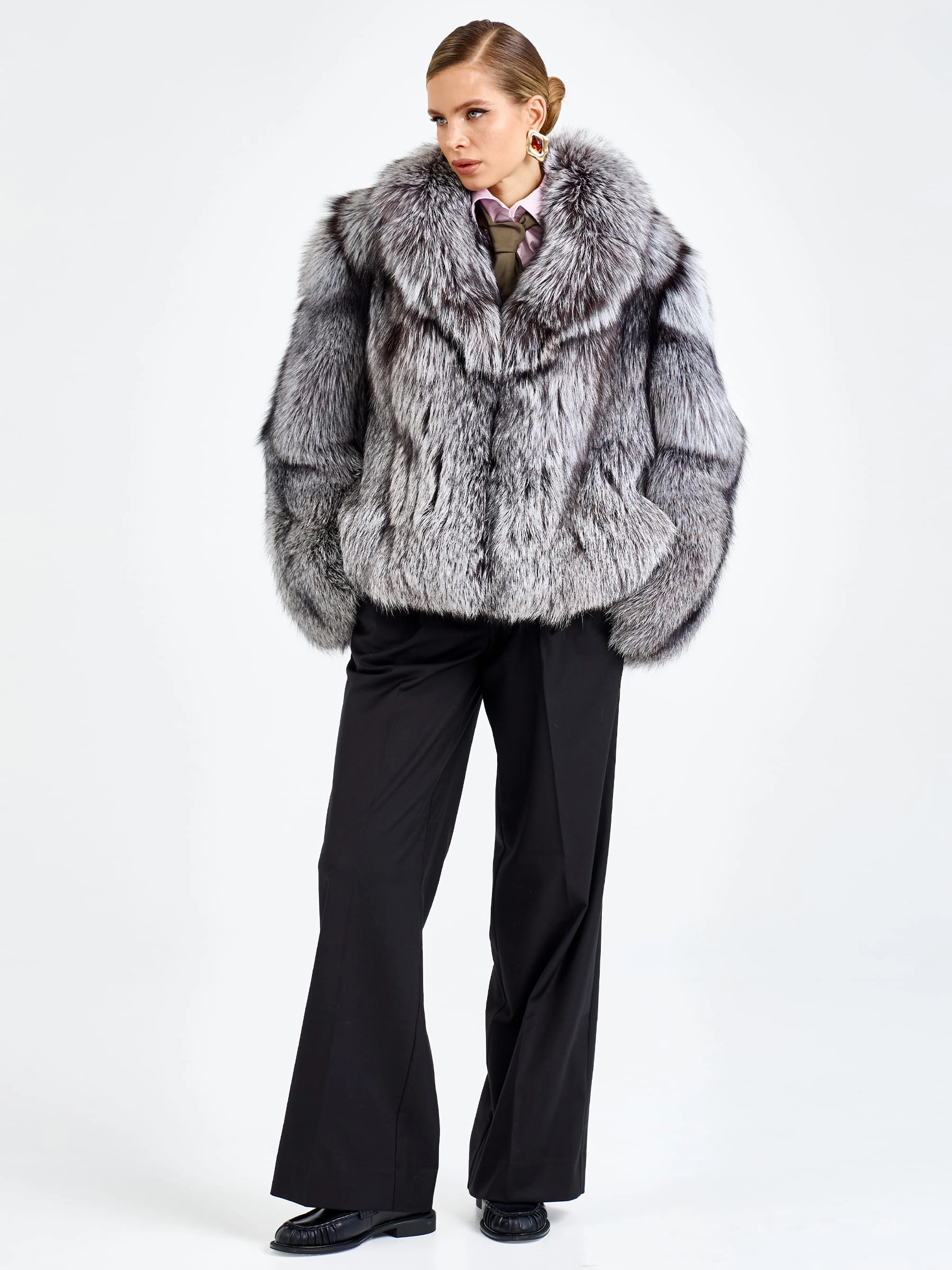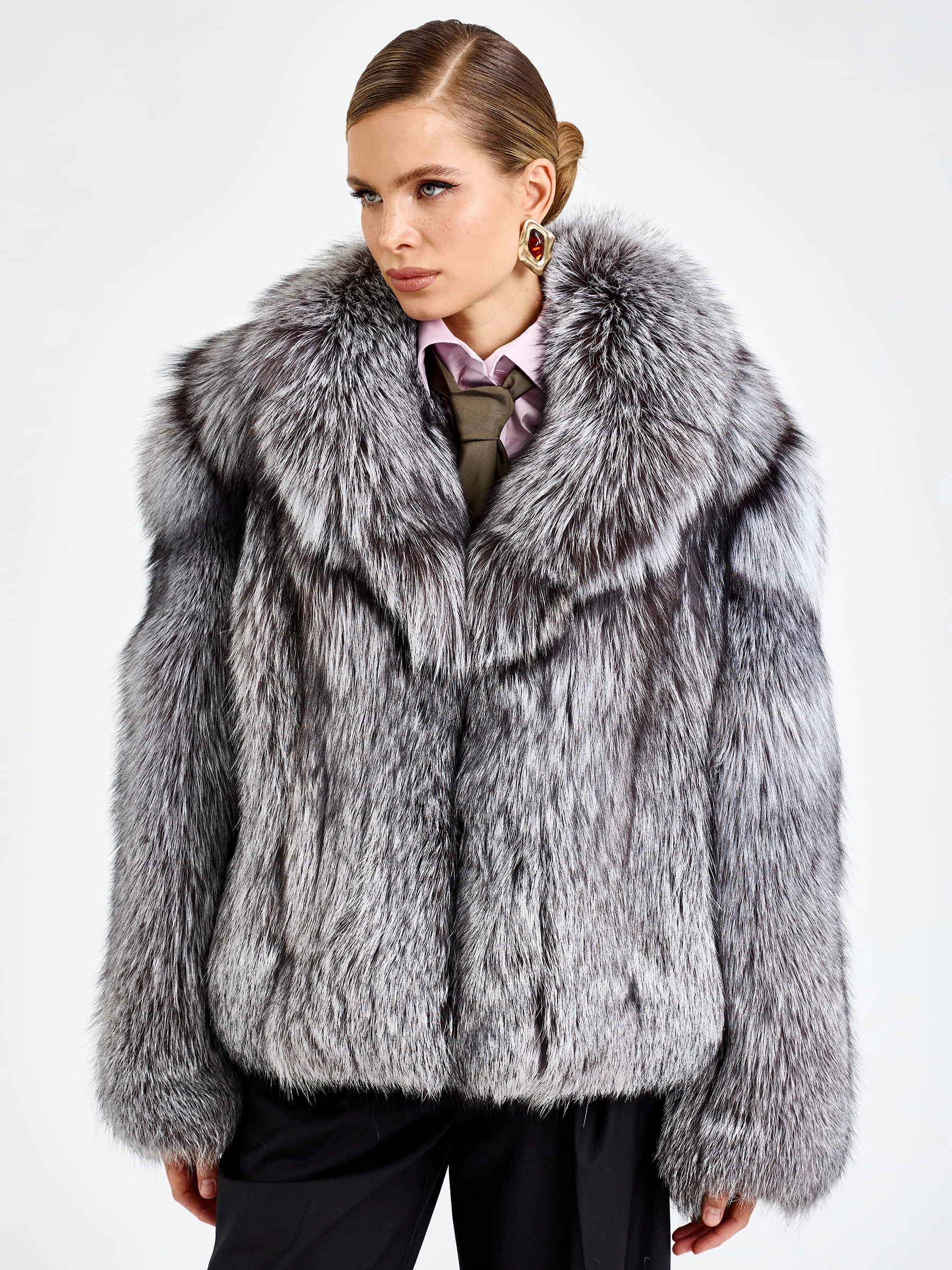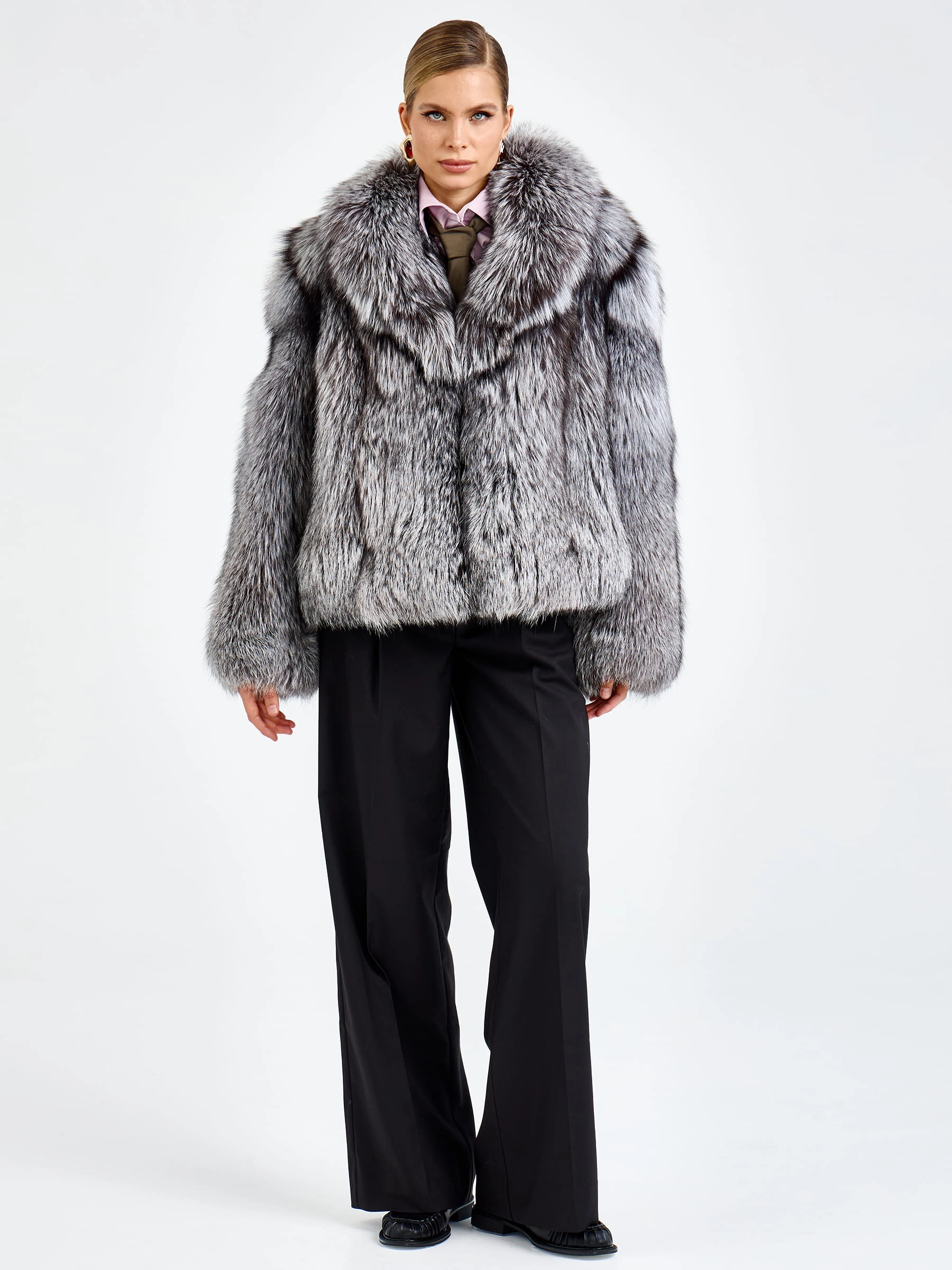 Короткая шуба из меха чернобурки с воротником английского кроя — это вызов условностям и воплощение дерзкой элегантности для тех, кто не боится выделяться. Модель свободного силуэта длиной 65 сантиметров с рукавом кимоно создает идеальный баланс между роскошным объемом меха и невесомой легкостью кроя, позволяя чувствовать себя комфортно и уверенно. Эффектный английский воротник подчеркивает классическое звучание модели, а свободный крой дополнен поясом, который позволяет при желании акцентировать талию и менять силуэт от расслабленного до более собранного. Уникальная текстура меха чернобурки с его характерным серебристым отливом и графичным рисунком придает шубе неповторимую фактурность и визуальную глубину. Невидимая застежка на клипсы сохраняет целостность меха, а качественная смесовая подкладка гарантирует комфорт при носке. Стилисты рекомендуют сочетать эту шубу с высокими сапогами и объемным свитером, чтобы создать образ, который выглядит стильно, дерзко и небрежно-элегантно одновременно.