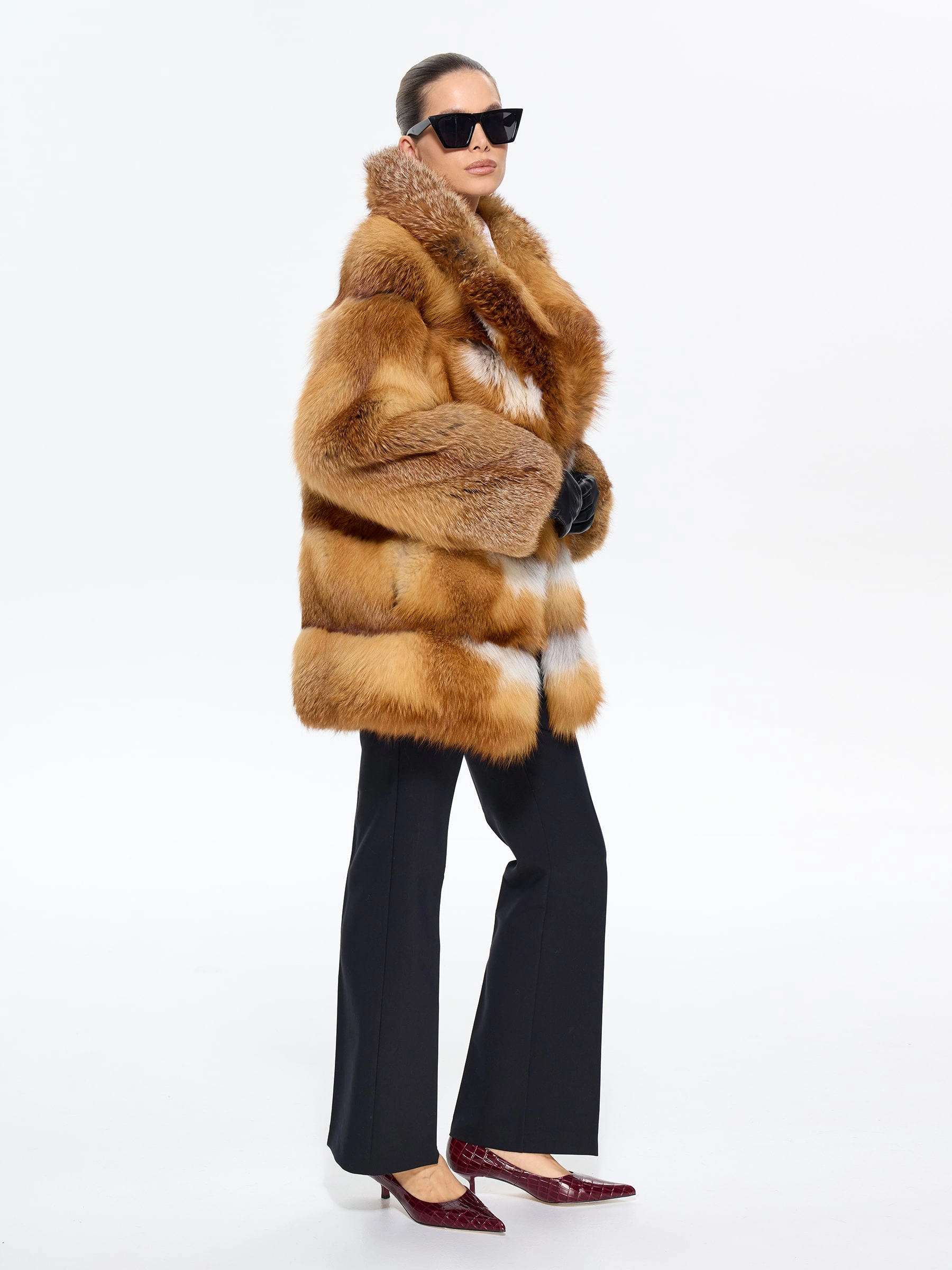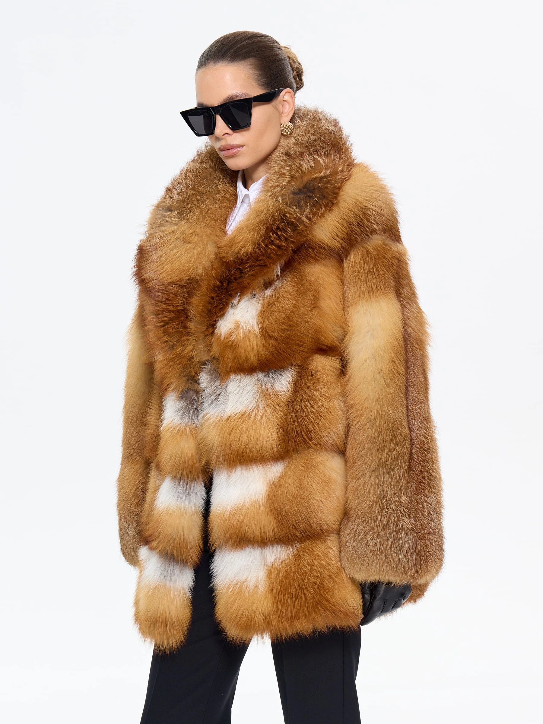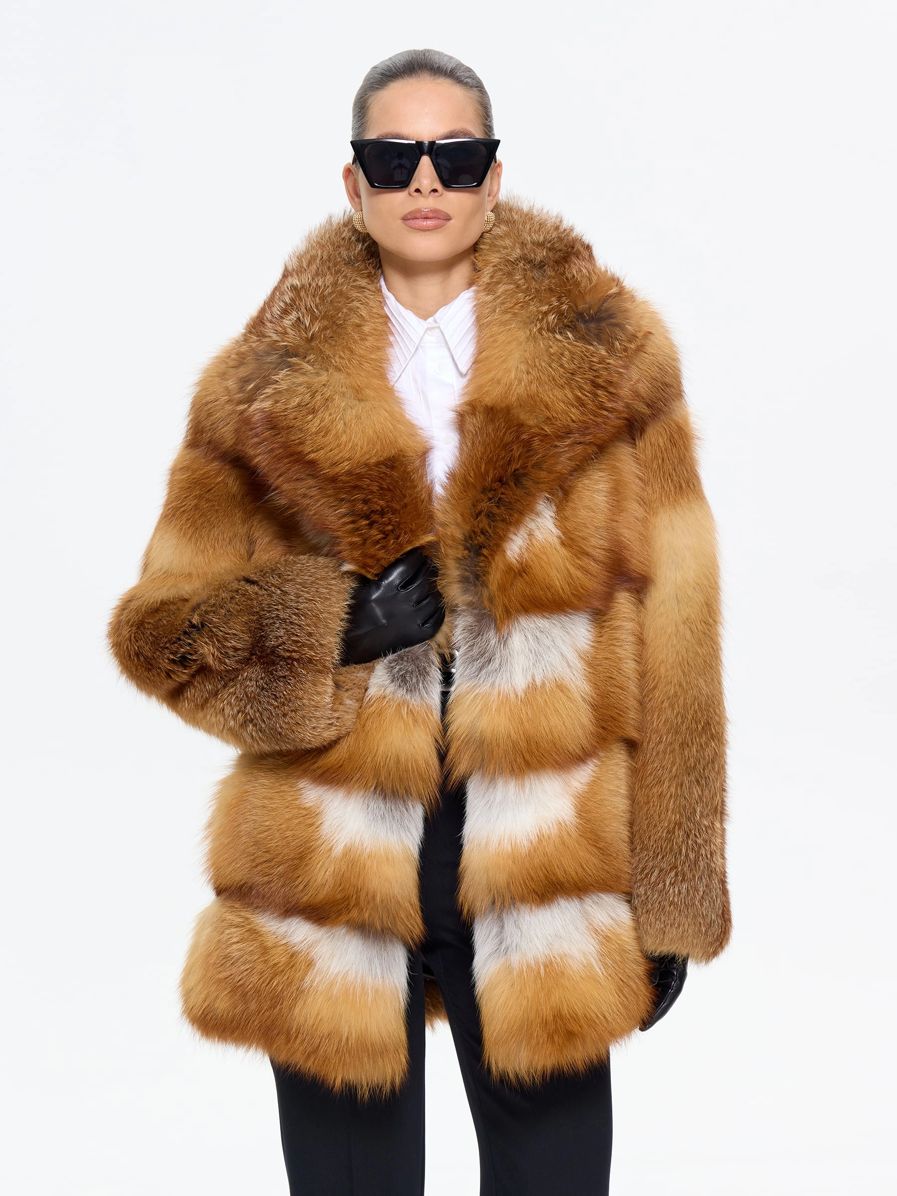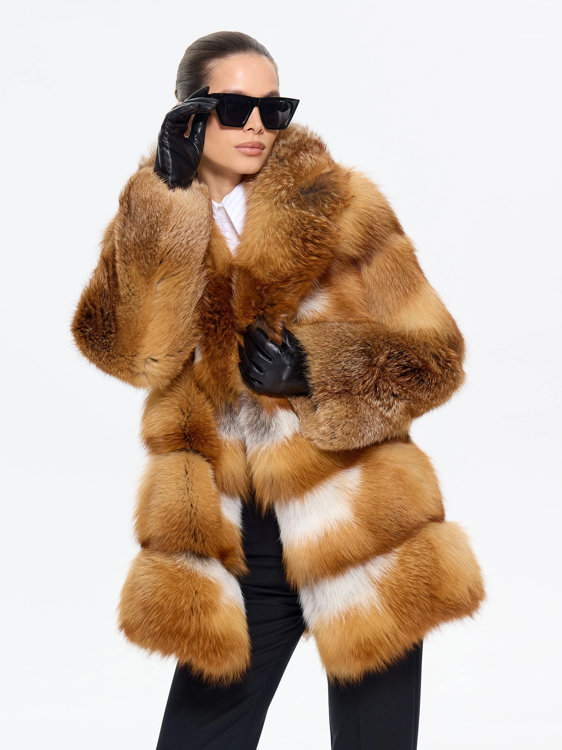 Пламенная шуба из меха лисы без капюшона с элегантным английским воротником — для тех, кто привык быть в центре внимания! Модель длиной 75 см с классическим прямым кроем и роскошным рыжим мехом создает образ дерзкой аристократки. Стилисты рекомендуют носить эту шубу с кожаными брюками и грубыми ботинками для смелого повседневного образа или с шелковым платьем-чехлом и сапогами-ботфортами для вечернего выхода — она станет главным акцентом вашего гардероба, подчеркивающим бескомпромиссный вкус и яркую индивидуальность.