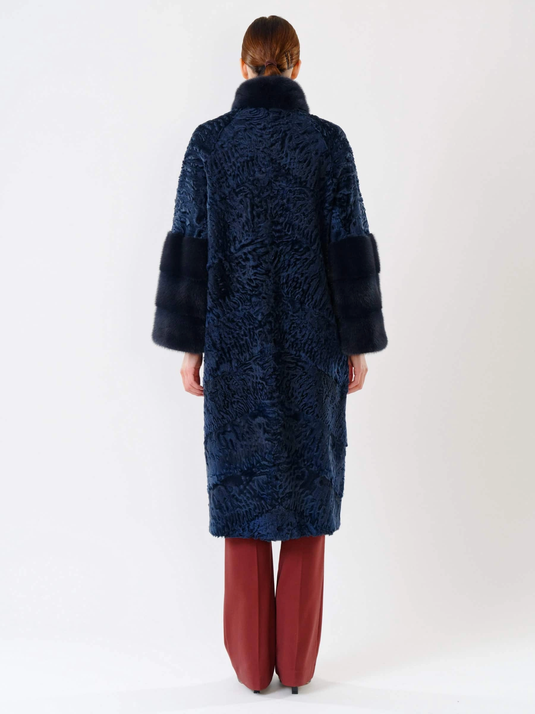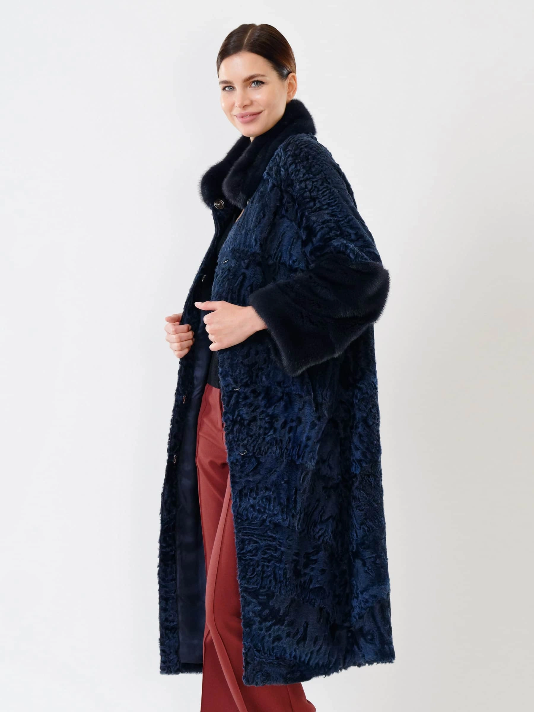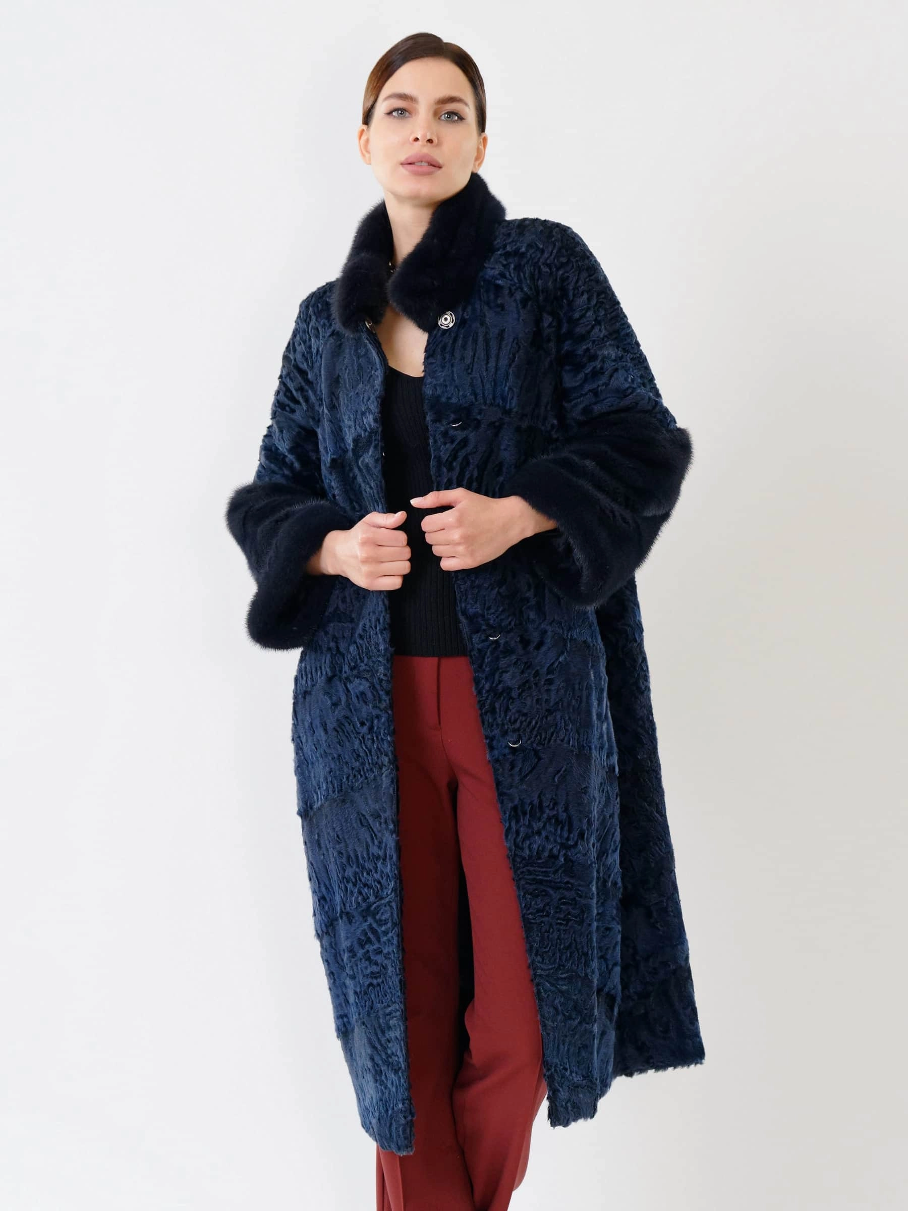 Товар женская шуба из меха каракуля с мехом норки 17101д(сн), синяя, размер 44, артикул 22580 выполнен из мех каракуля с застежкой клипсы. Рассчитан на сезон: осень-зима. Длина изделия свыше 90 см, силуэт прямой.