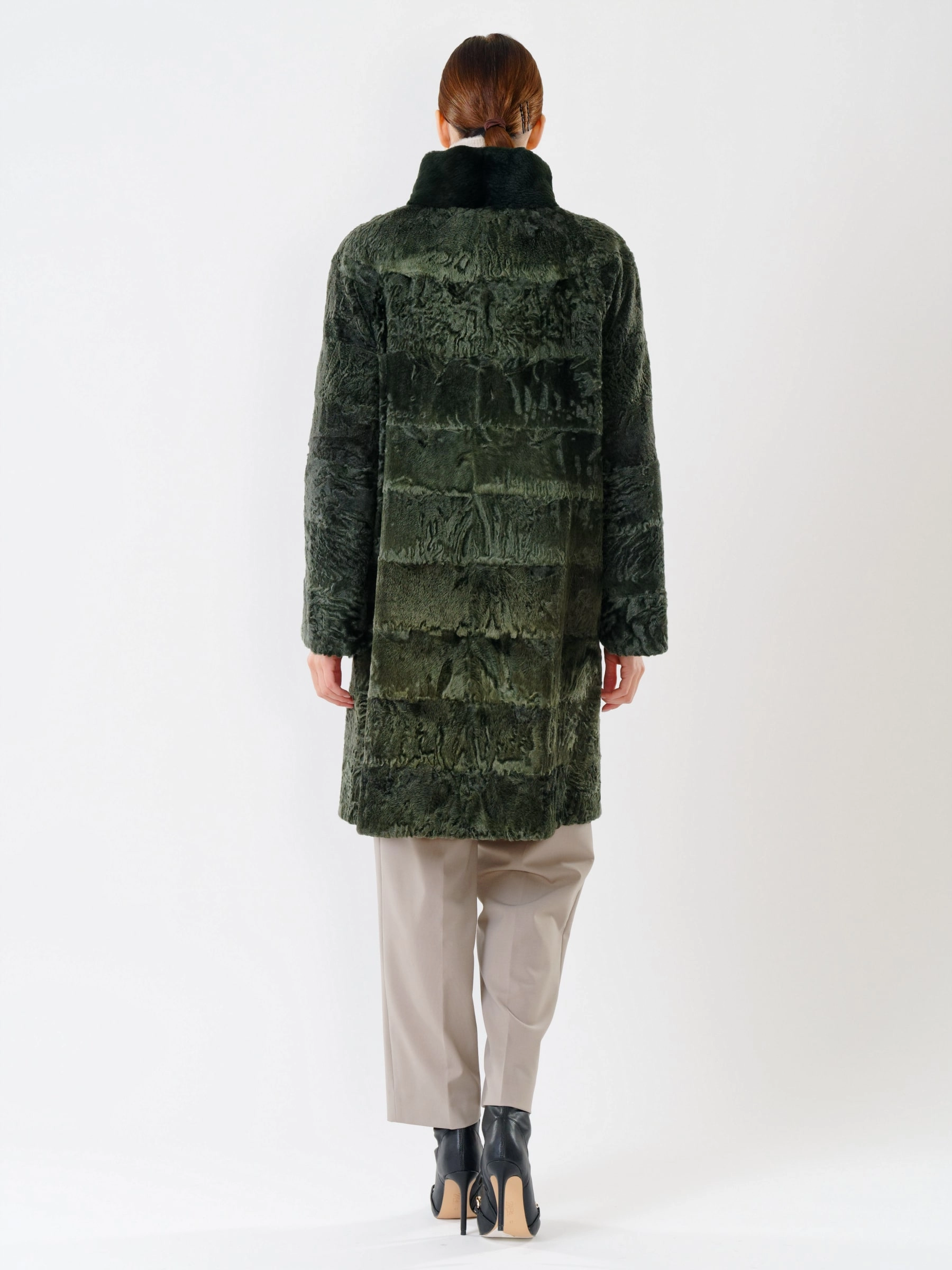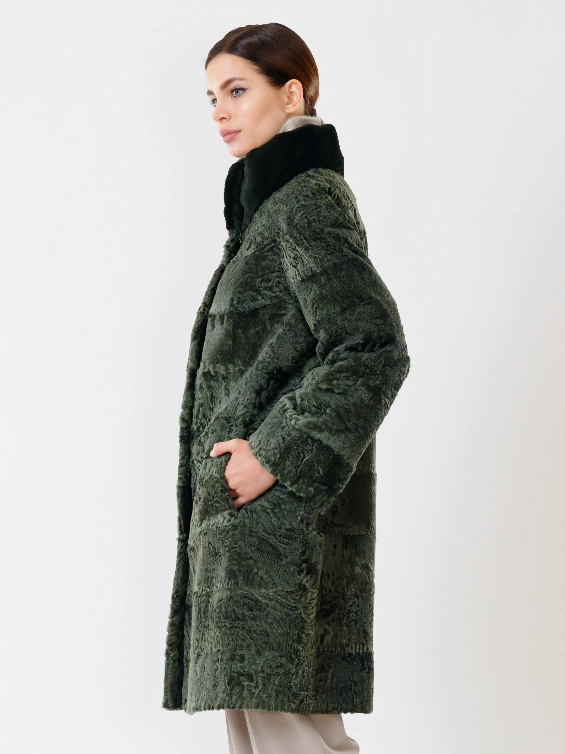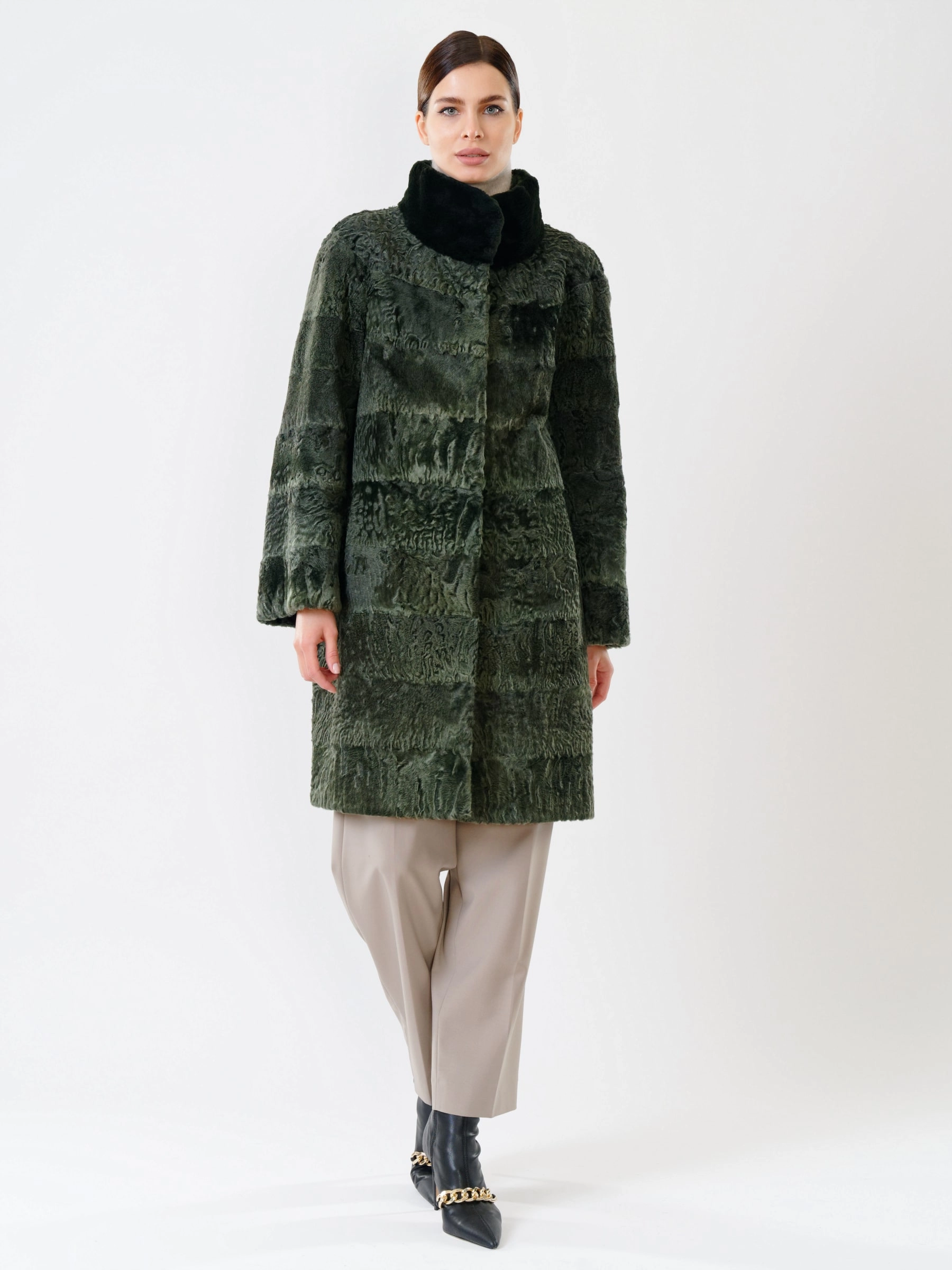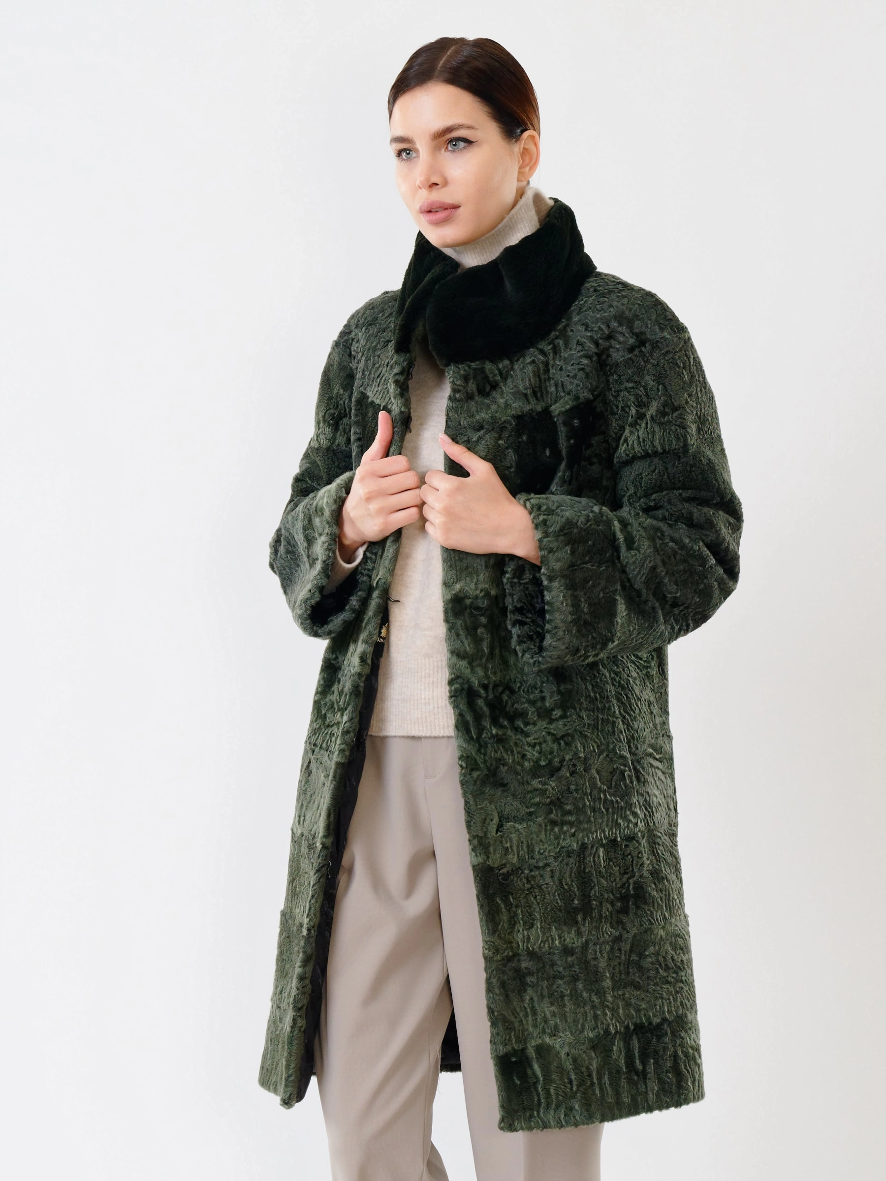 Прямое пальто из каракуля с воротником-стойкой из меха бобра — это идеальное сочетание классической элегантности и безупречного мастерства. Модель отличает чёткая, лаконичная посадка по фигуре, подчёркнутая безупречным кроем. Каждая деталь свидетельствует о высочайшем качестве: от ювелирного подбора шкурок по оттенку и фактуре волоса до аккуратной работы портных. Практичность не уступает внешнему виду — удобные врезные карманы делают это пальто комфортным для повседневной носки. Это вневременная инвестиция в гардероб, создающая утончённый и статусный образ.