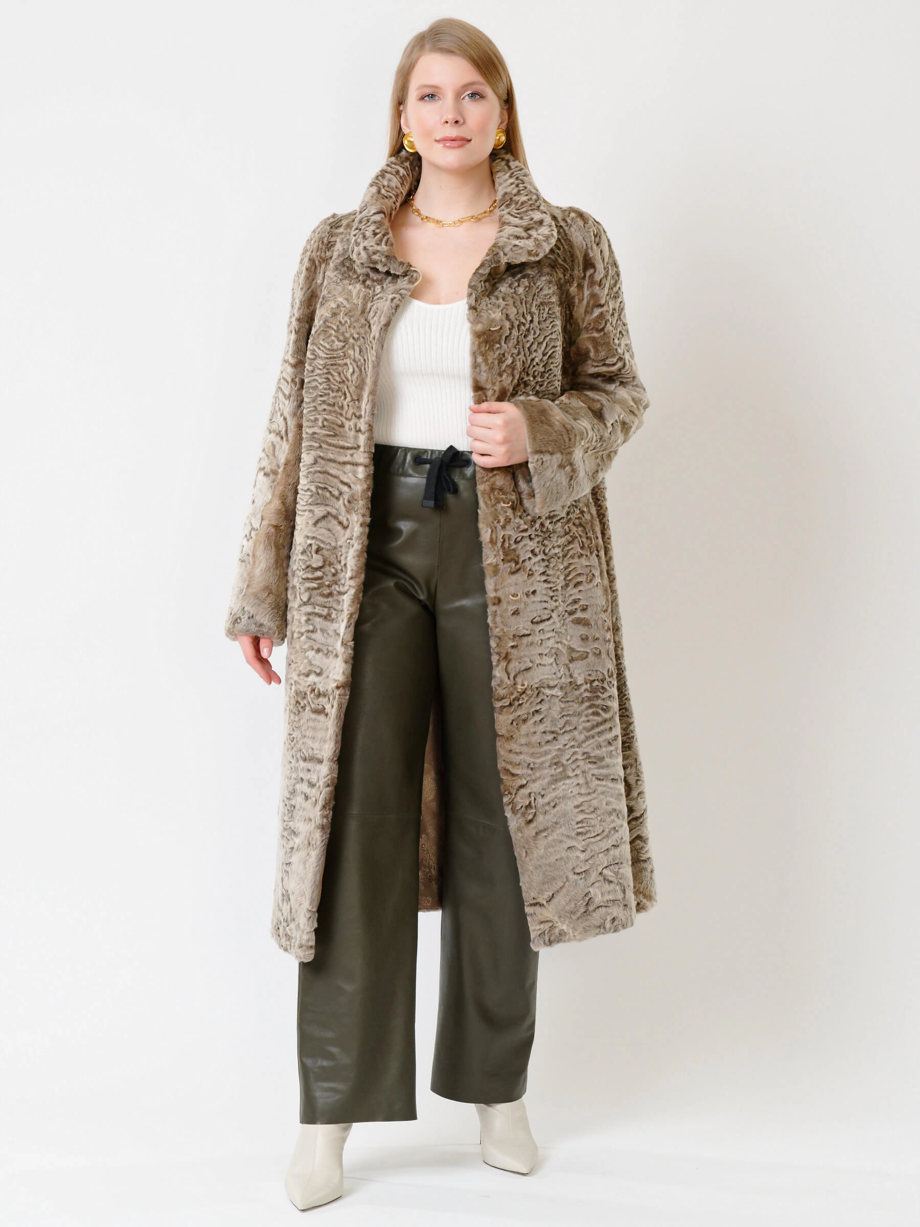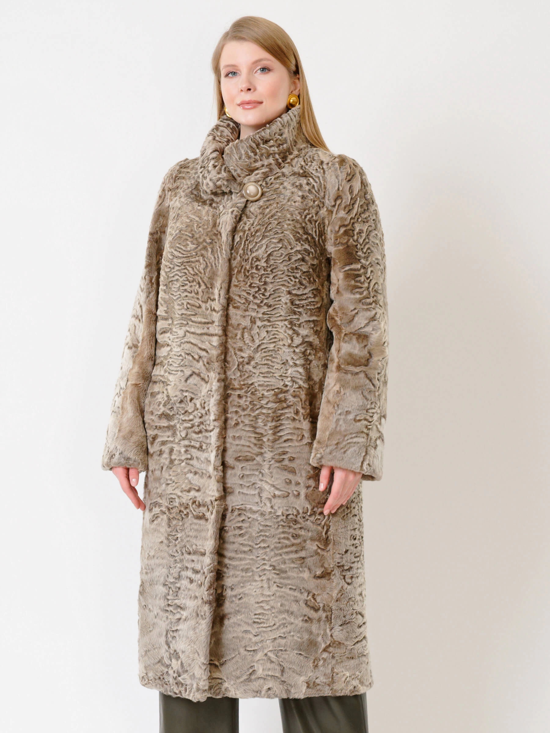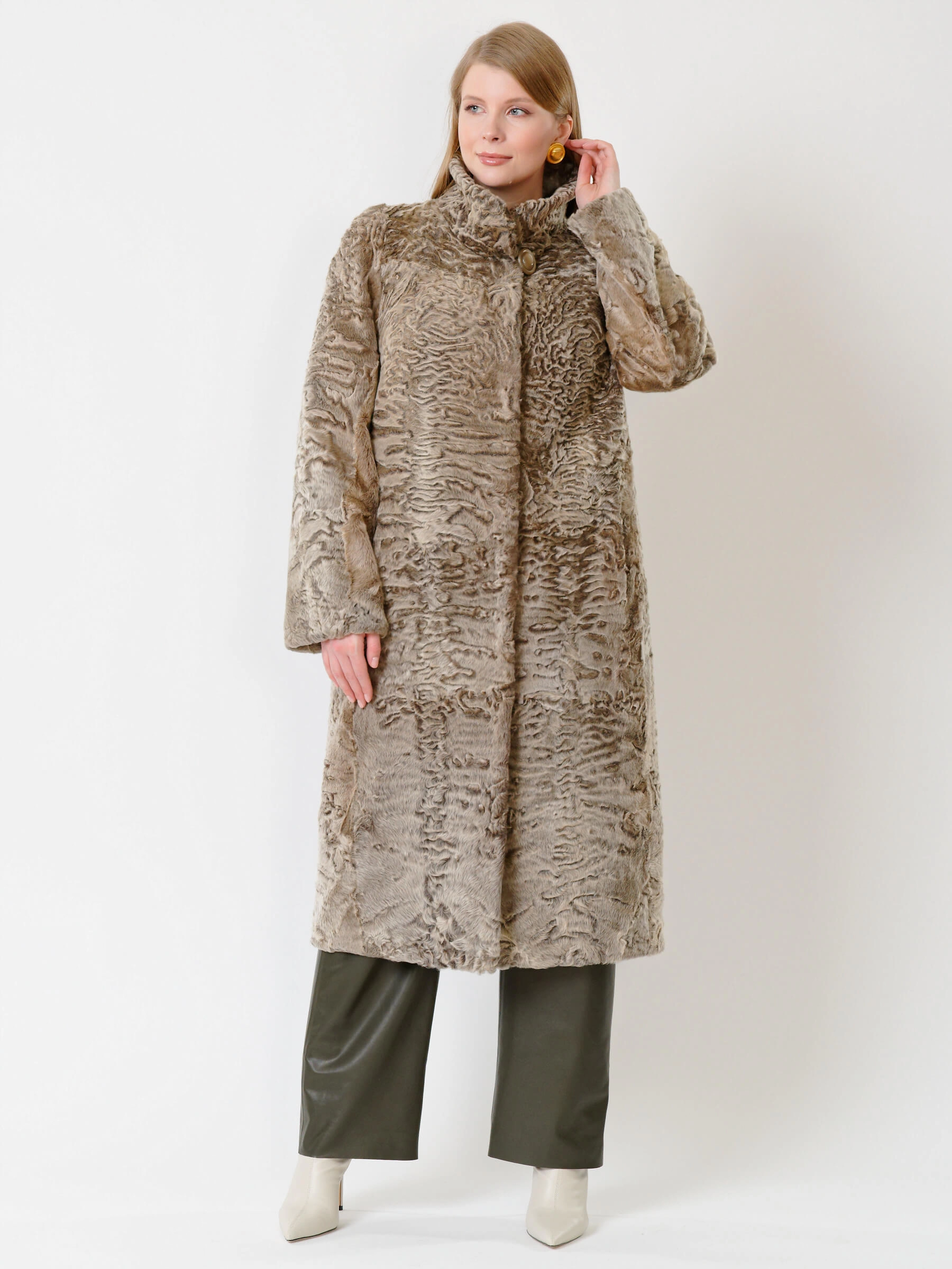Товар длинная женская шуба из меха каракуля надежда, бежевая, размер 52, артикул 22670 выполнен из мех каракуля с застежкой клипсы. Рассчитан на сезон: осень-зима. Длина изделия свыше 90 см, силуэт прямой.