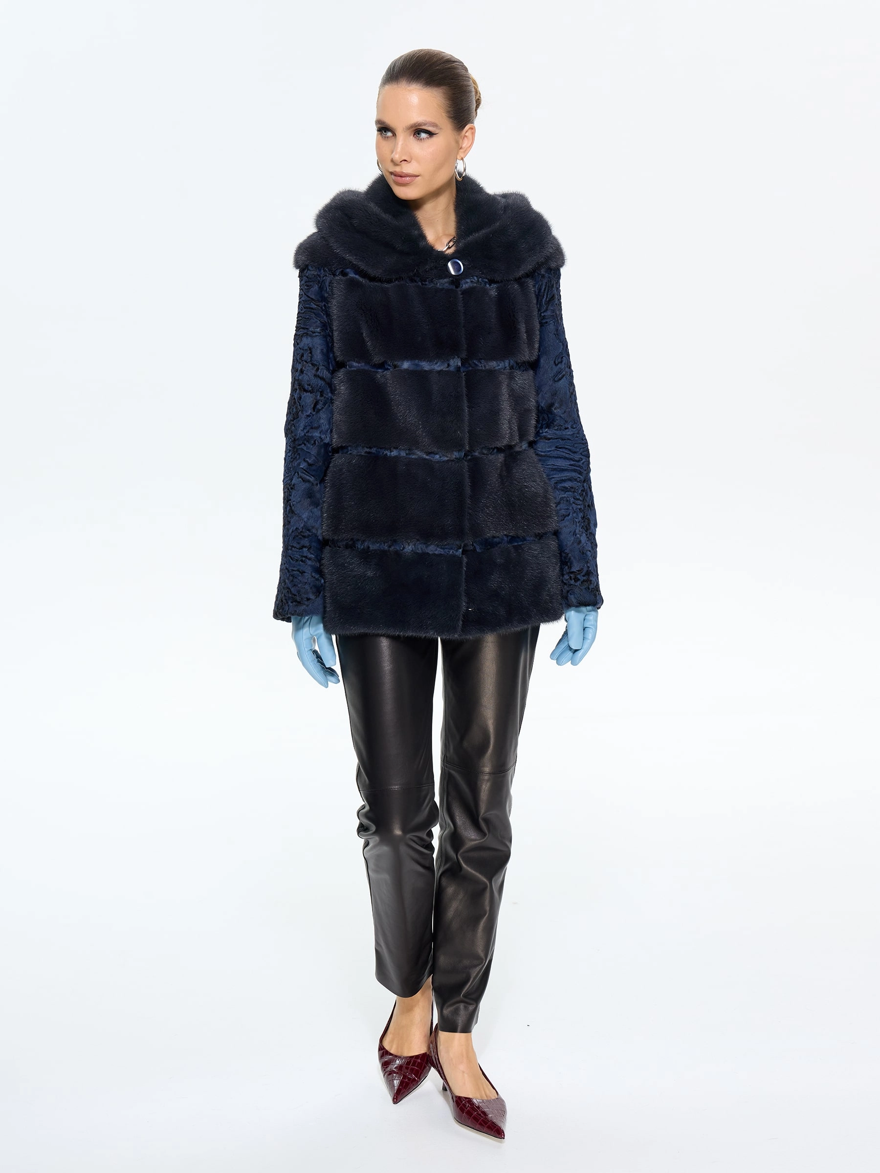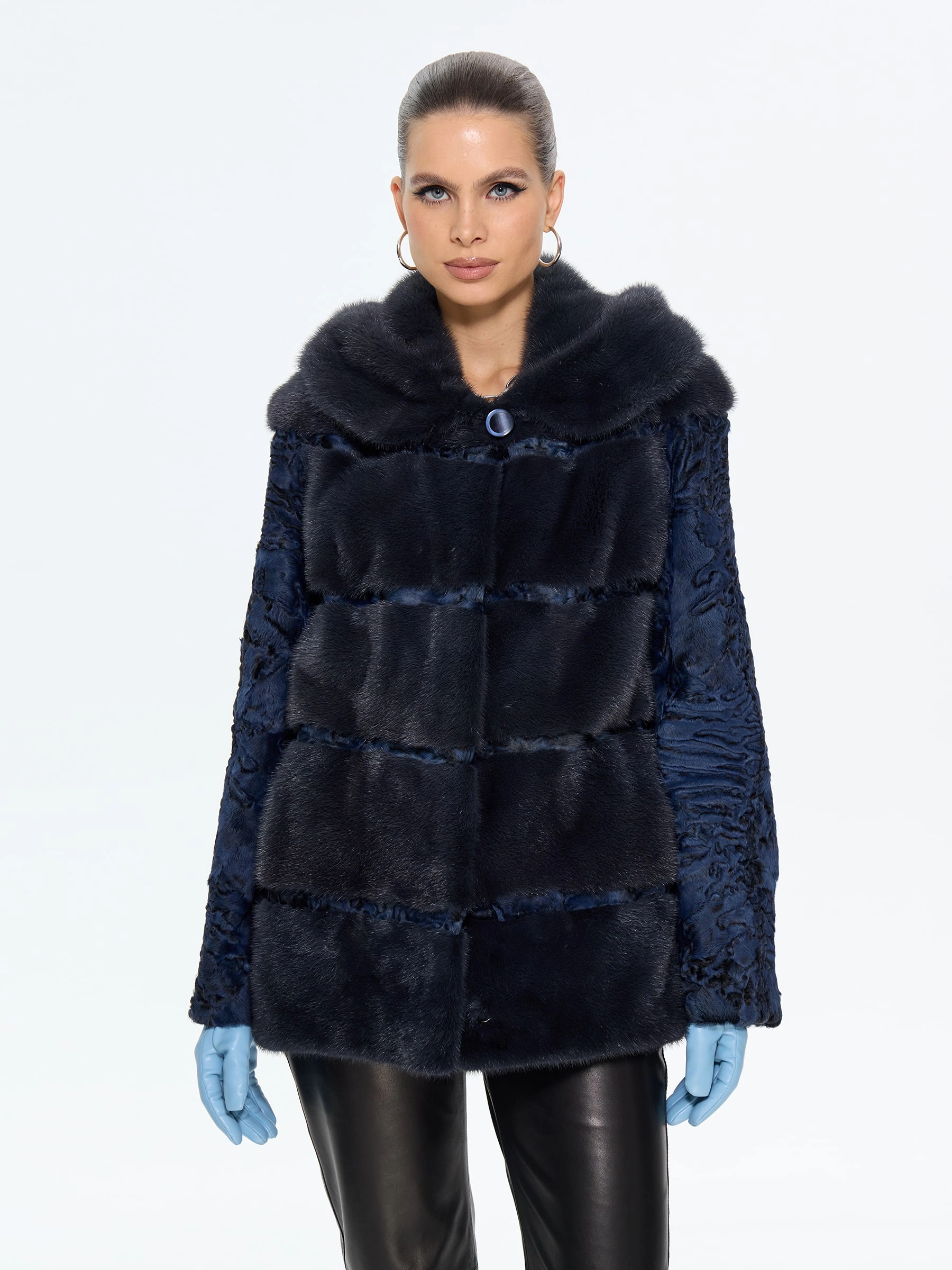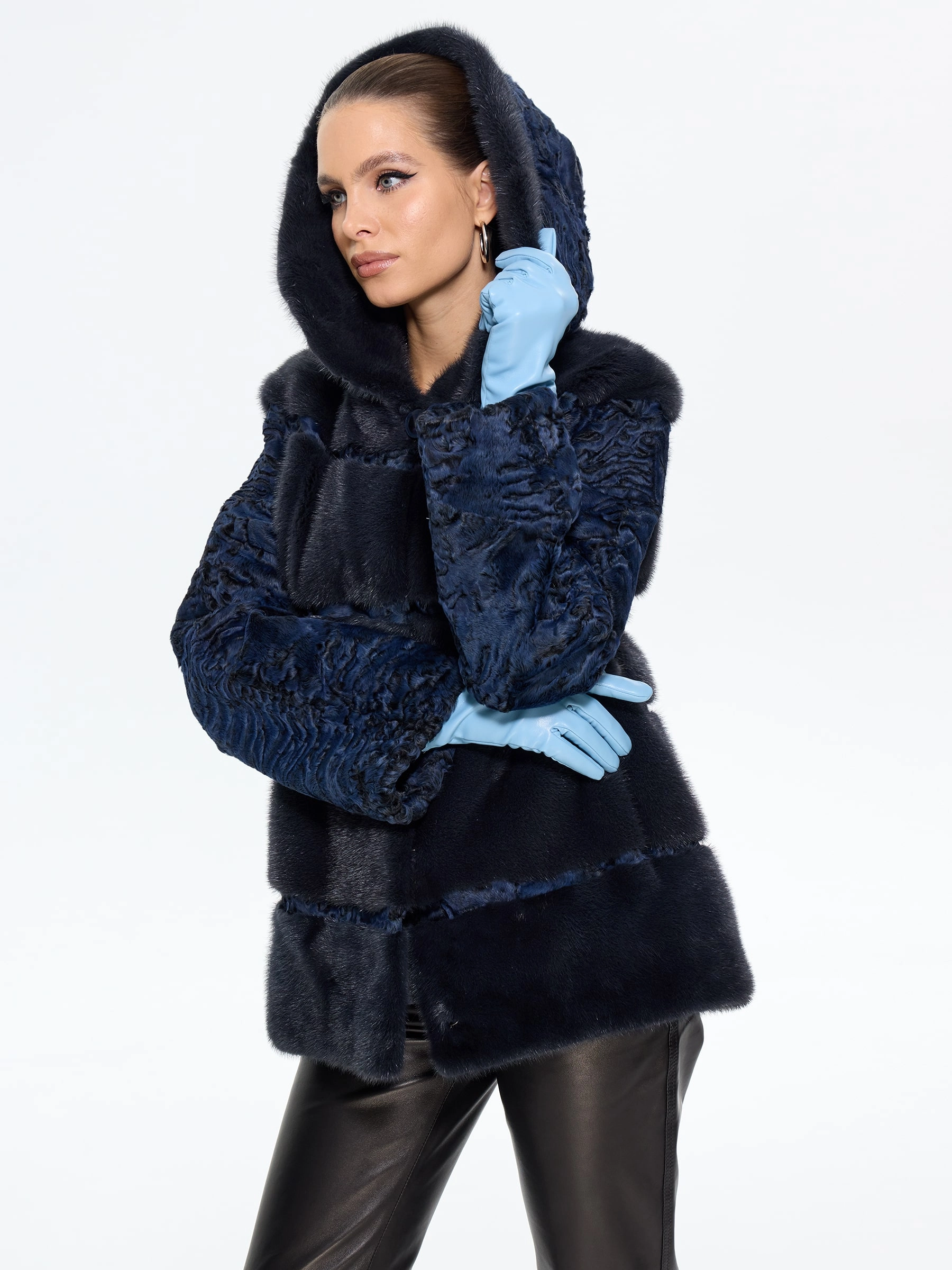 Женская шуба из меха норки с рукавами из синей каракульчи премиум-класса — воплощение изысканного дизайна и безупречного стиля для межсезонья: модель прямого классического силуэта длиной 70 см выполнили из благородного меха норки насыщенного синего цвета с густым шелковистым ворсом, а рукава из фактурной каракульчи с характерным мелкозавитковым рисунком создают выразительную игру текстур, подчеркивая эксклюзивность изделия. Элегантный капюшон из каракульчи, отделанный синей норкой, добавляет модели функциональности и статусности, надежно защищая от ветра и позволяя обойтись без головного убора; втачные рукава обеспечивают идеальную посадку по фигуре, а удобные клипсы и подкладка из смесовой ткани гарантируют комфорт при носке в весенне-осенний сезон. Совет стилиста: эта шуба в насыщенном синем цвете станет главным акцентом вашего гардероба — носите ее с кожаными ботильонами и узкими джинсами для создания дерзкого повседневного образа, с платьем-миди и сапогами-оверсайз для вечернего выхода или с классическими