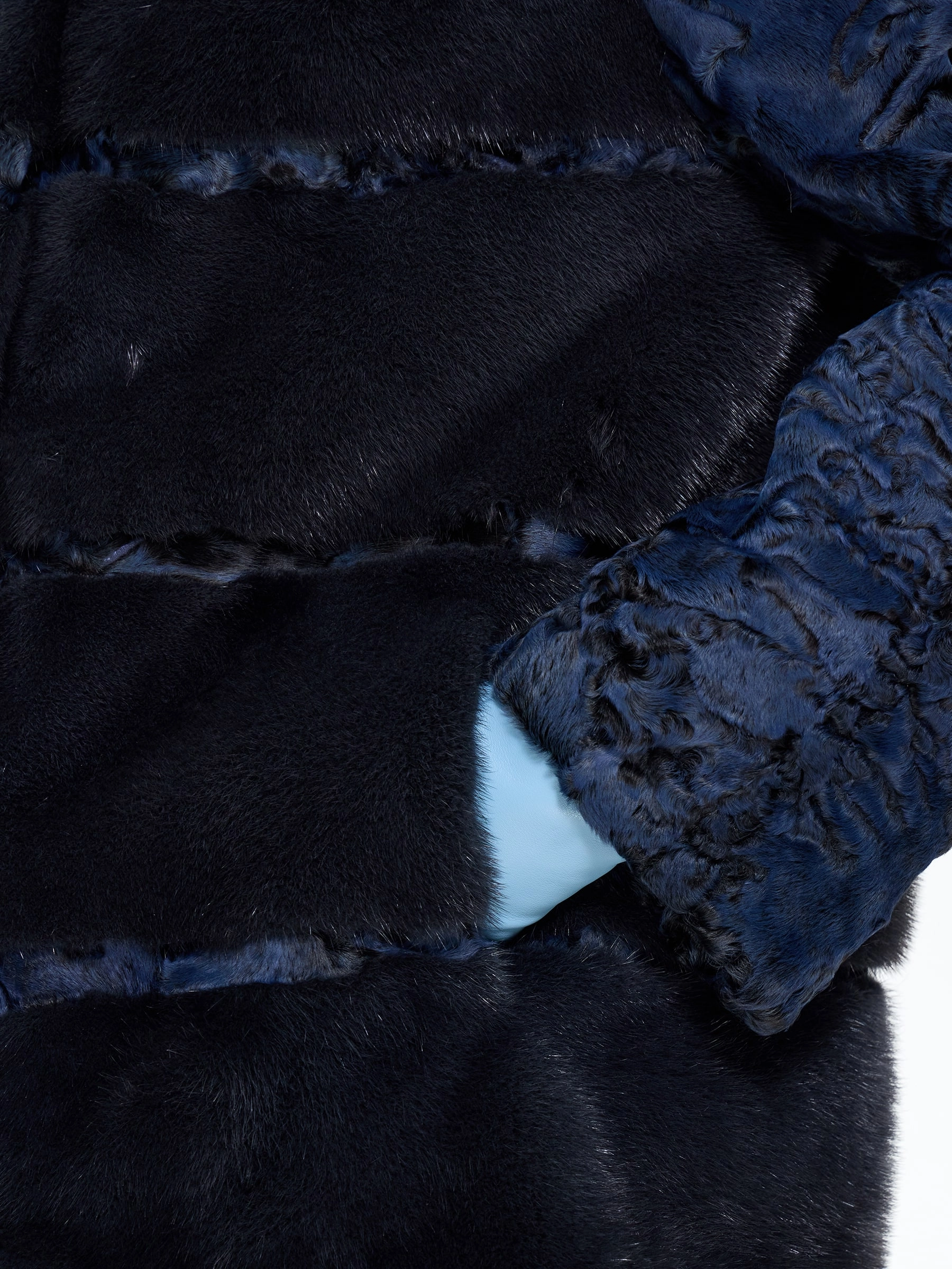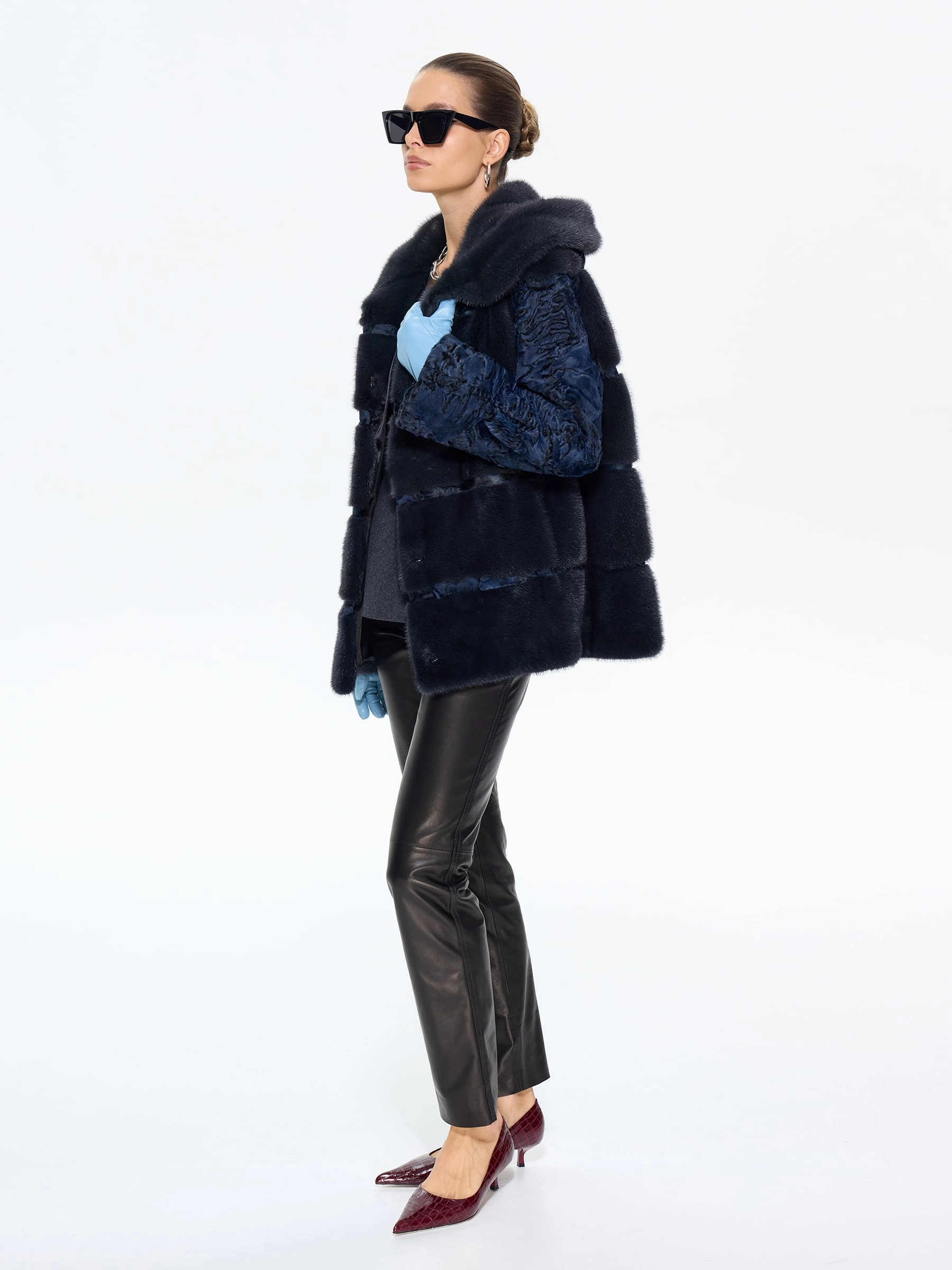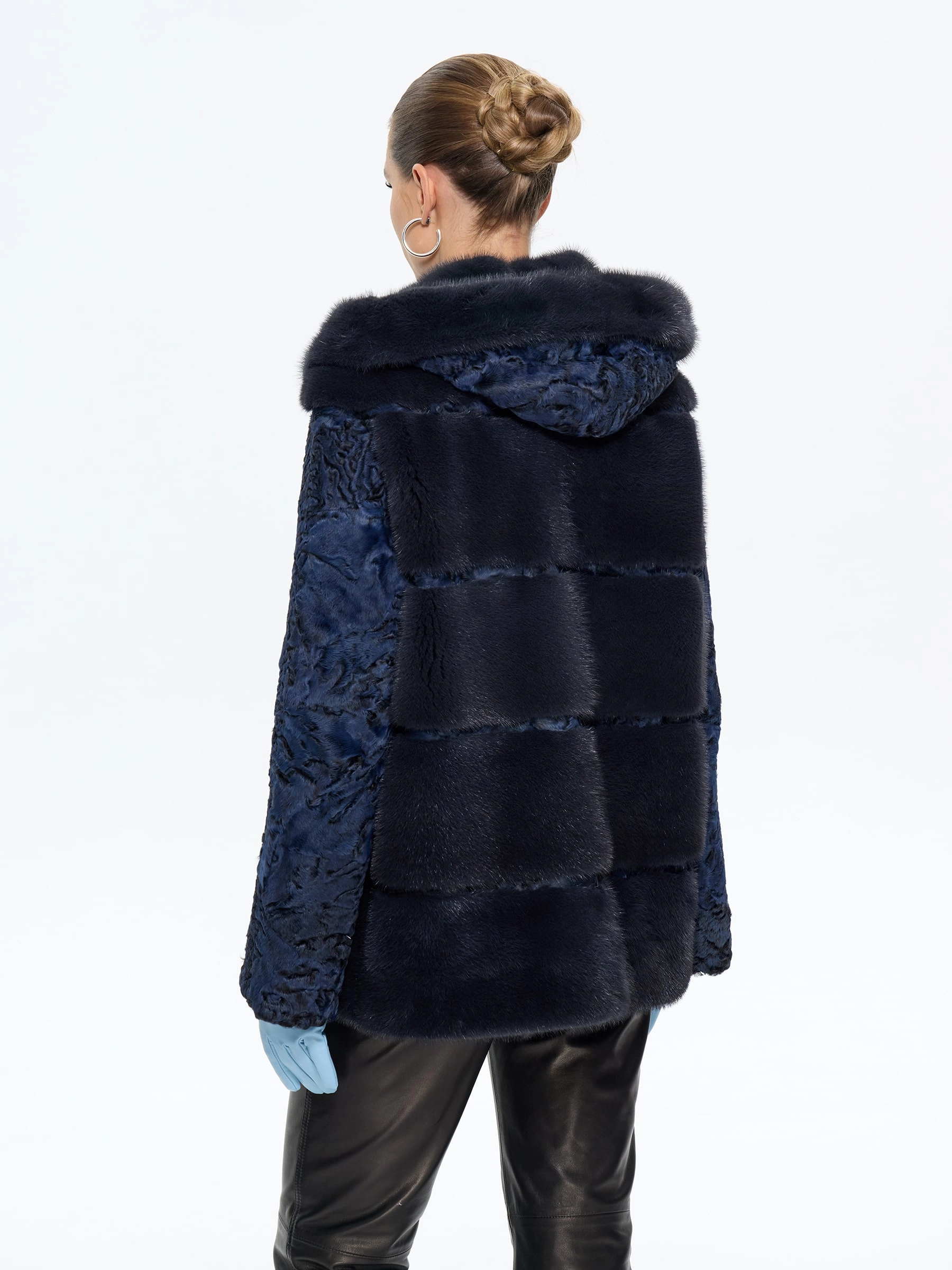 Женская шуба из меха норки с рукавами из синей каракульчи премиум-класса — воплощение изысканного дизайна и безупречного стиля для межсезонья: модель прямого классического силуэта длиной 70 см выполнили из благородного меха норки насыщенного синего цвета с густым шелковистым ворсом, а рукава из фактурной каракульчи с характерным мелкозавитковым рисунком создают выразительную игру текстур, подчеркивая эксклюзивность изделия. Элегантный капюшон из каракульчи, отделанный синей норкой, добавляет модели функциональности и статусности, надежно защищая от ветра и позволяя обойтись без головного убора; втачные рукава обеспечивают идеальную посадку по фигуре, а удобные клипсы и подкладка из смесовой ткани гарантируют комфорт при носке в весенне-осенний сезон. Совет стилиста: эта шуба в насыщенном синем цвете станет главным акцентом вашего гардероба — носите ее с кожаными ботильонами и узкими джинсами для создания дерзкого повседневного образа, с платьем-миди и сапогами-оверсайз для вечернего выхода или с классическими