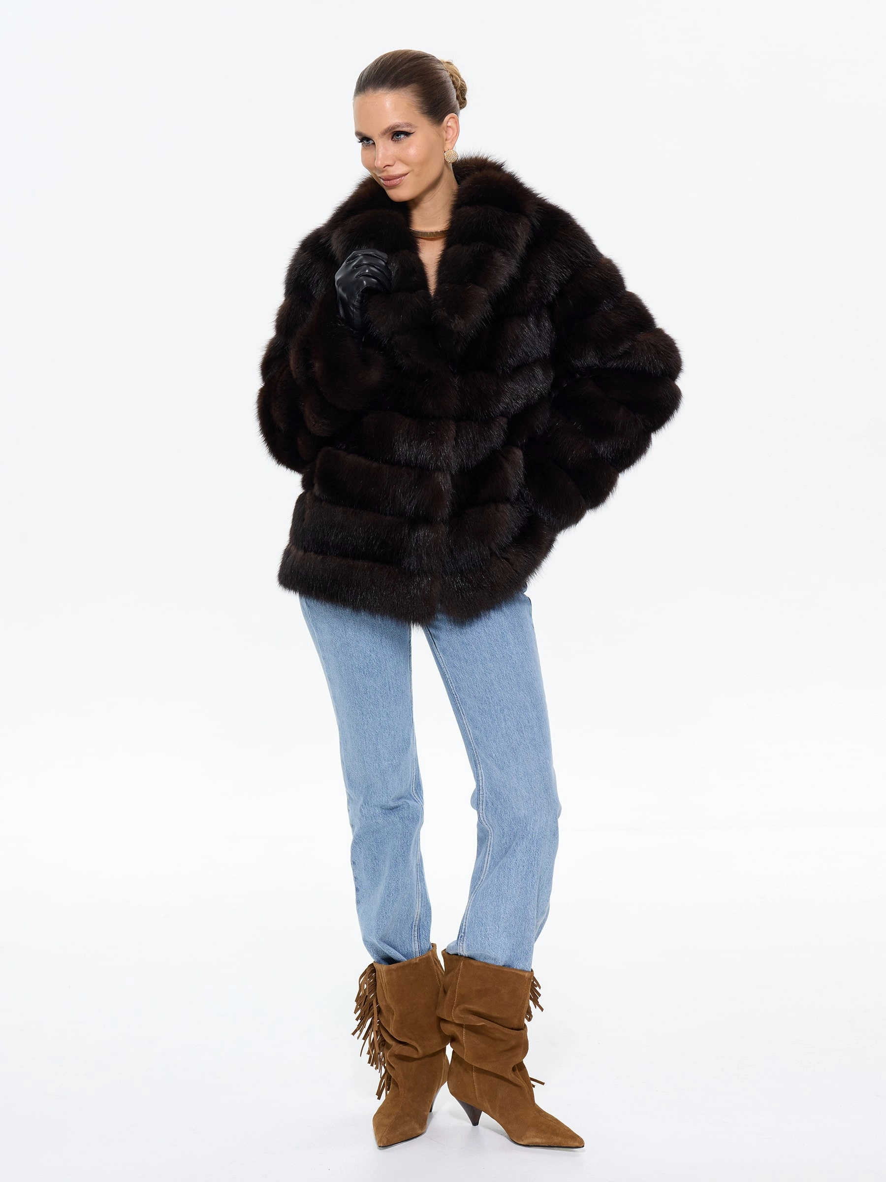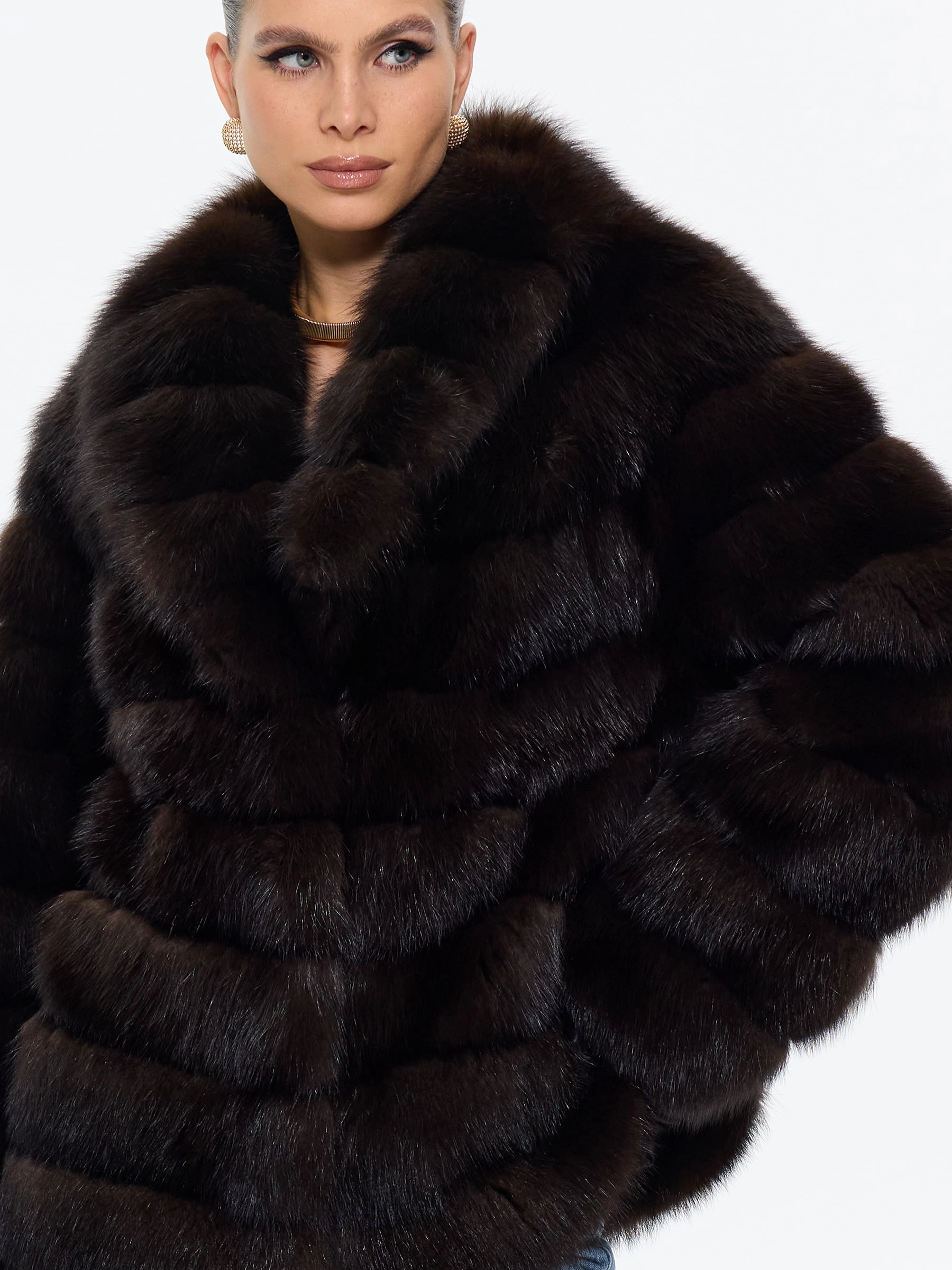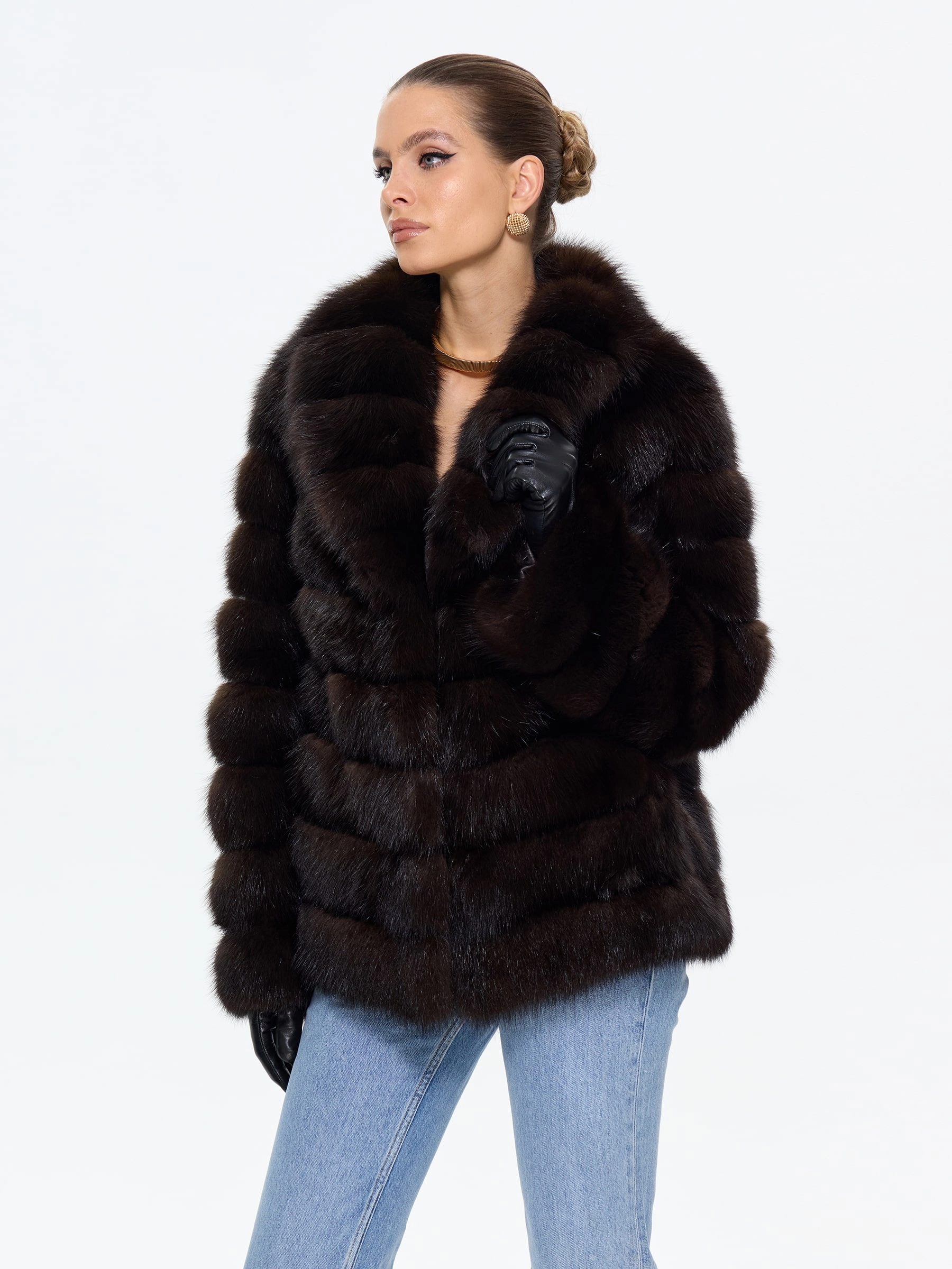 Элегантная шуба автоледи из меха куницы в глубоком темно-коричневом цвете сочетает в себе практичность и роскошь. Модель прямого силуэта длиной 75 см с мягким шалевидным воротником создает уют и завершенный образ. Совет от стилиста: эта шуба из меха куницы с воротником шикарного шалевидного кроя отлично смотрится с кожаными леггинсами и уггами для повседневного образа, а для вечернего выхода добавьте к ней узкие брюки, лакированные ботильоны и объемный клатч, подчеркивая ее классический шарм.