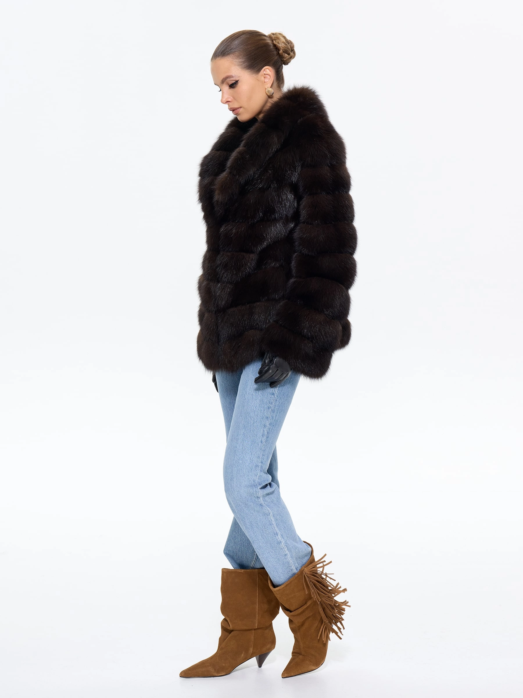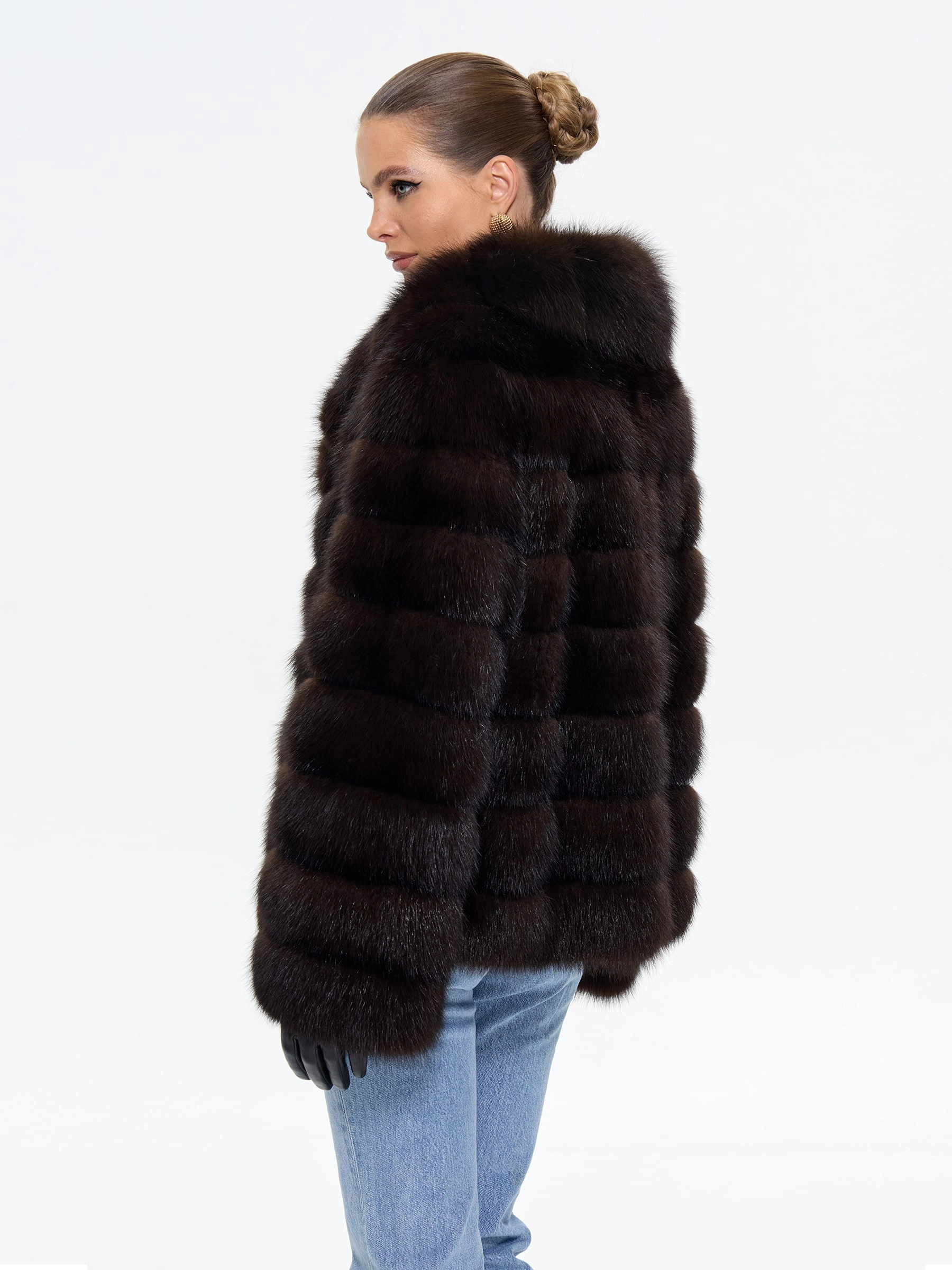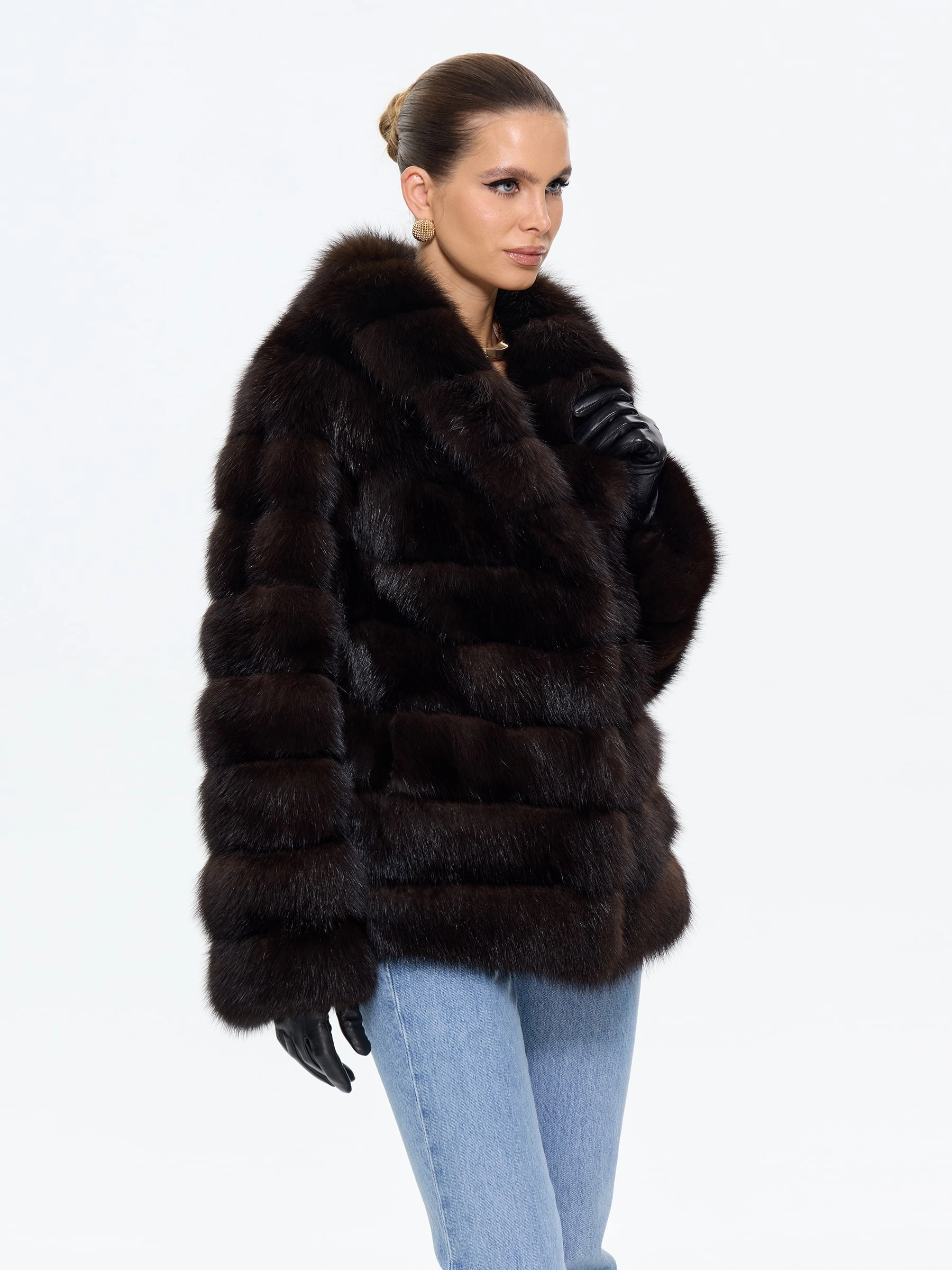 Элегантная шуба автоледи из меха куницы в глубоком темно-коричневом цвете сочетает в себе практичность и роскошь. Модель прямого силуэта длиной 75 см с мягким шалевидным воротником создает уют и завершенный образ. Совет от стилиста: эта шуба из меха куницы с воротником шикарного шалевидного кроя отлично смотрится с кожаными леггинсами и уггами для повседневного образа, а для вечернего выхода добавьте к ней узкие брюки, лакированные ботильоны и объемный клатч, подчеркивая ее классический шарм.