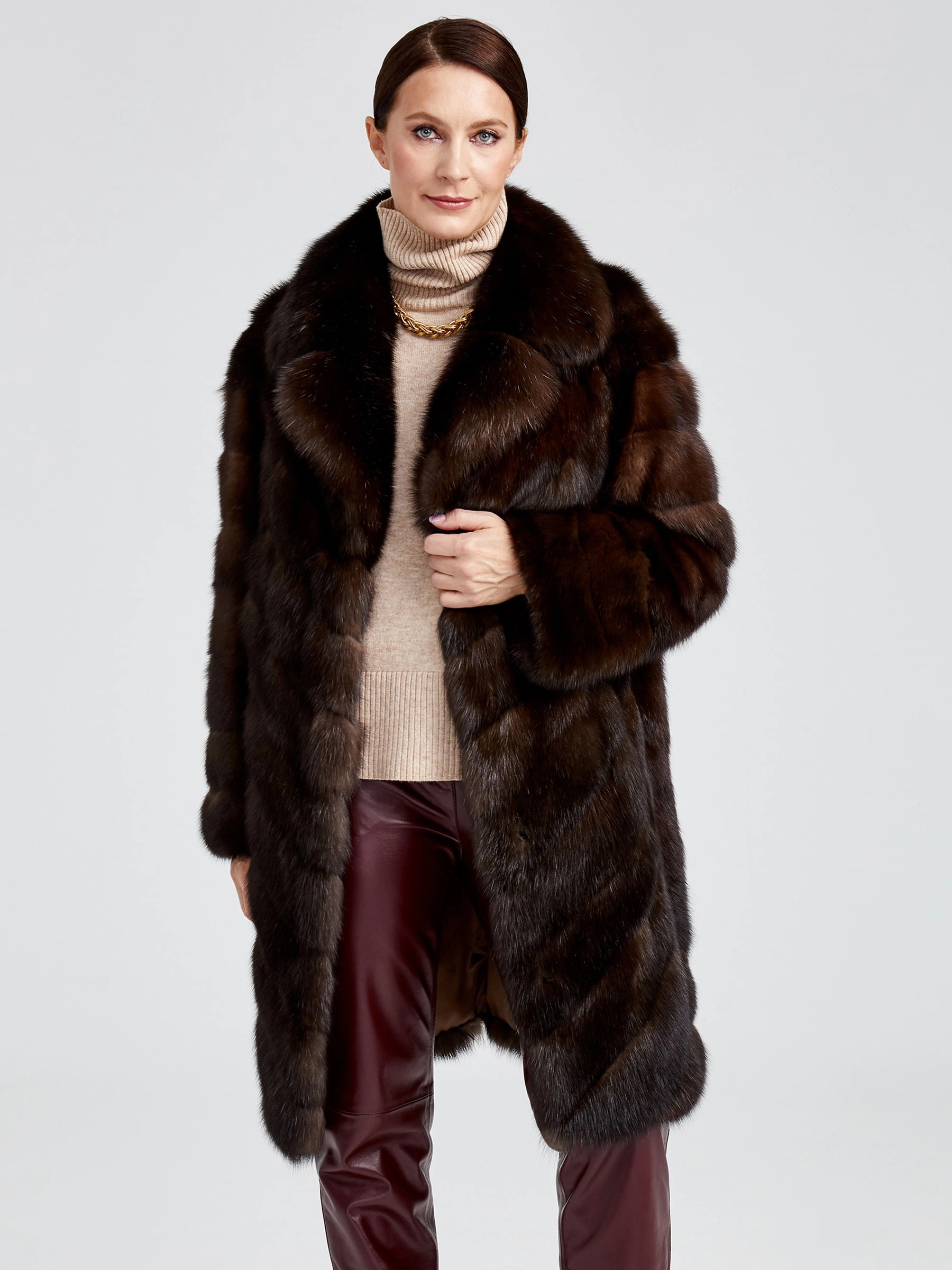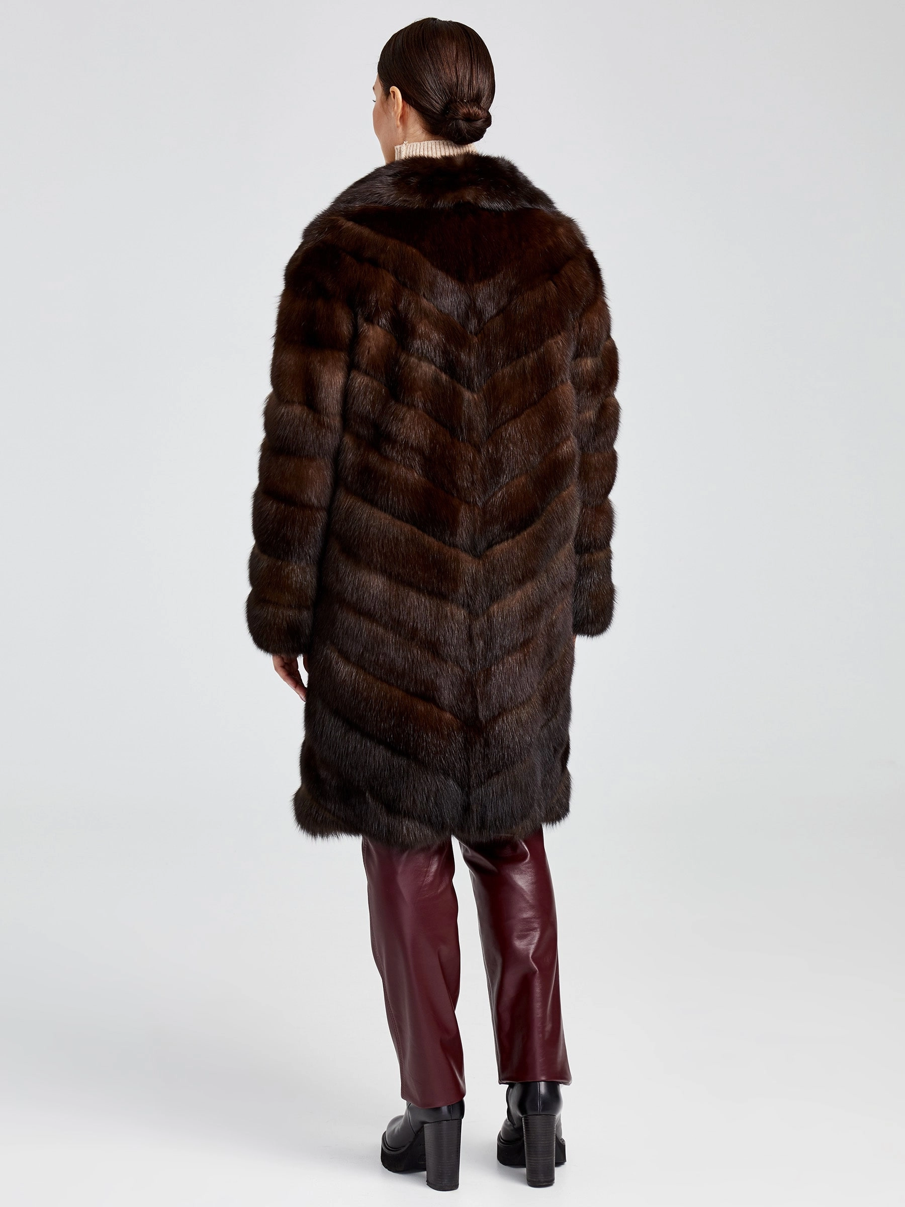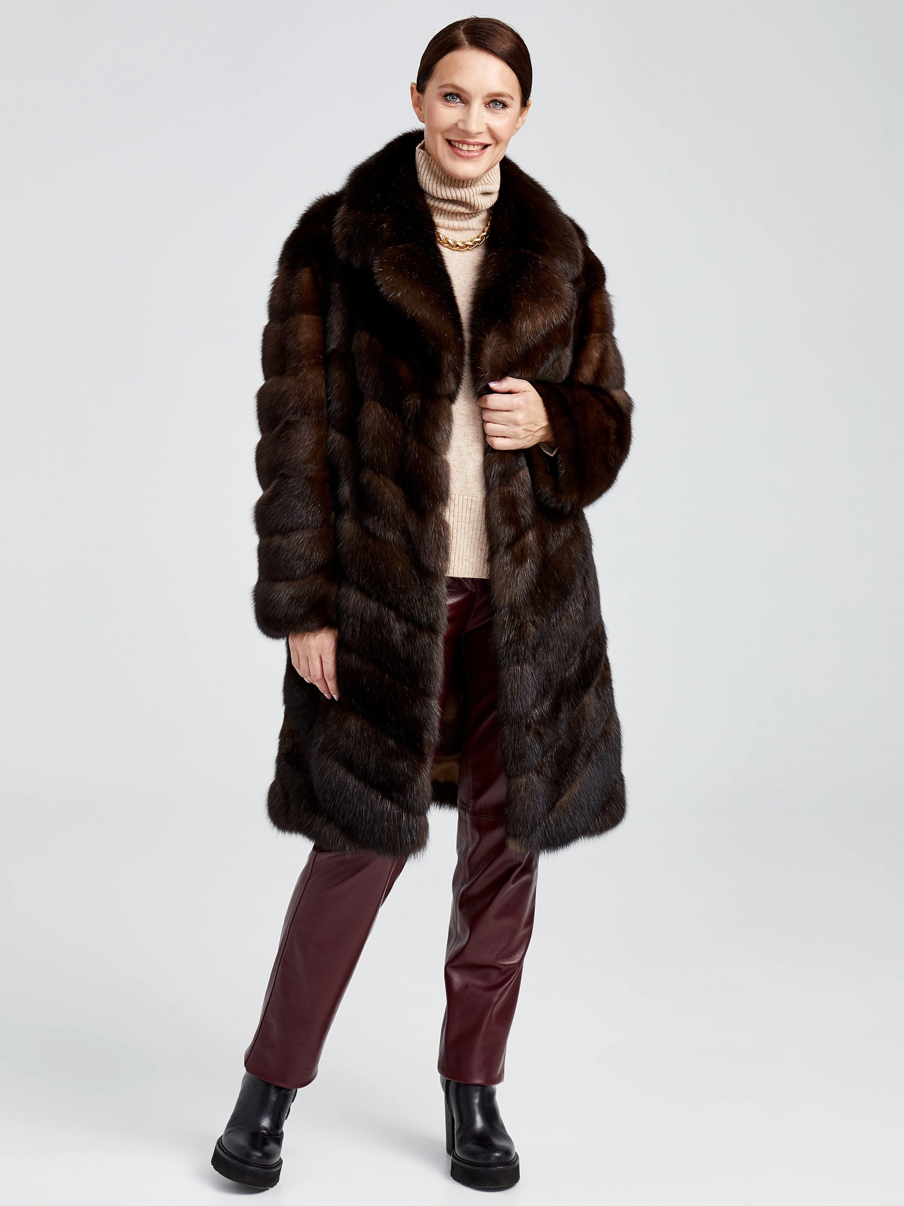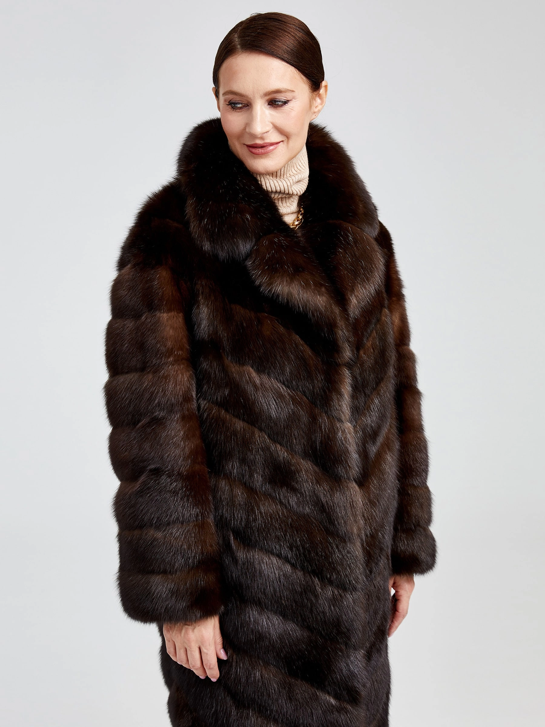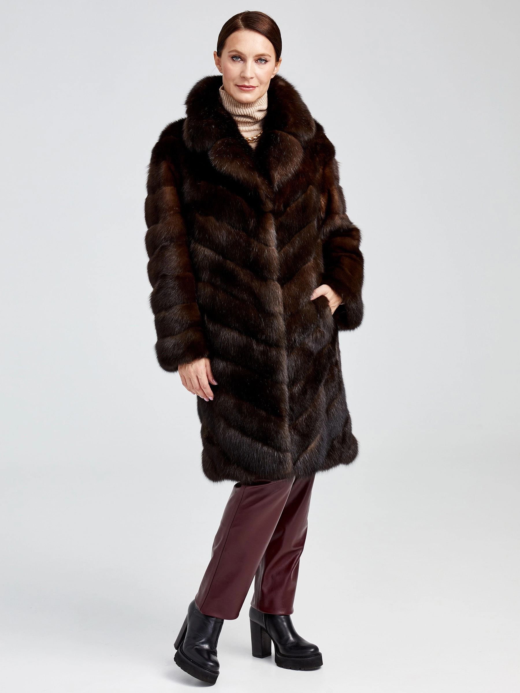 Изысканное пальто длиной 90 см из меха соболя с диагональной раскладкой воплощает премиальное качество и безупречный вкус. Его густой, шелковистый подшёрсток надёжно сохраняет тепло, а элегантный английский воротник и застёжка на клипсах создают выразительный силуэт. Невероятная лёгкость и комфорт модели делают её идеальной для создания стильных образов: сочетайте пальто с кожаными брюками и сапогами-ботфортами для вечернего выхода или с платьем-миди и лаковыми лодочками — этот предмет гардероба подчеркнёт вашу индивидуальность и безупречный стиль.