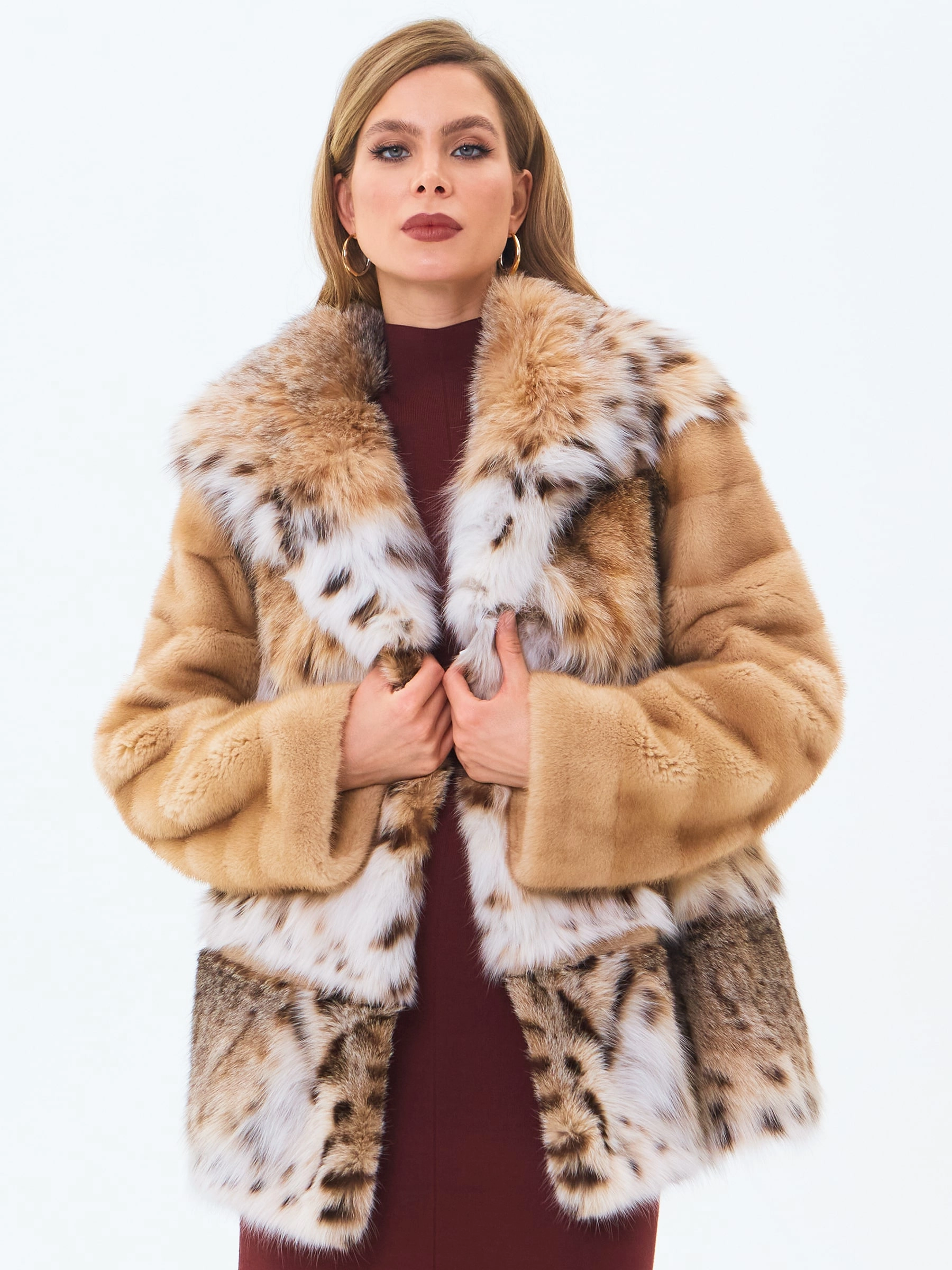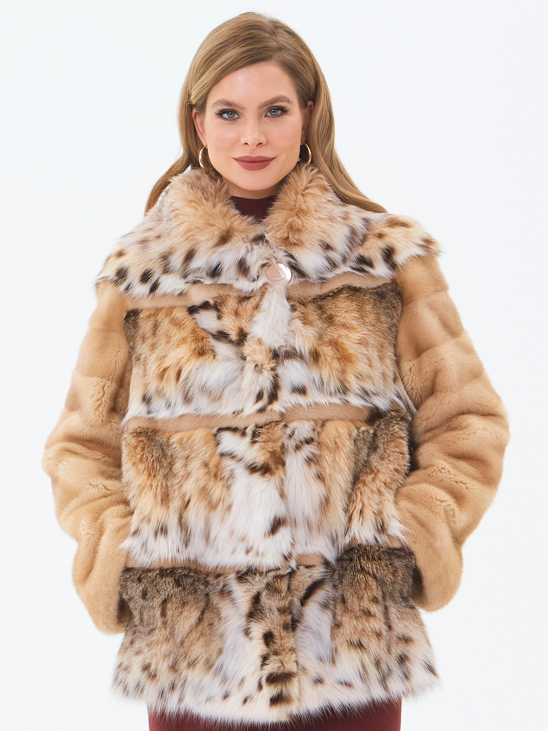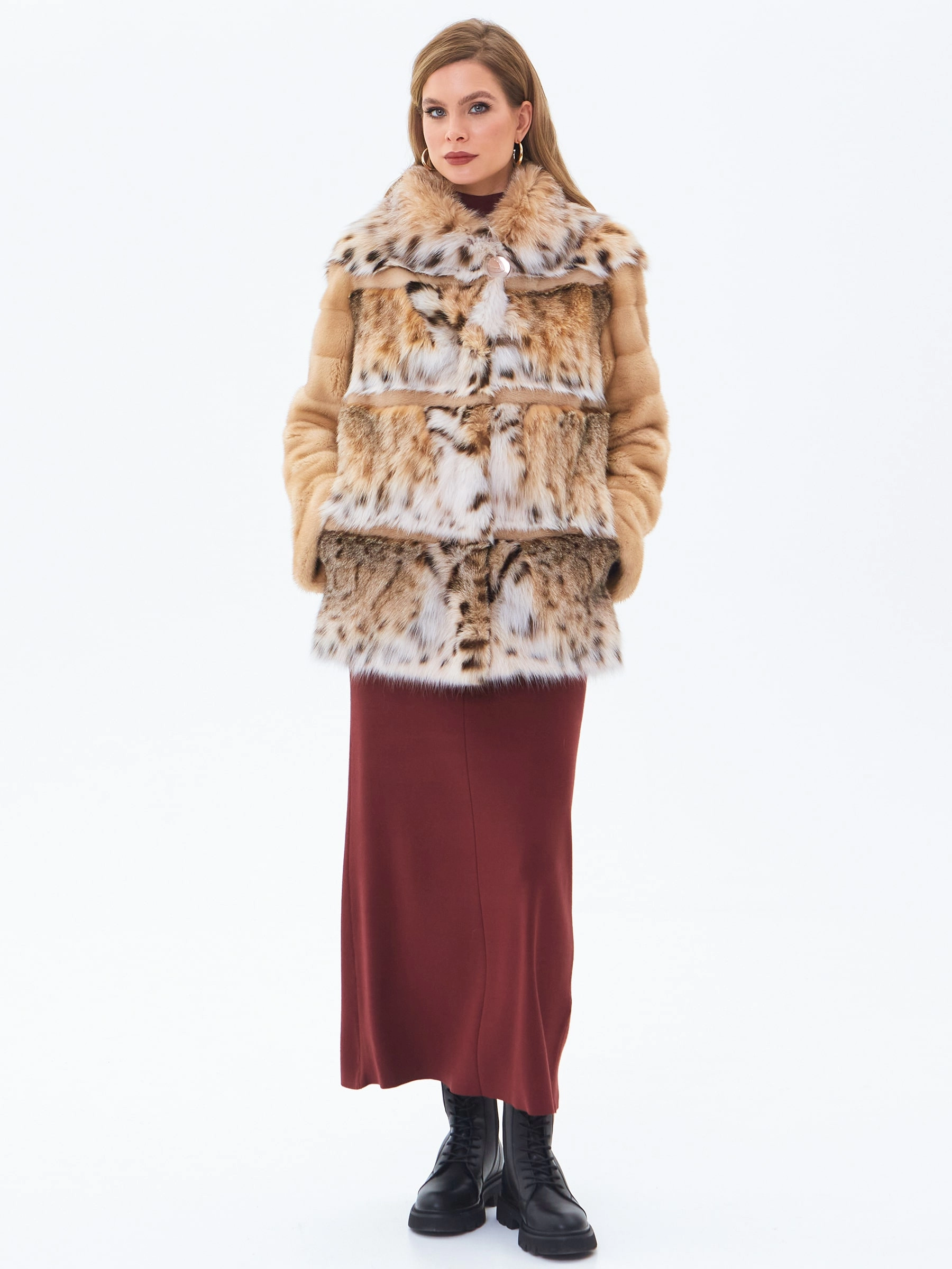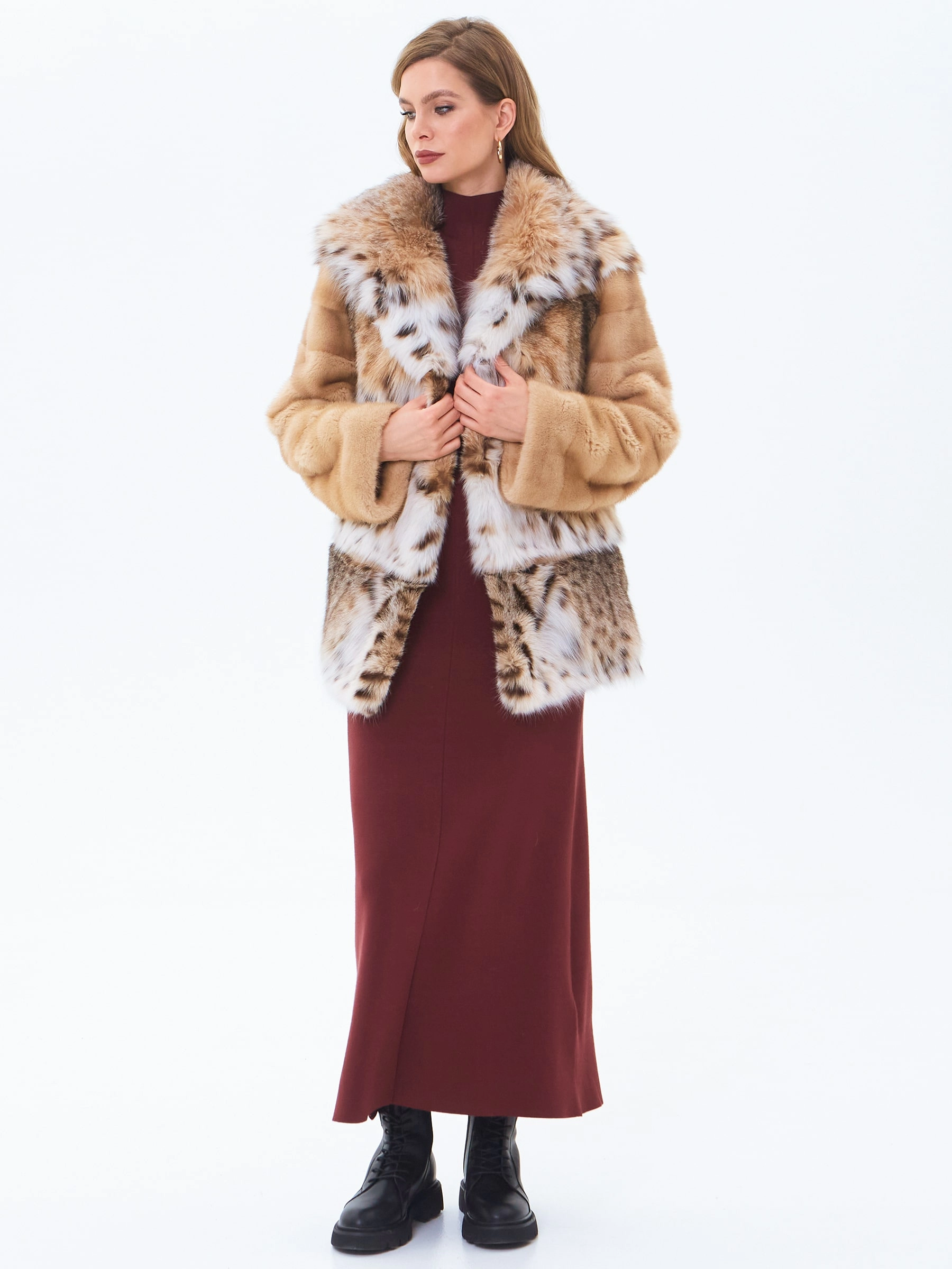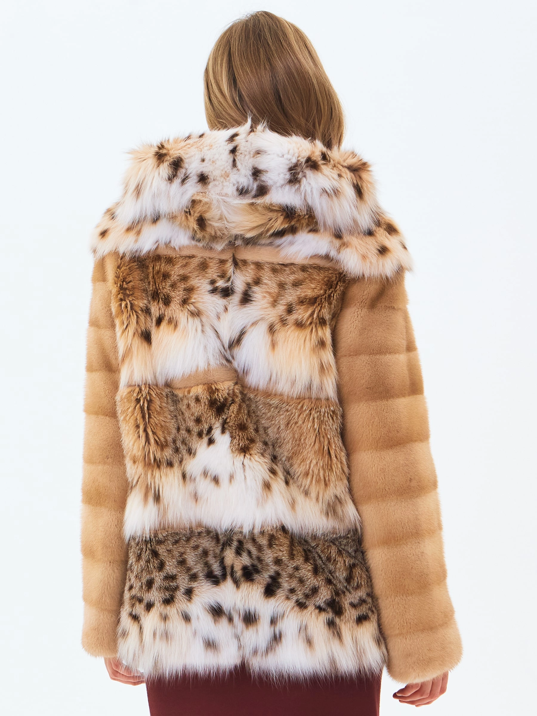 Короткую шубу с глубоким объемным капюшоном выполнили из нежного меха норки в комбинации с мехом рысевидной кошки. Изделие прямого кроя с втачным рукавом и двумя врезными боковыми карманами застегивается металлическими клипсами.