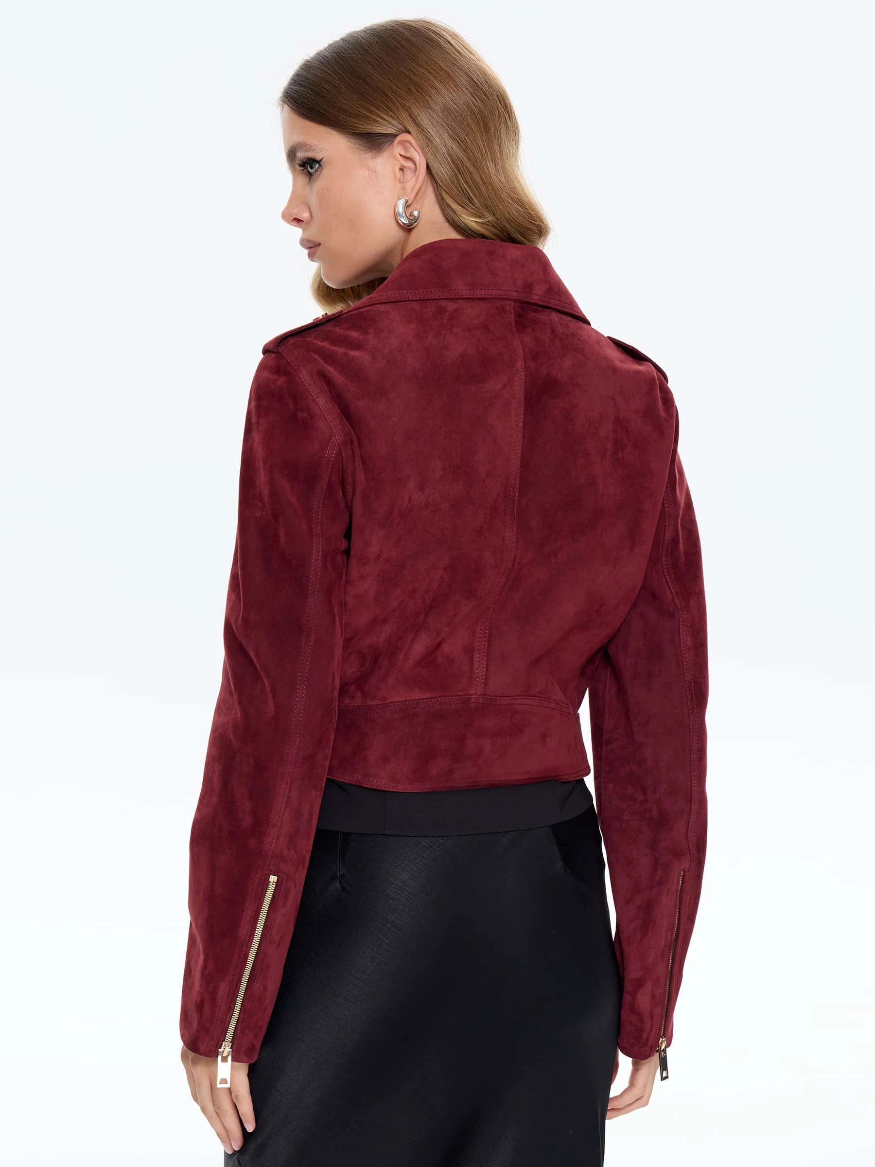 Женская замшевая куртка косуха с поясом премиум класса 3080з, бордовая, размер 42, артикул 24740