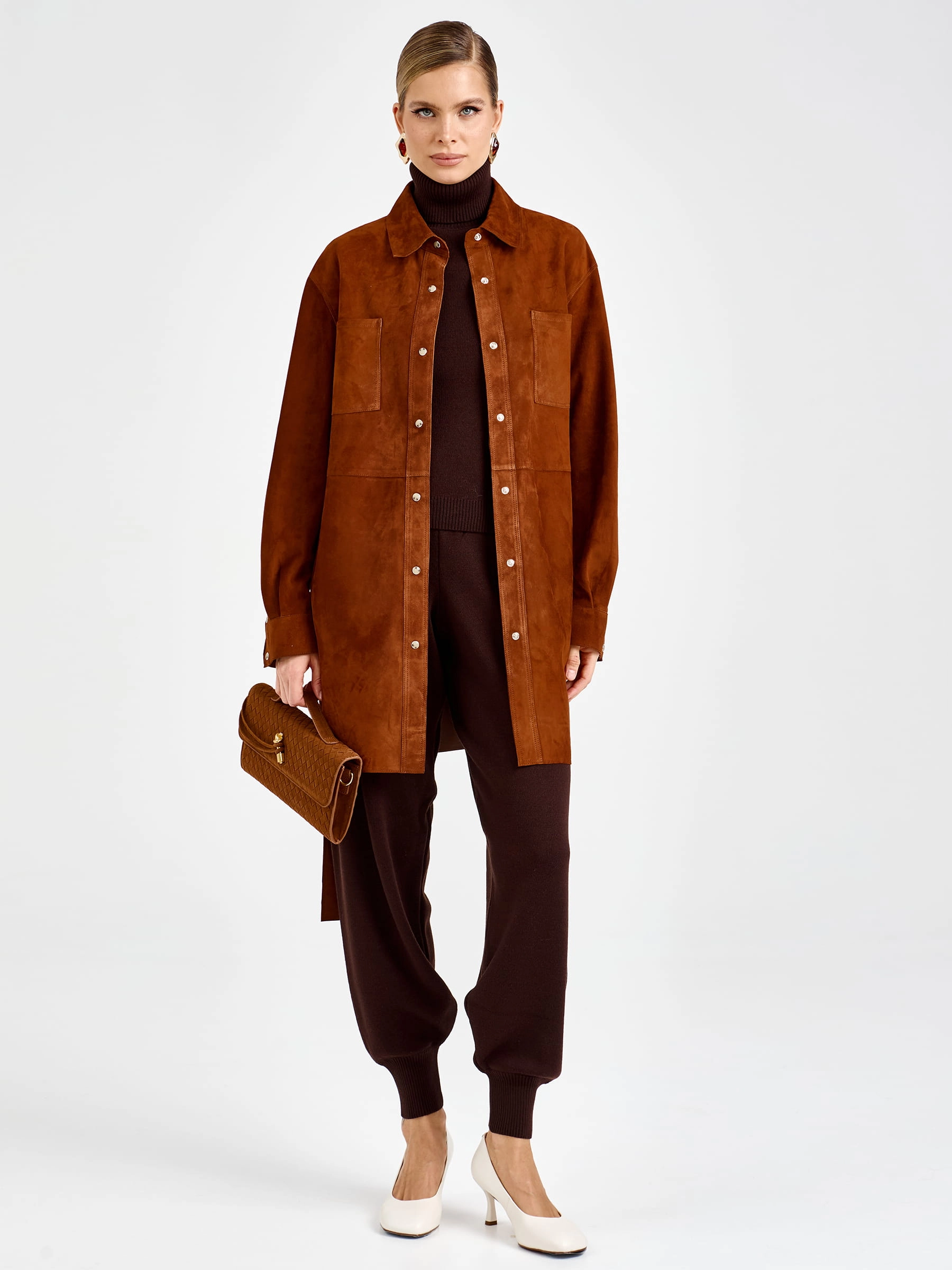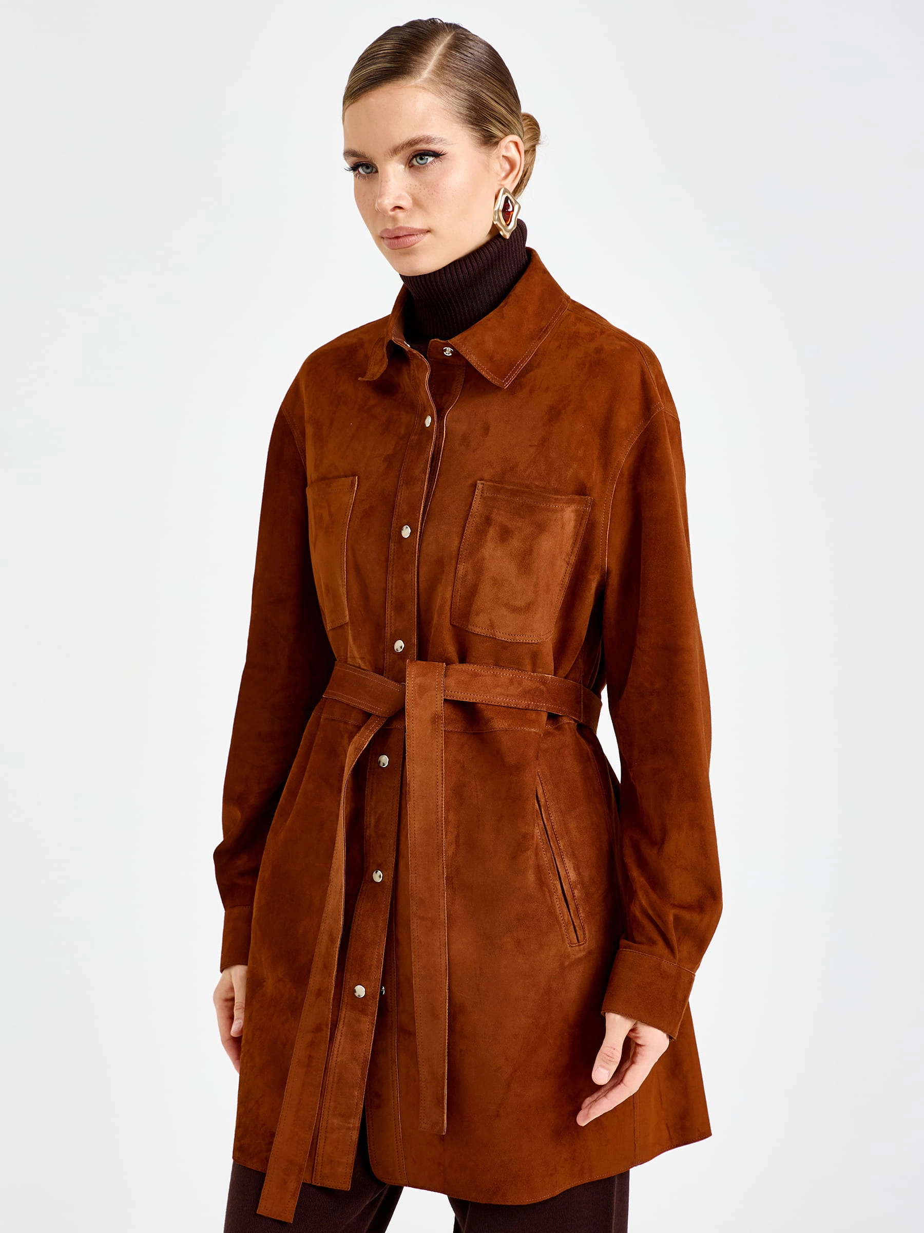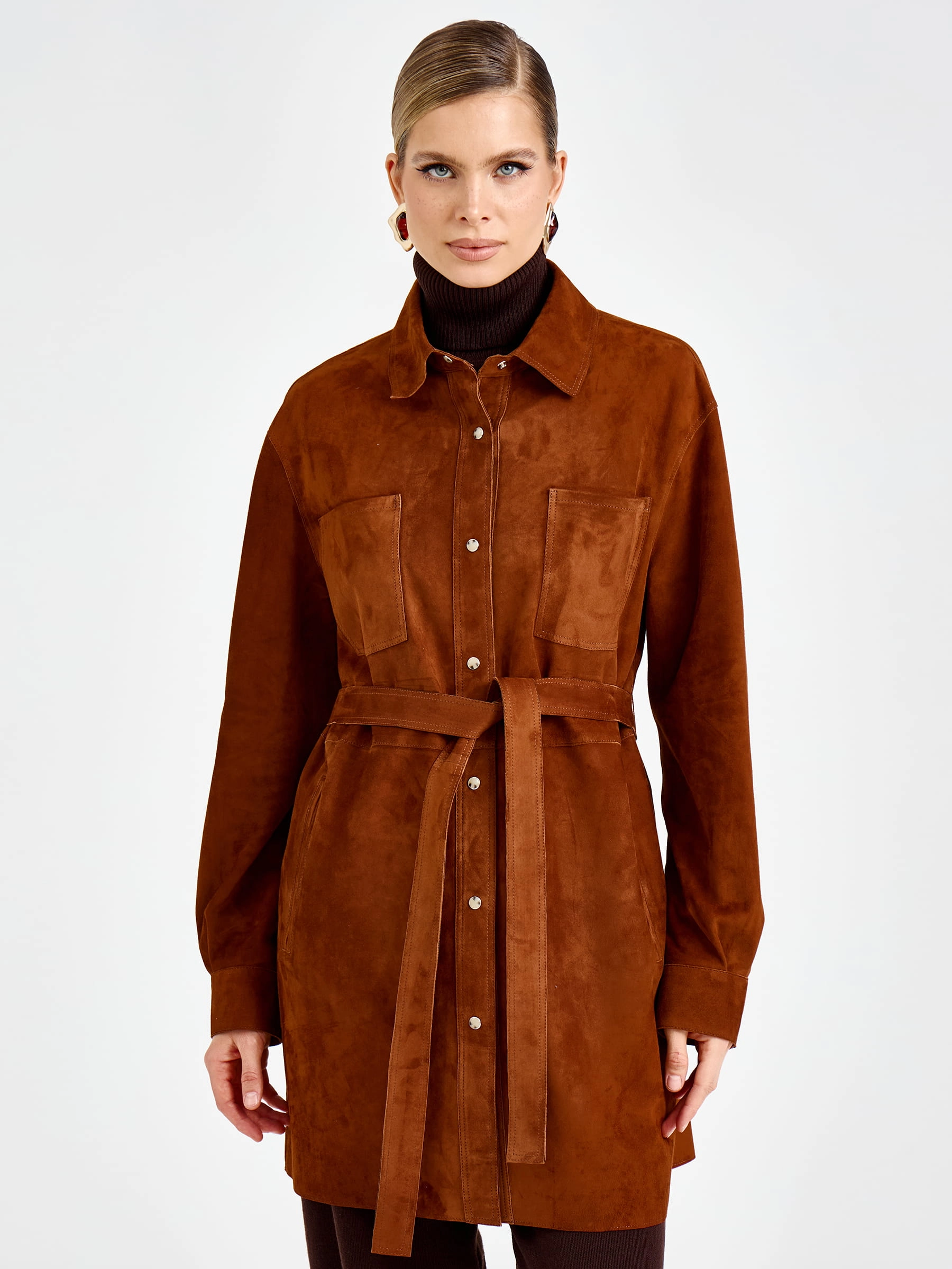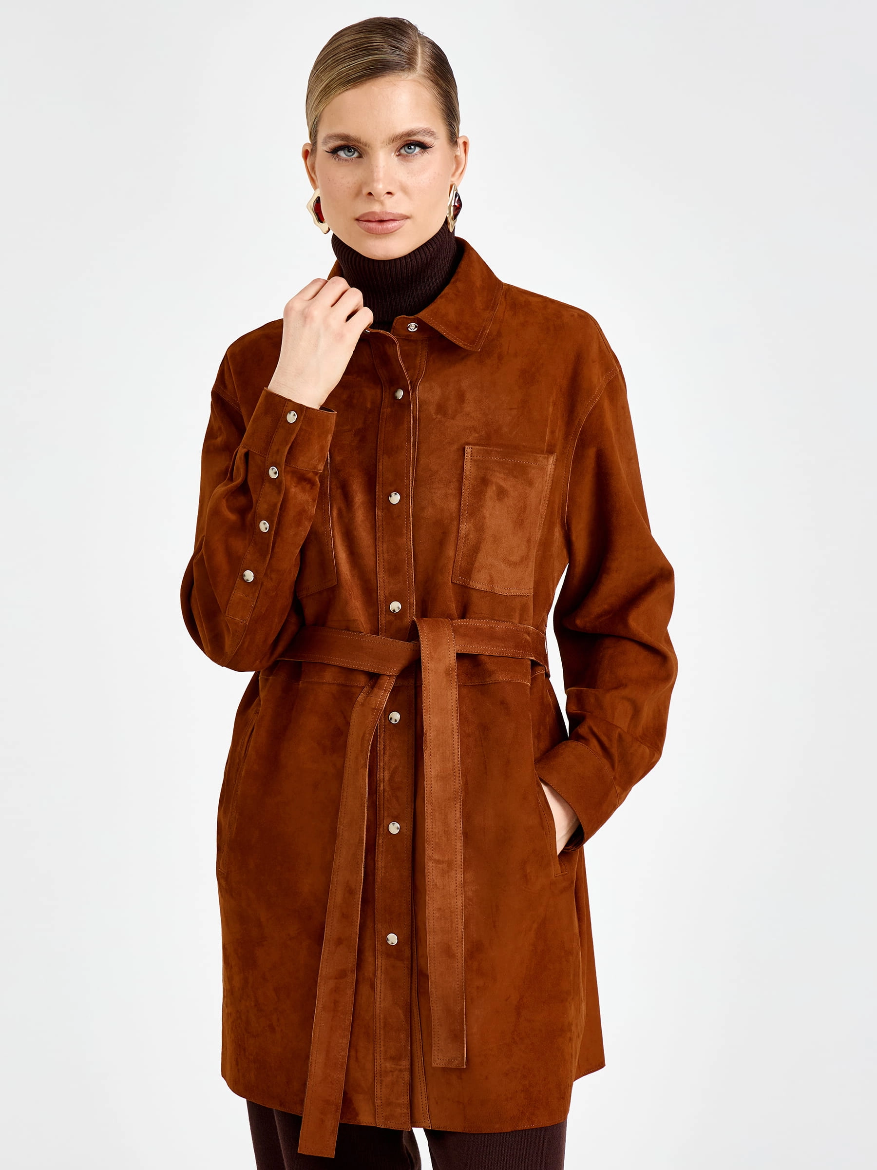 Легкая удлиненная женская куртка прямого кроя из натуральной замши премиум-класса длиной 86 см с удобным спущенным рукавом: отложной воротник, два нагрудных и два врезных боковых кармана обеспечивают функциональность, широкий манжет и само изделие застегиваются на кнопки, а подчеркнуть талию позволяет длинный пояс в комплекте — идеальный баланс свободы и элегантности!