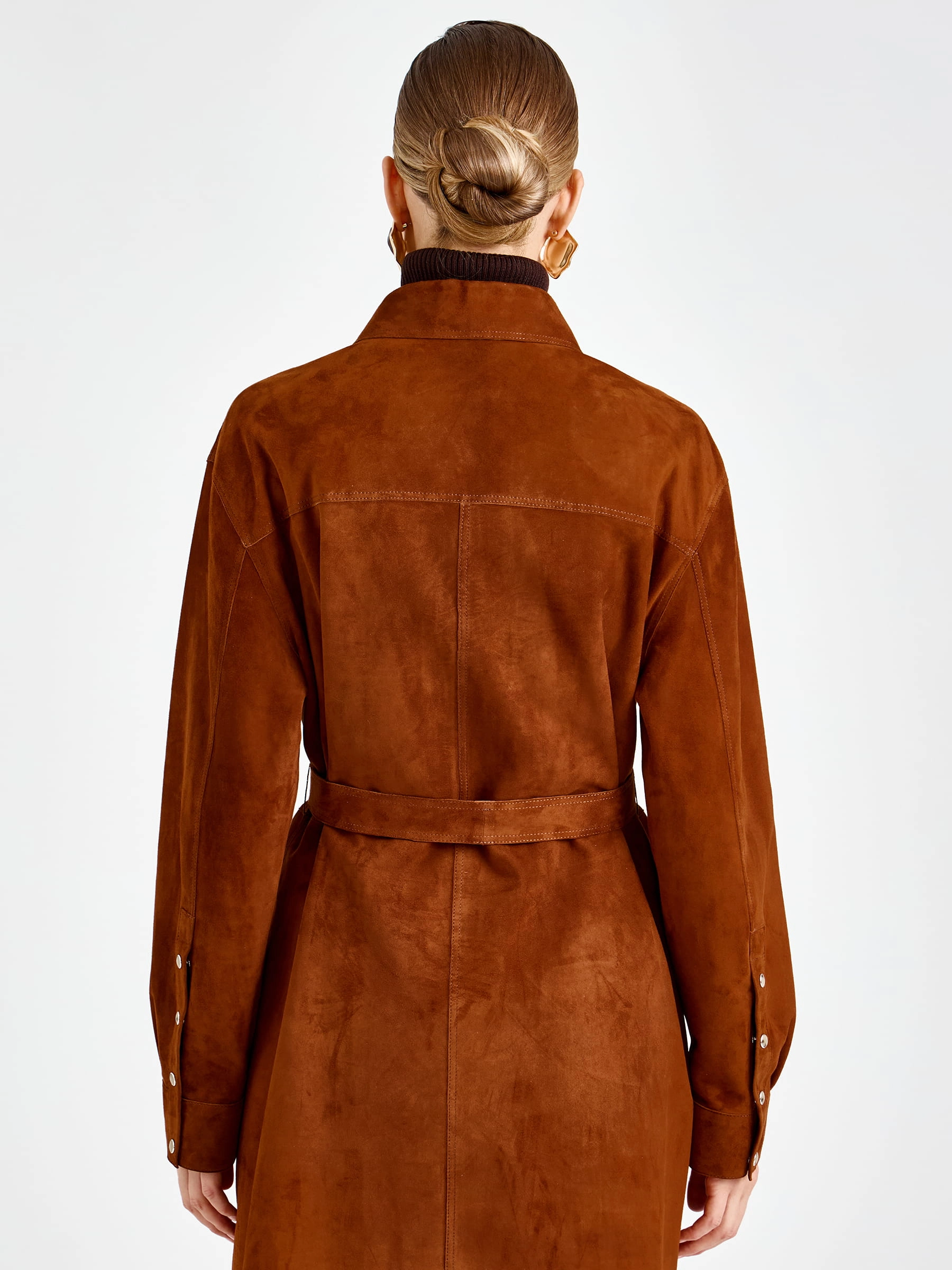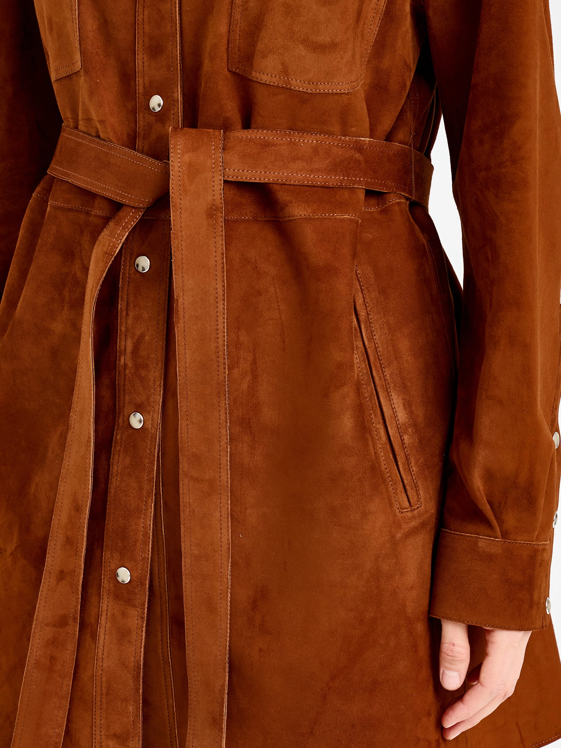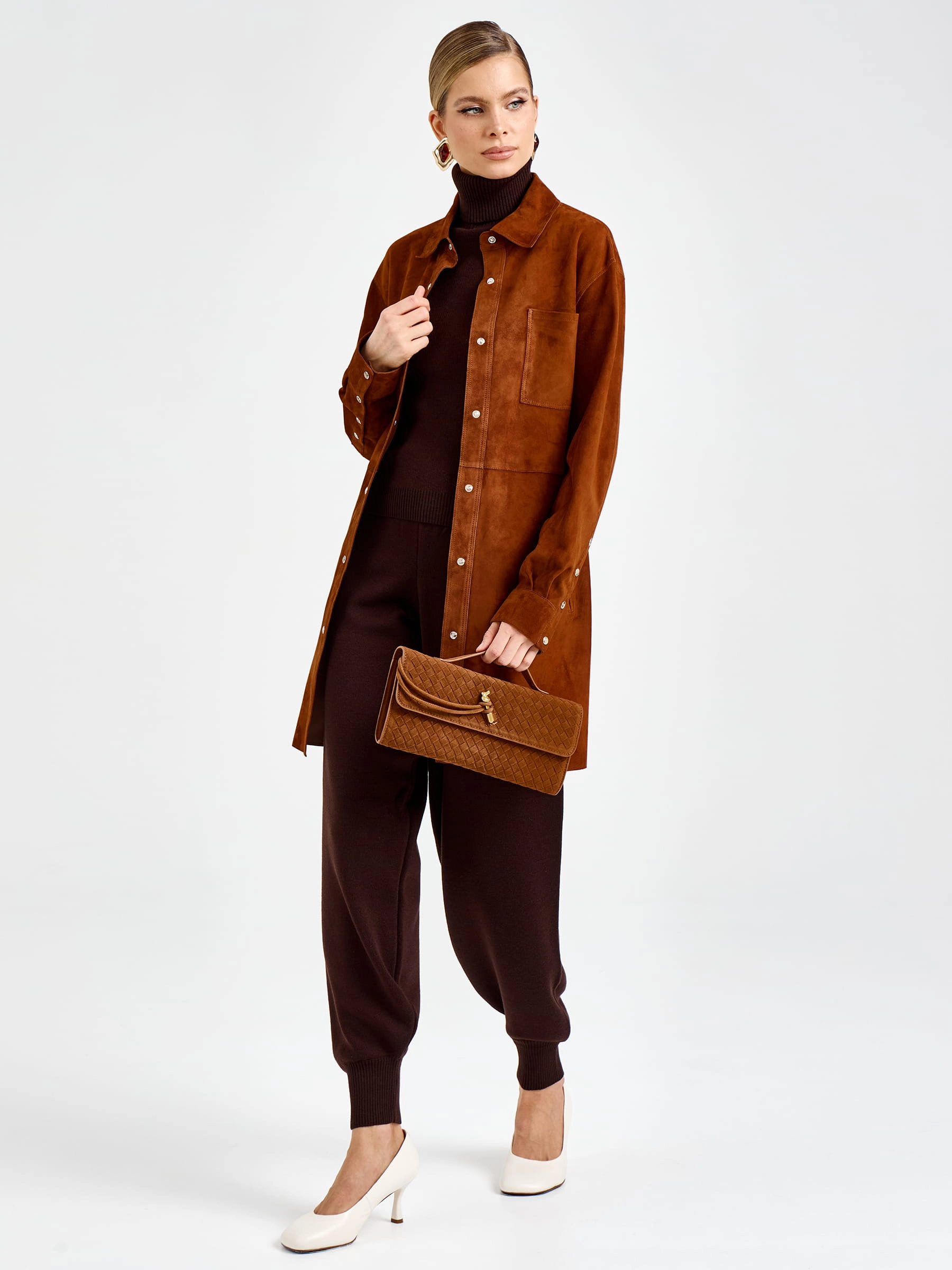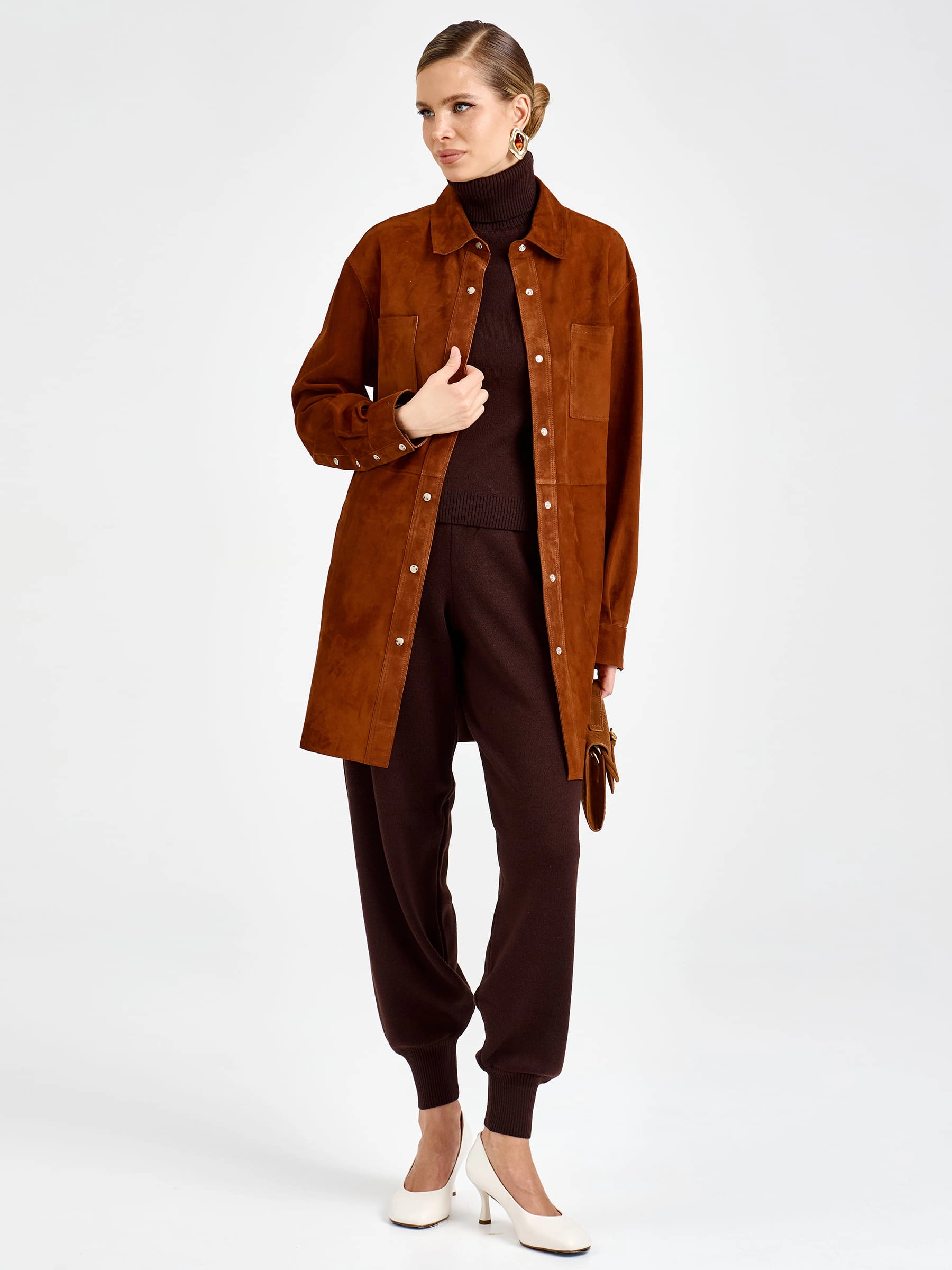 Легкая удлиненная женская куртка прямого кроя из натуральной замши премиум-класса длиной 86 см с удобным спущенным рукавом: отложной воротник, два нагрудных и два врезных боковых кармана обеспечивают функциональность, широкий манжет и само изделие застегиваются на кнопки, а подчеркнуть талию позволяет длинный пояс в комплекте — идеальный баланс свободы и элегантности!
