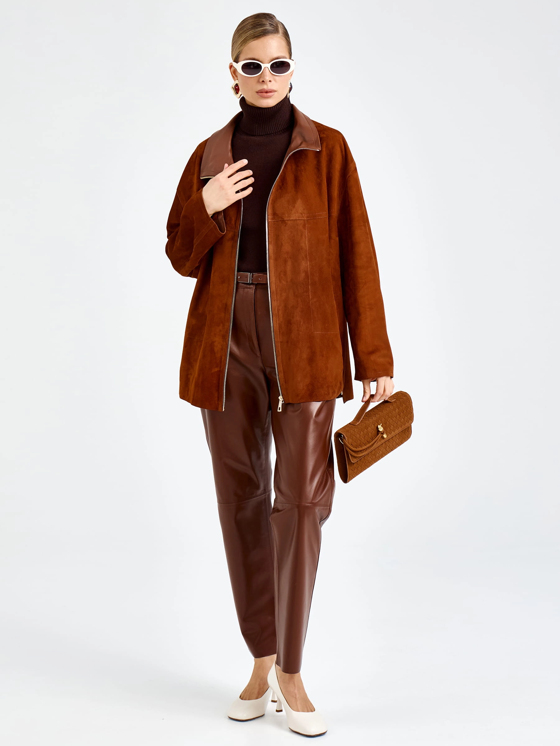 Эксклюзивные женские брюки свободного кроя из натуральной кожи в цвете виски - сочетание инновационных технологий. Прямой крой длиной 105 см с едва заметным расширением к низу для создания идеальной вертикали. Модель отличается авторской технологией обработки кожи, сохраняющей мягкость и пластичность без заломов, эргономичными карманами с системой скрытых швов для незаметной вместительности, эксклюзивной подкладкой из вискозы, а также усовершенствованной застежкой с двойной молнией и магнитной фиксацией для идеального прилегания. Эти брюки станут инвестицией в безупречный стиль, легко сочетаясь с объемными свитерами, строгими пиджаками или кожаными косухами для создания разнообразных образов.
