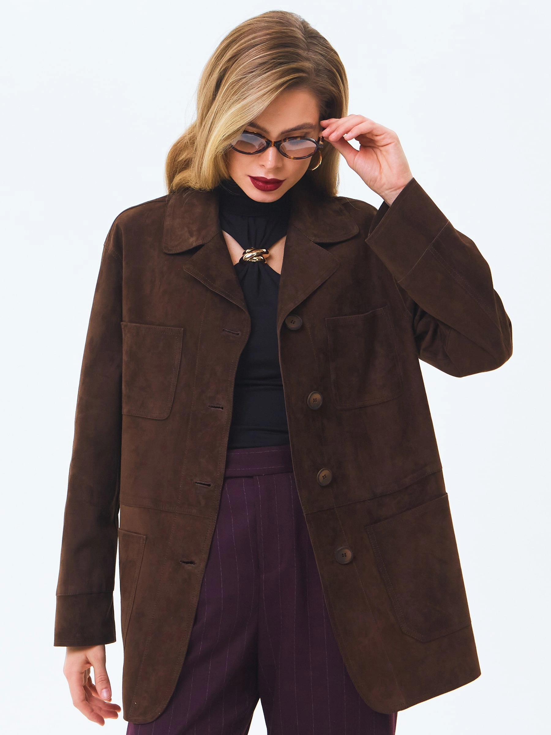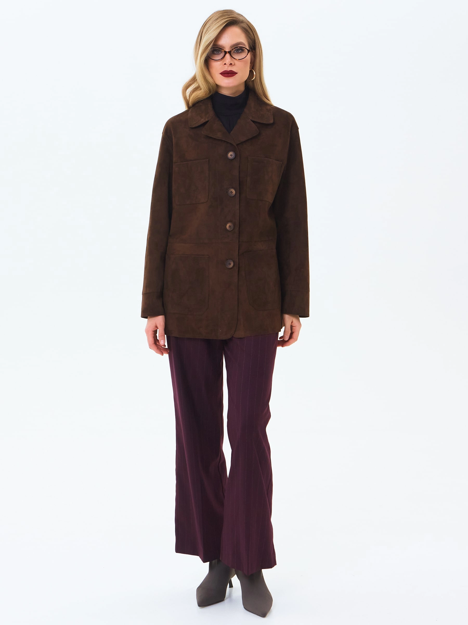 Пиджак с английским воротником выполнили из замши премиального класса. Прямой силуэт изделия комфортно садится по фигуре, не ограничивая движения, застегивается на пуговицы. Модель дополнили четырьмя накладными карманами.