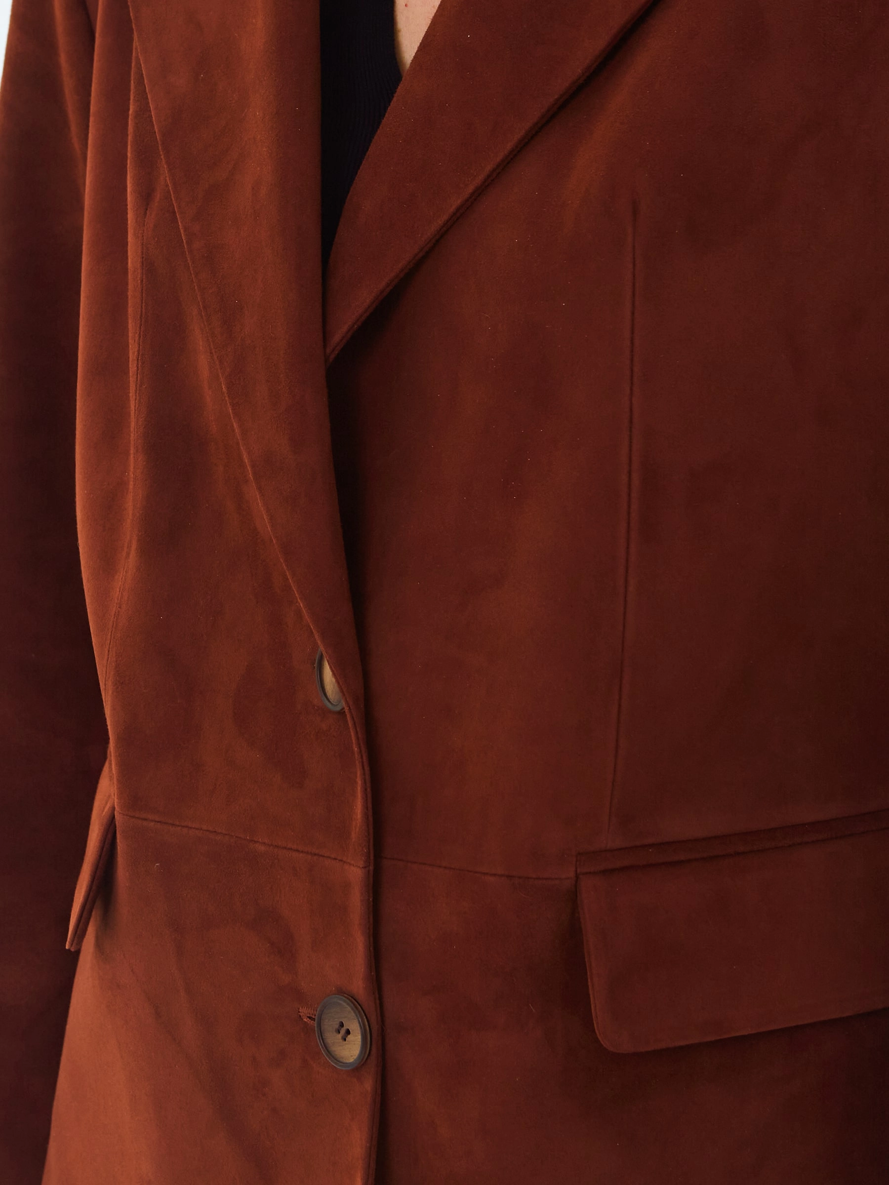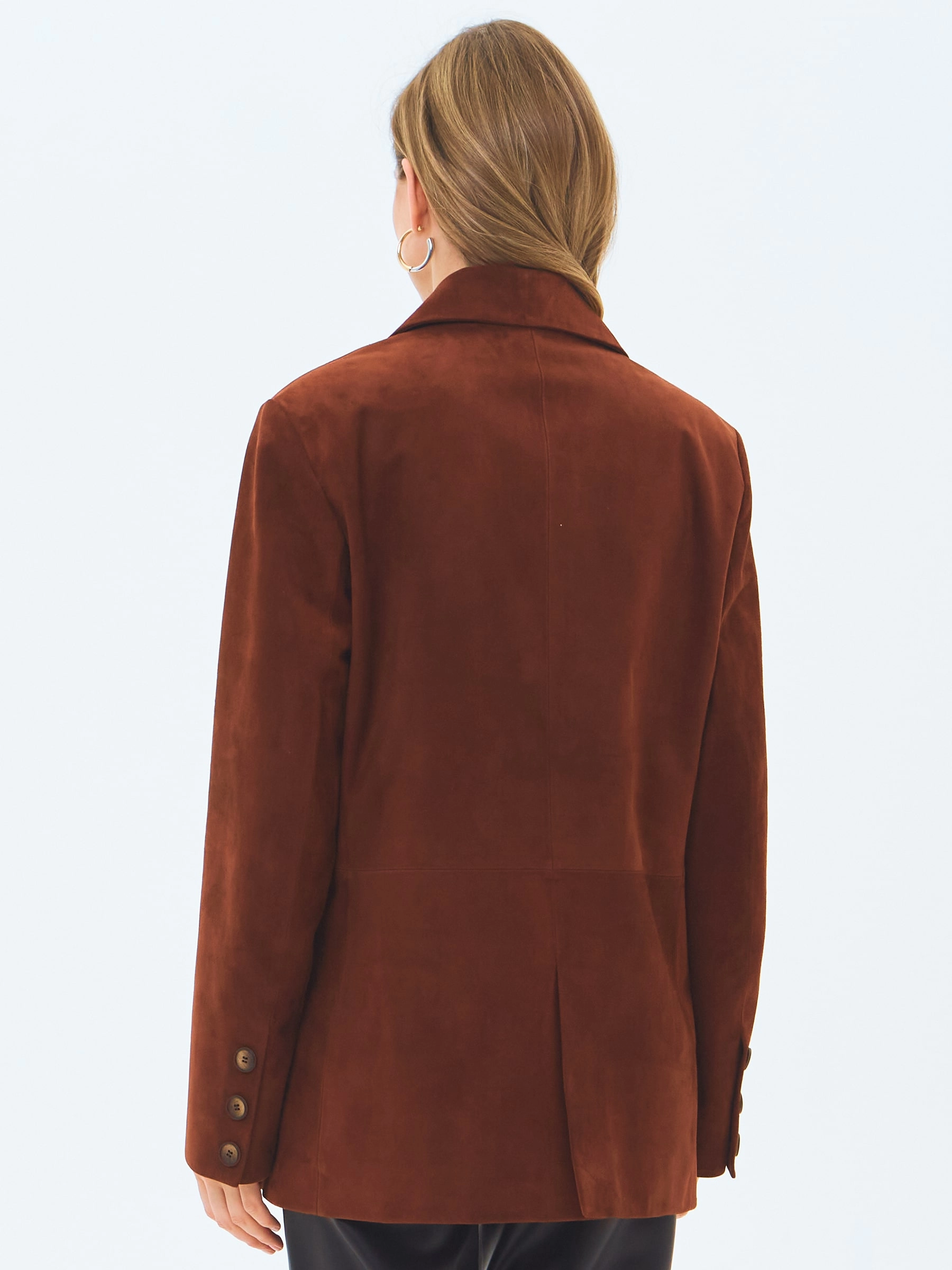Классический пиджак с английским воротником и двумя боковыми карманами с клапанами выполнили из нежной замши. За счет бережной выделки, нежный материал с бархатистой фактурой, позволил создать легкую, комфортную модель. Для дополнительной свободы движения сзади предусмотрели шлицу. Изделие застегивается двумя пуговицами.