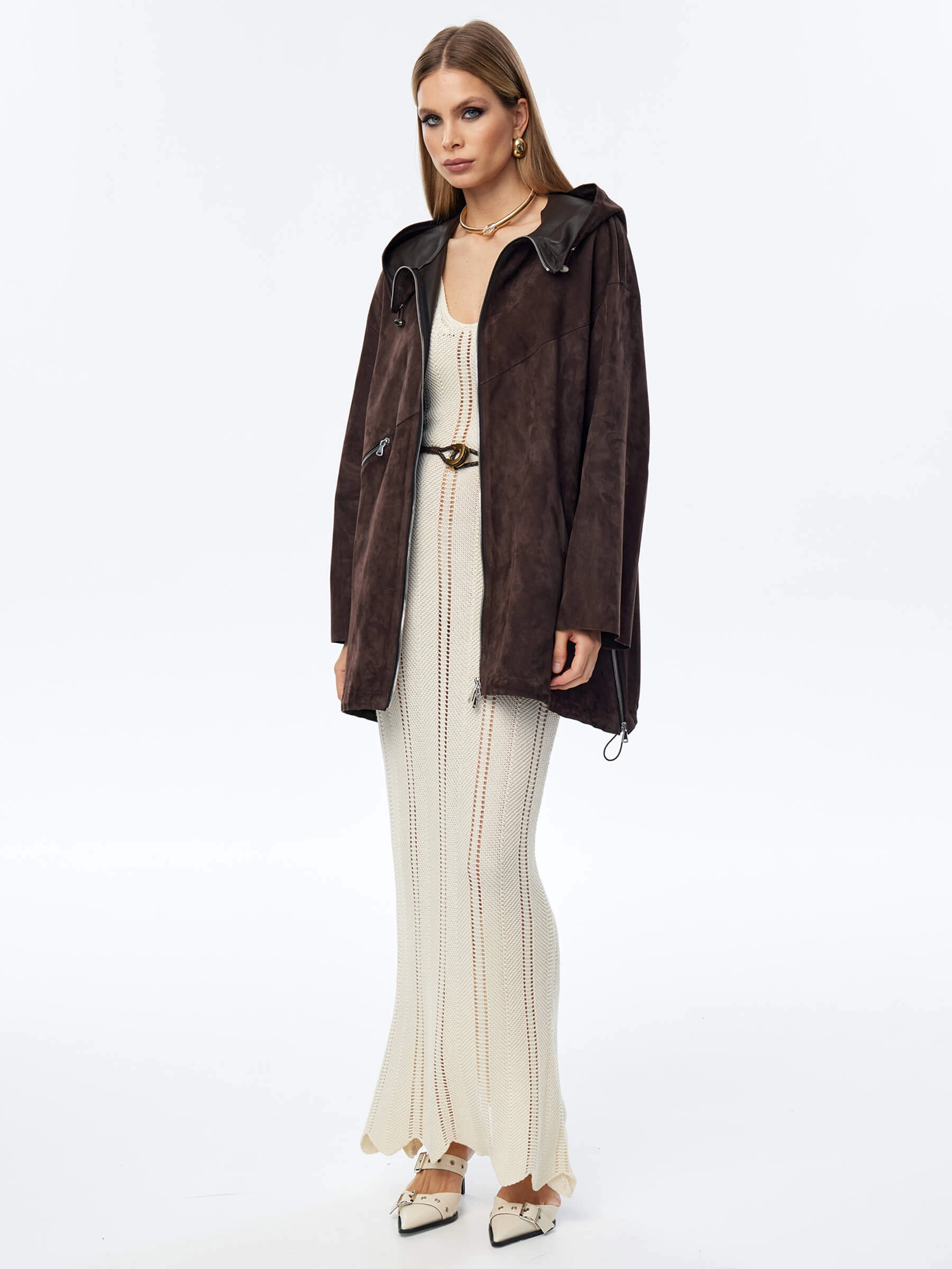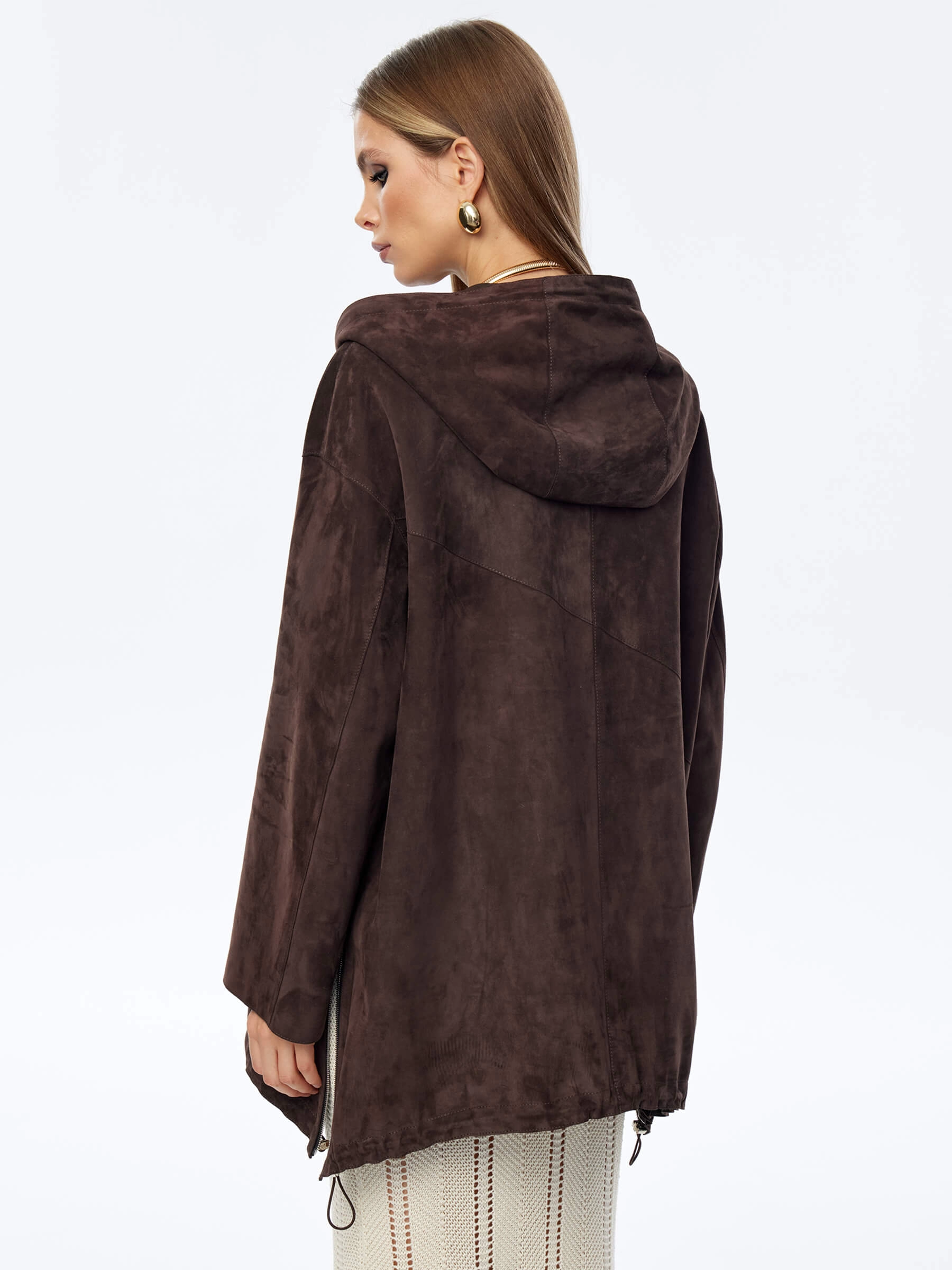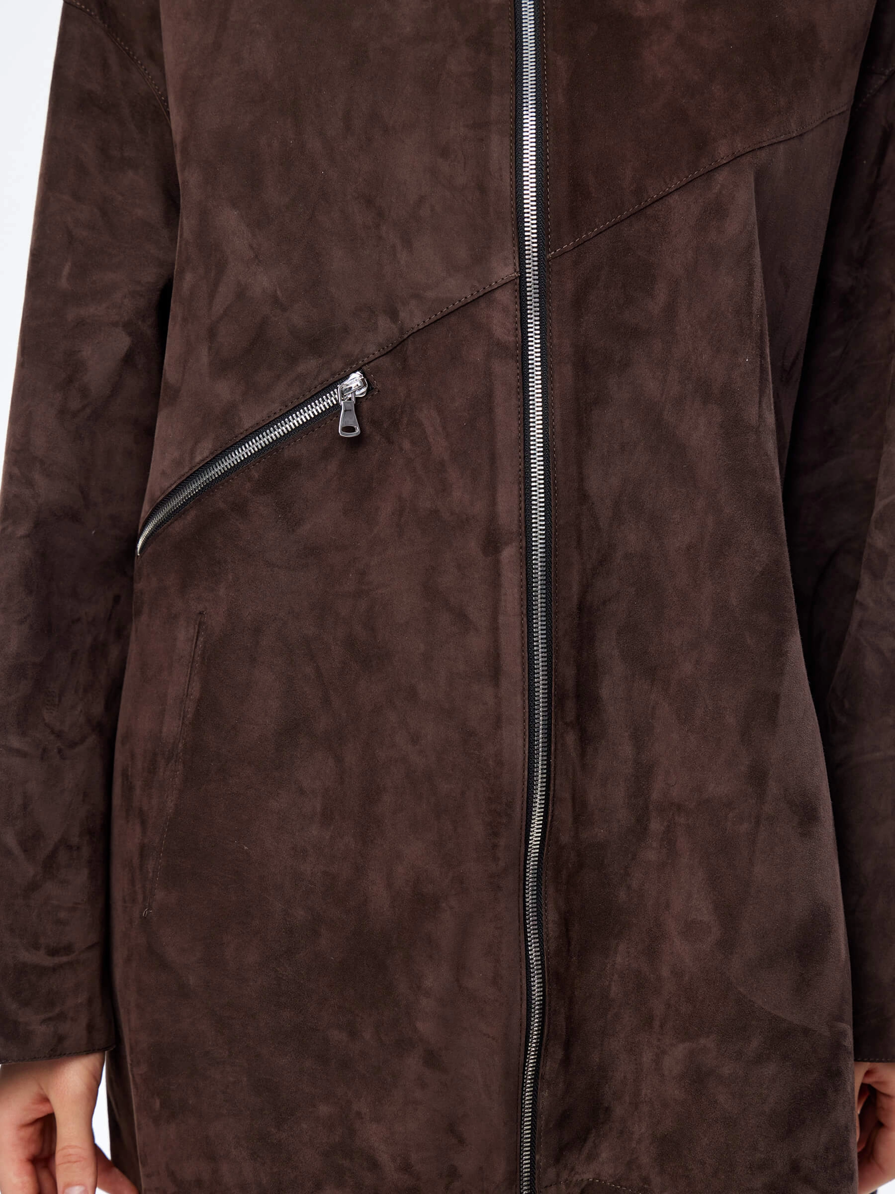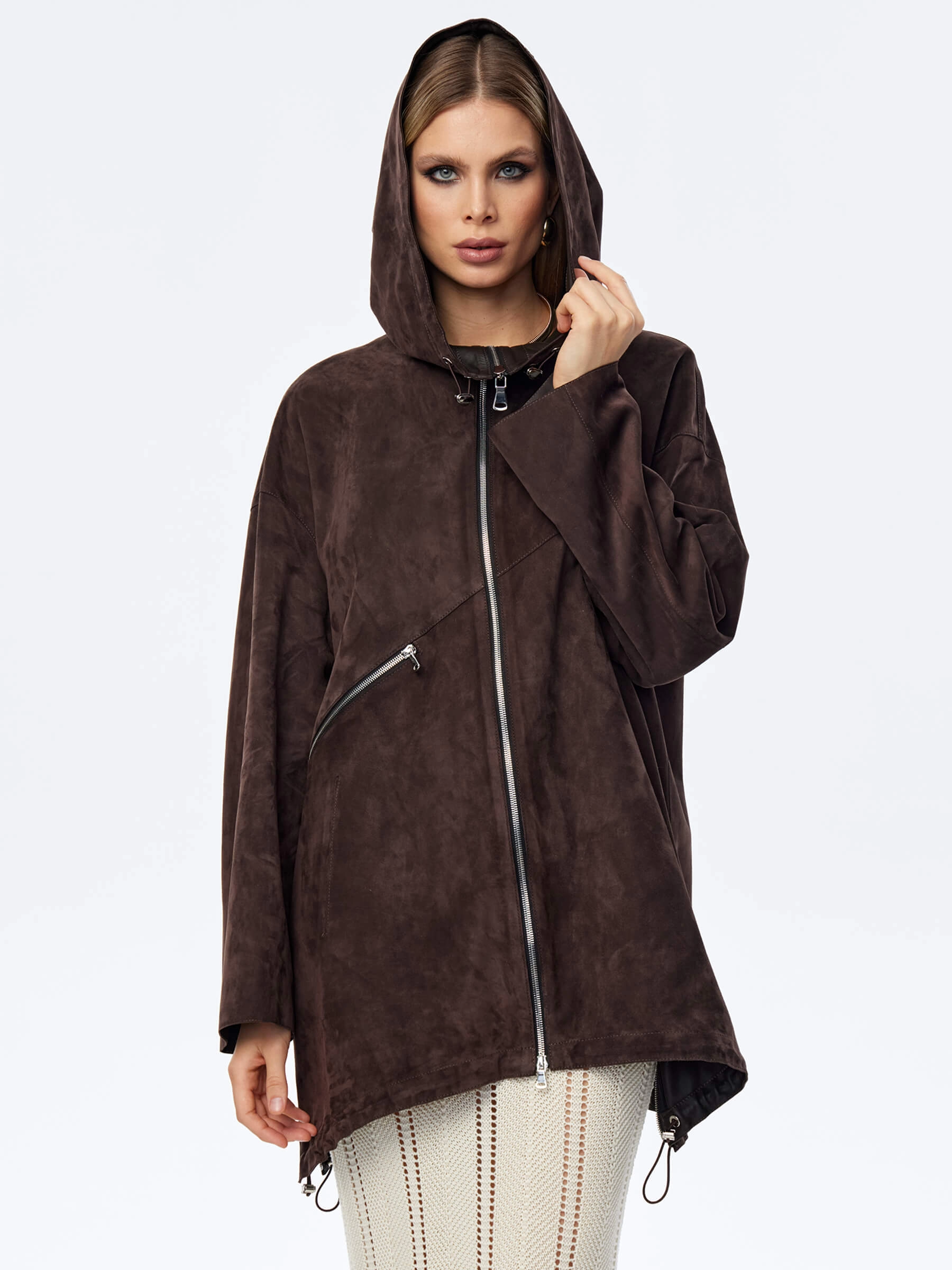 Для пошива модели с регулируемыми глубоким капюшоном и низом, мастера использовали нежную бархатистую замшу премиум класса. Свободный крой, два врезных кармана, боковые разрезы как и сама модель застегиваются крупными серебристыми молниями. Роль декора отдали асиммитричному карману.