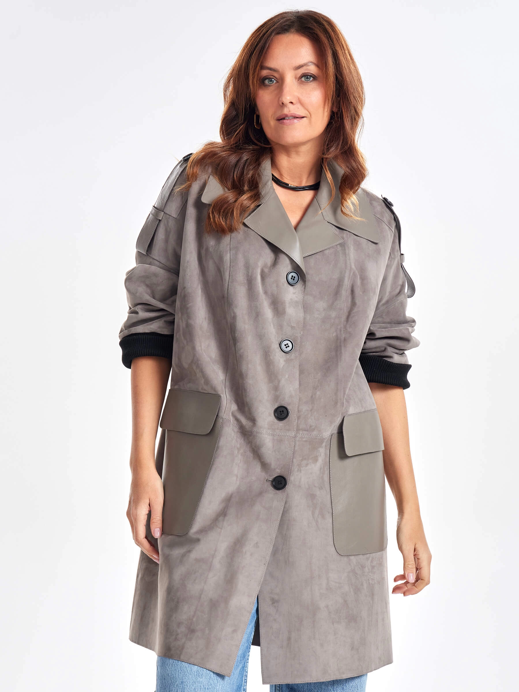 Стиль и комфорт читается в этом полупальто. Для пошива изделия использовали бархатистую нежную замшу тонкой выделки. Свободный силуэт изделия удобно садится по фигуре. Английский воротник и спущенная линия плеч. Посадку по фигуре можно регулировать узким поясом. Акцент сделали на погоны и крупные накладные карманы в гладкой кожи.