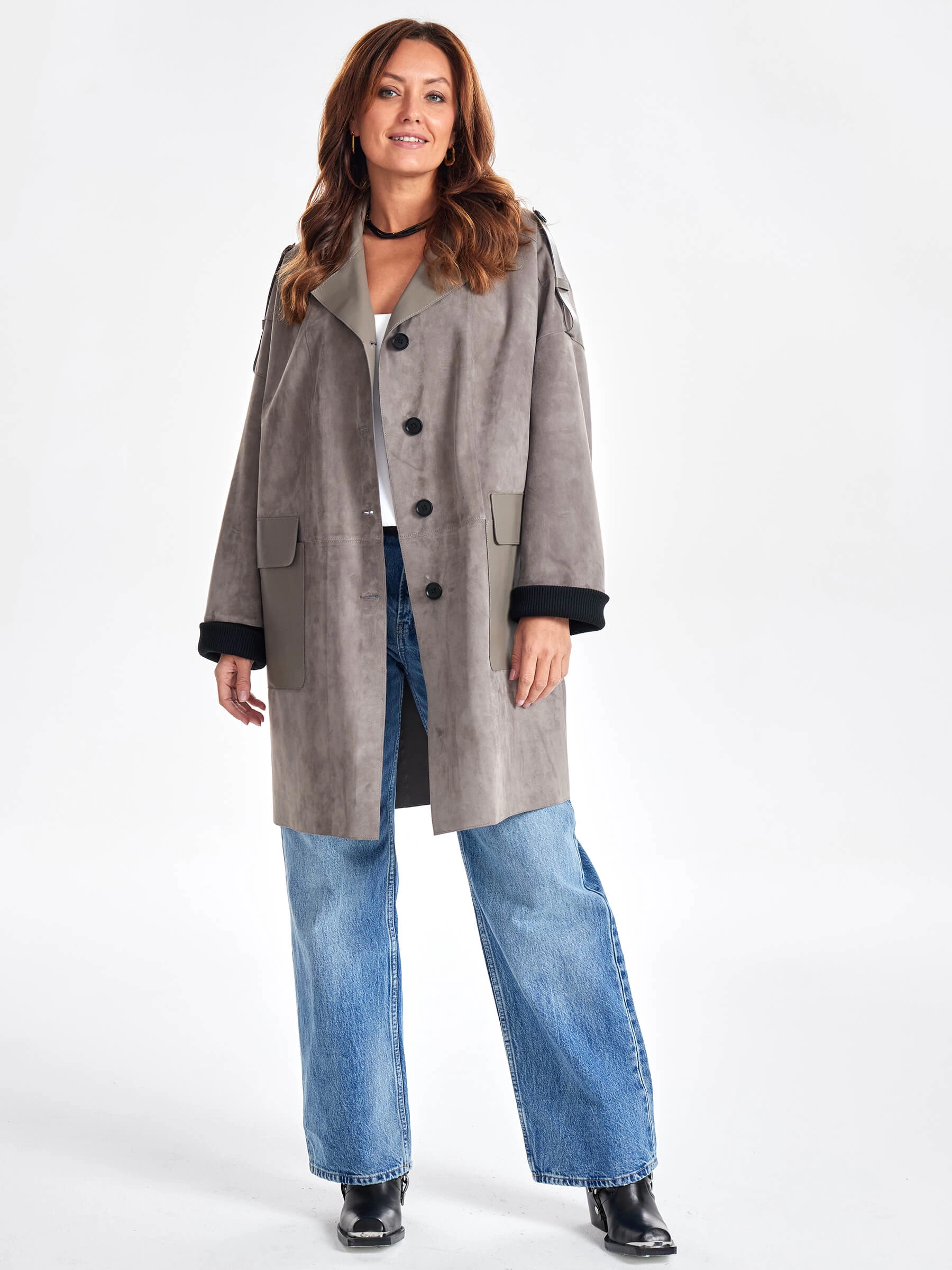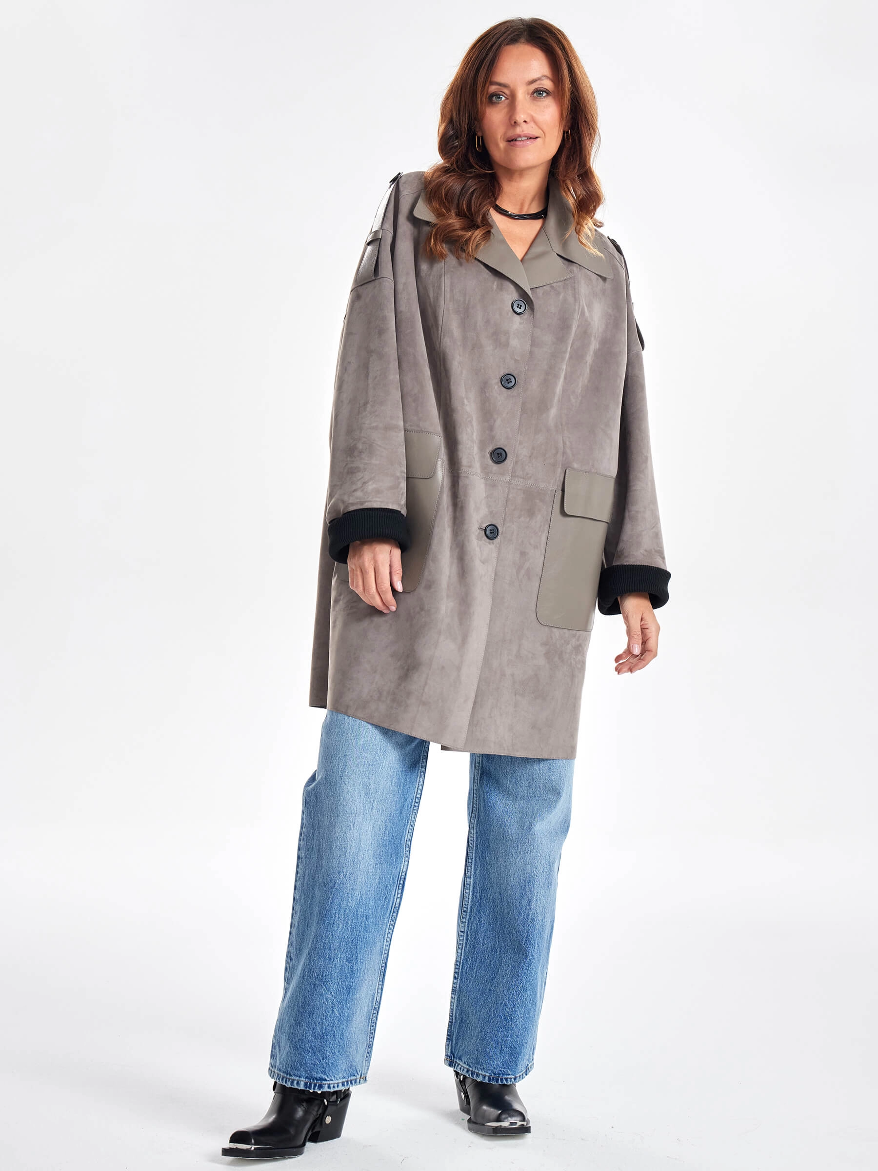 Товар женское короткое замшевое полупальто оверсайз премиум класса 3063з, серое, размер 48, артикул 64060 выполнен из натуральной замши с застежкой пуговицы. Рассчитан на сезон: весна-лето. Длина изделия 93 см, силуэт свободный.