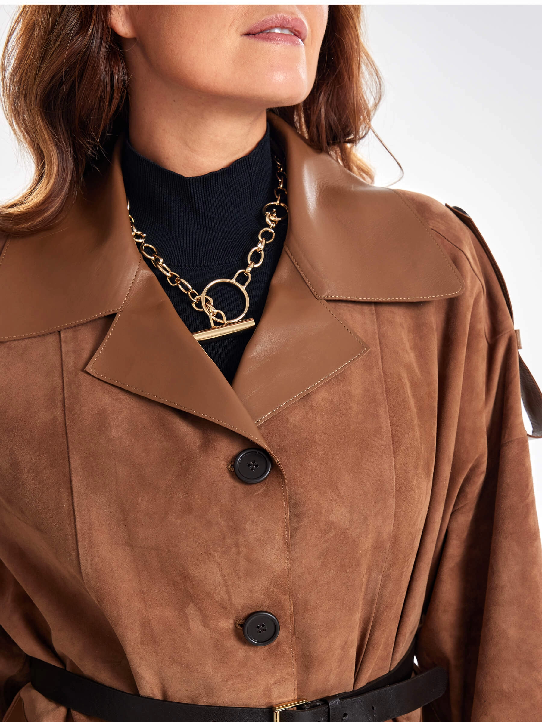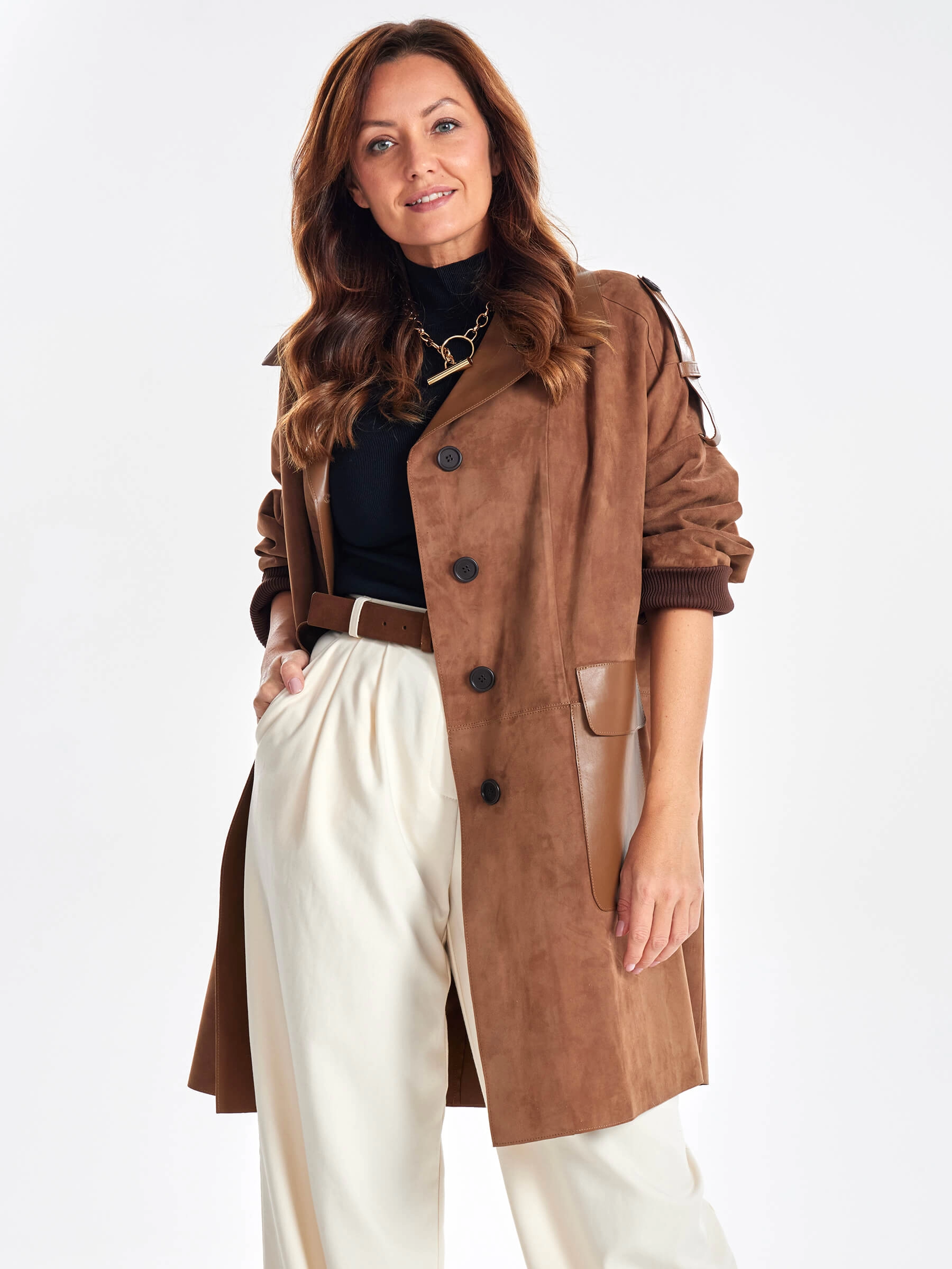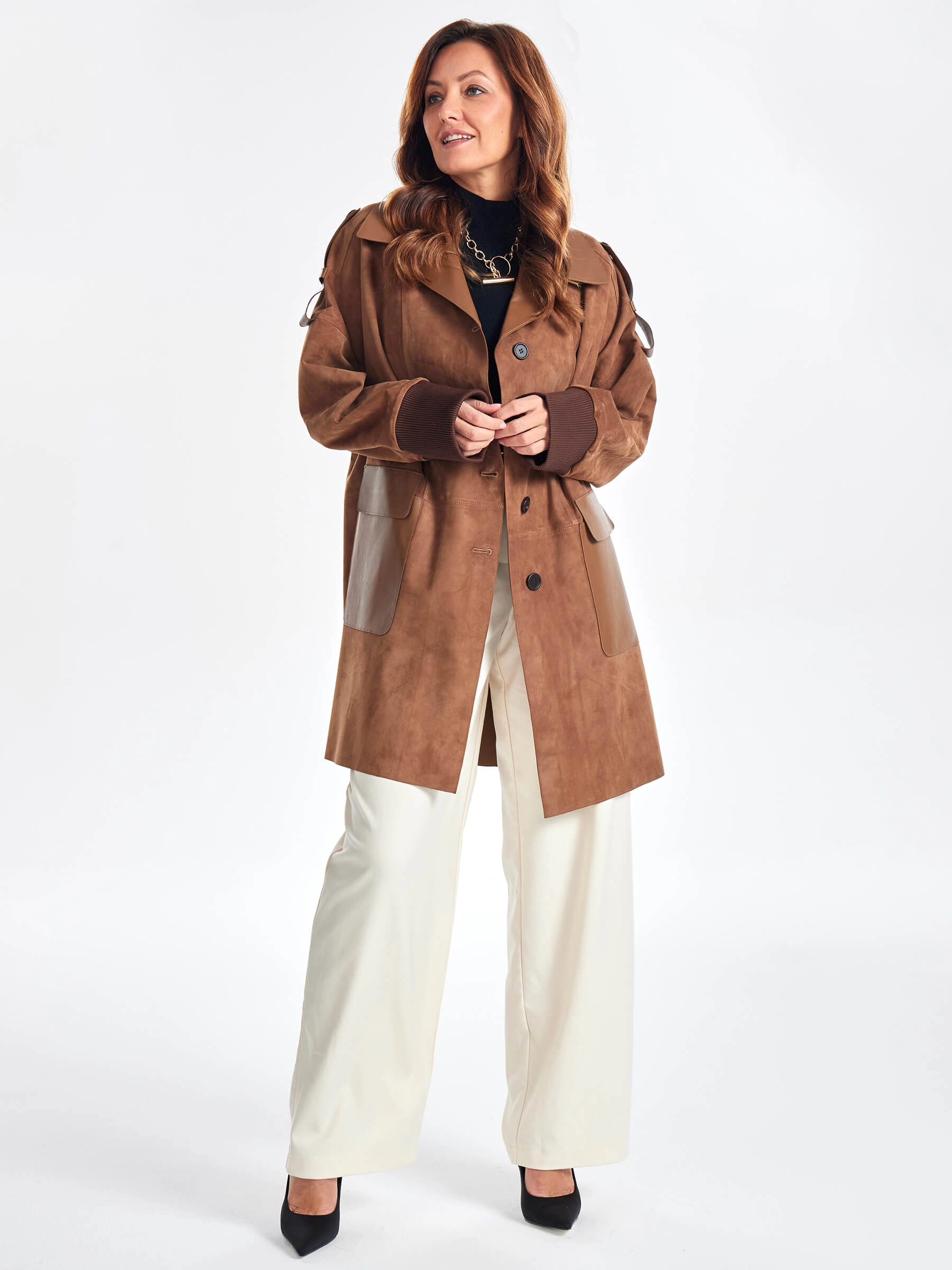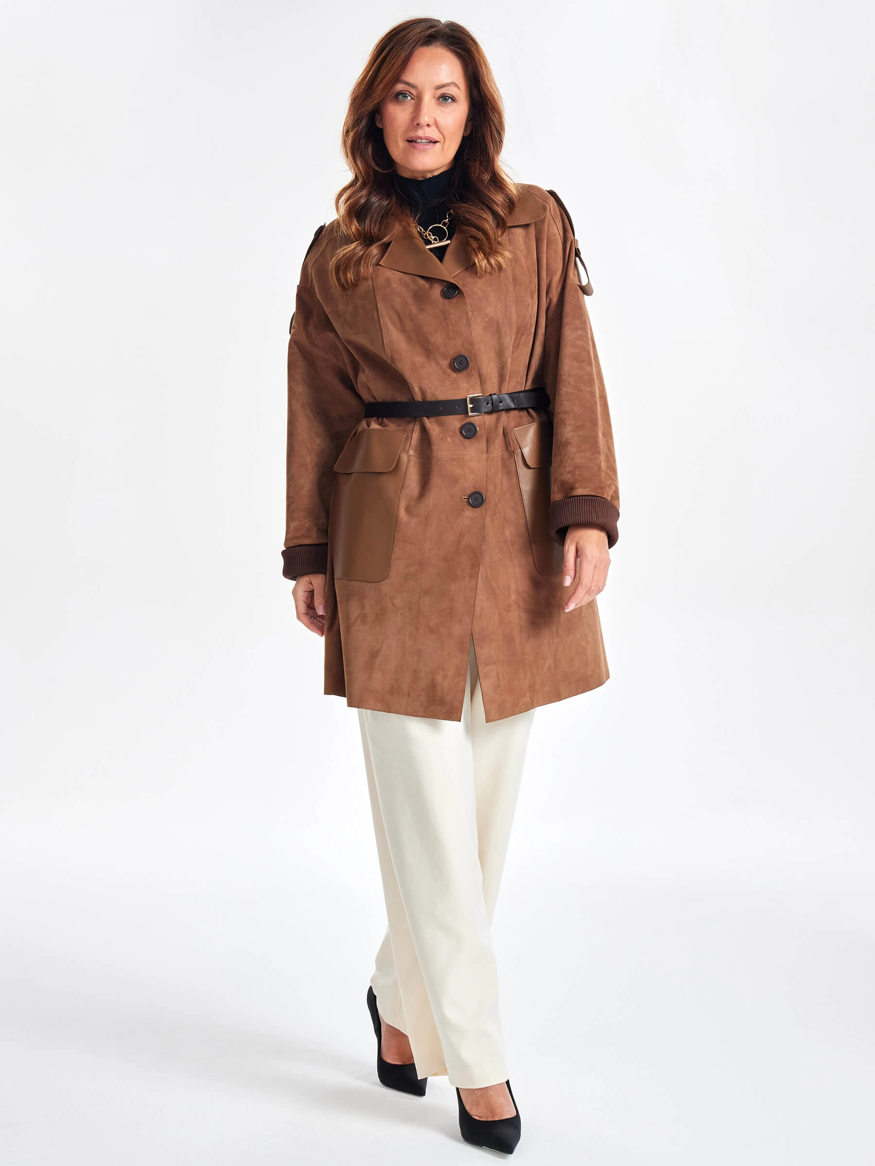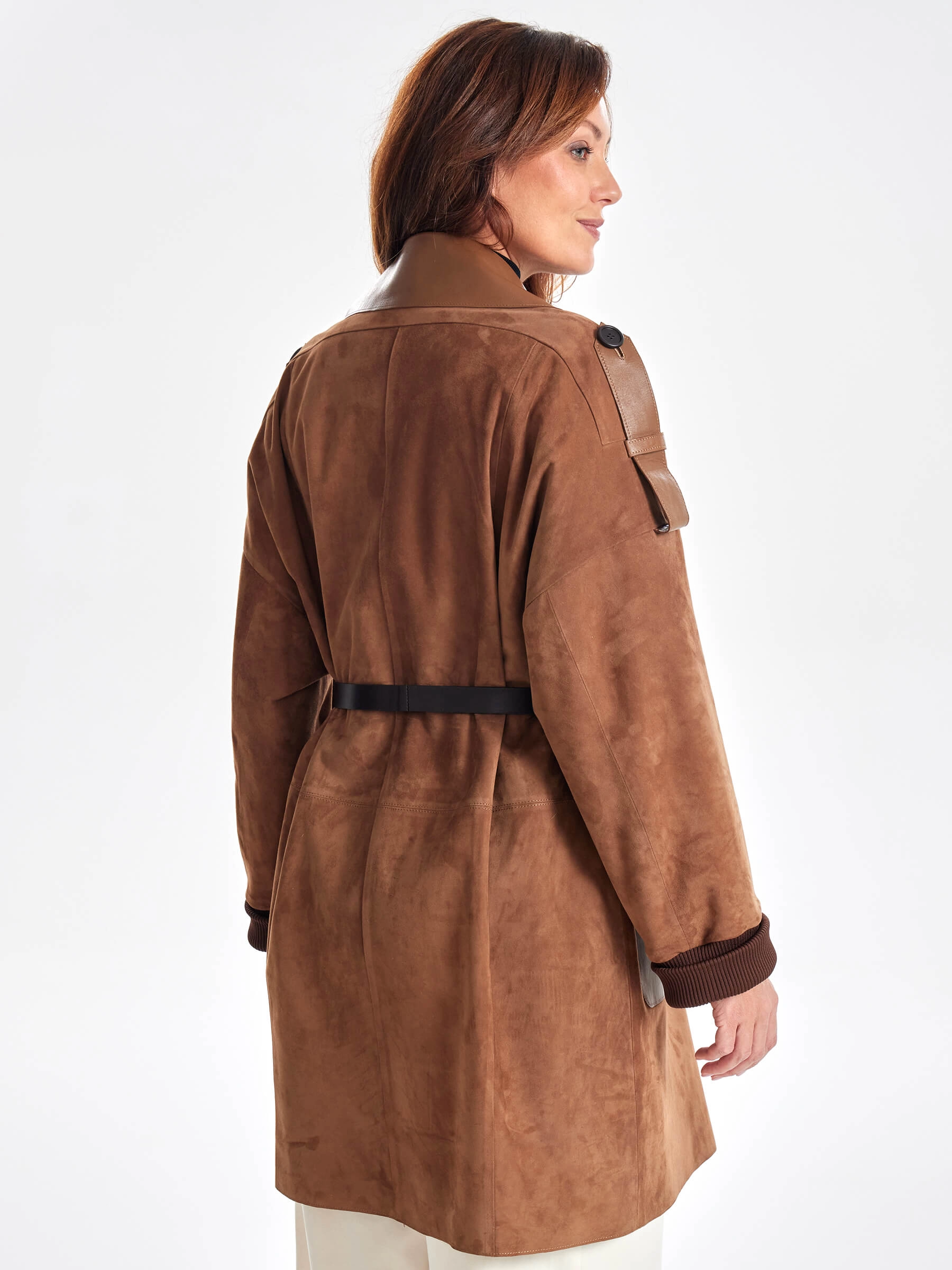 Стиль и комфорт читается в этом полупальто. Для пошива изделия использовали бархатистую нежную замшу тонкой выделки. Свободный силуэт изделия удобно садится по фигуре. Английский воротник и спущенная линия плеч. Посадку по фигуре можно регулировать узким поясом. Акцент сделали на погоны и крупные накладные карманы в гладкой кожи.