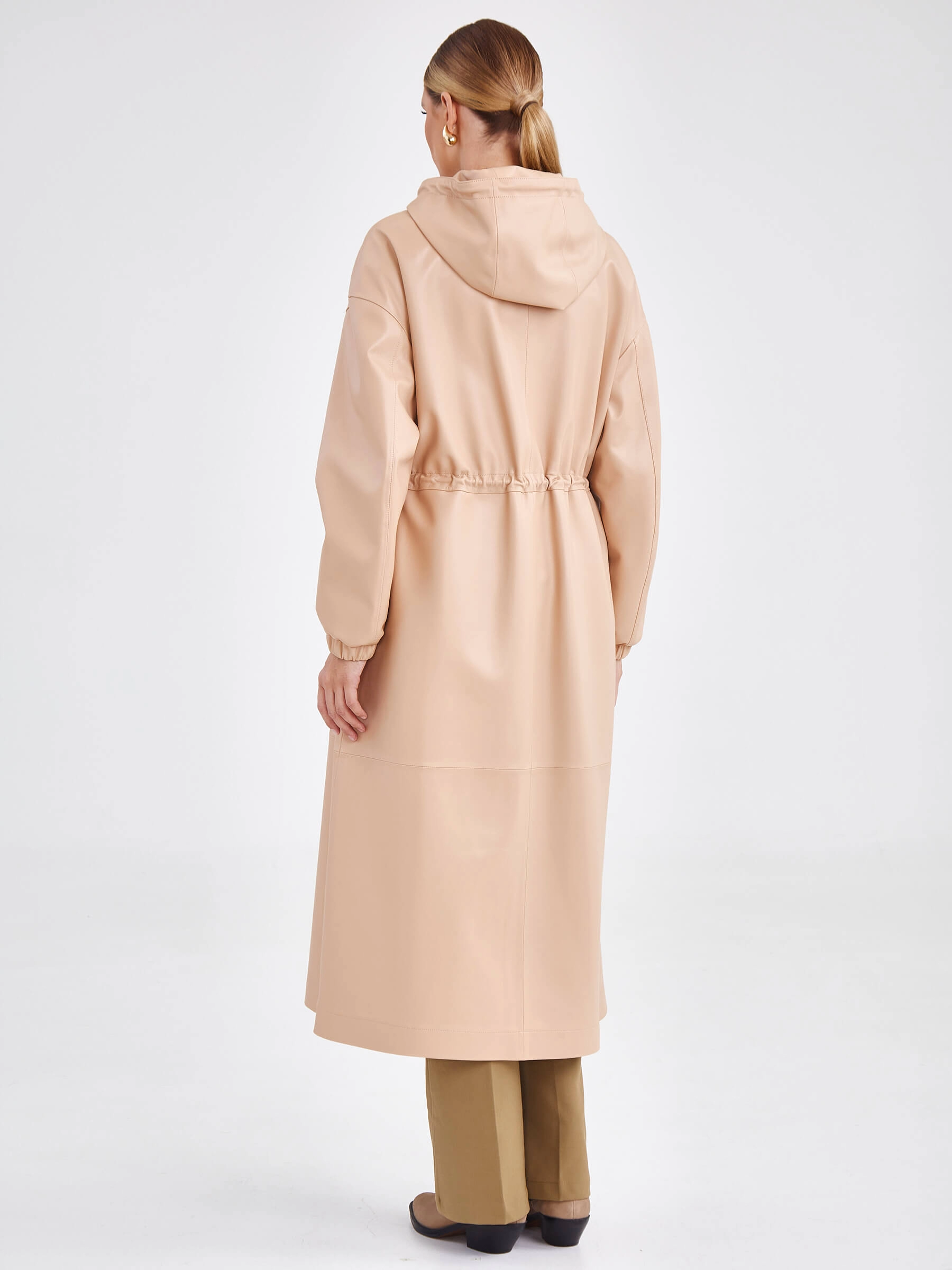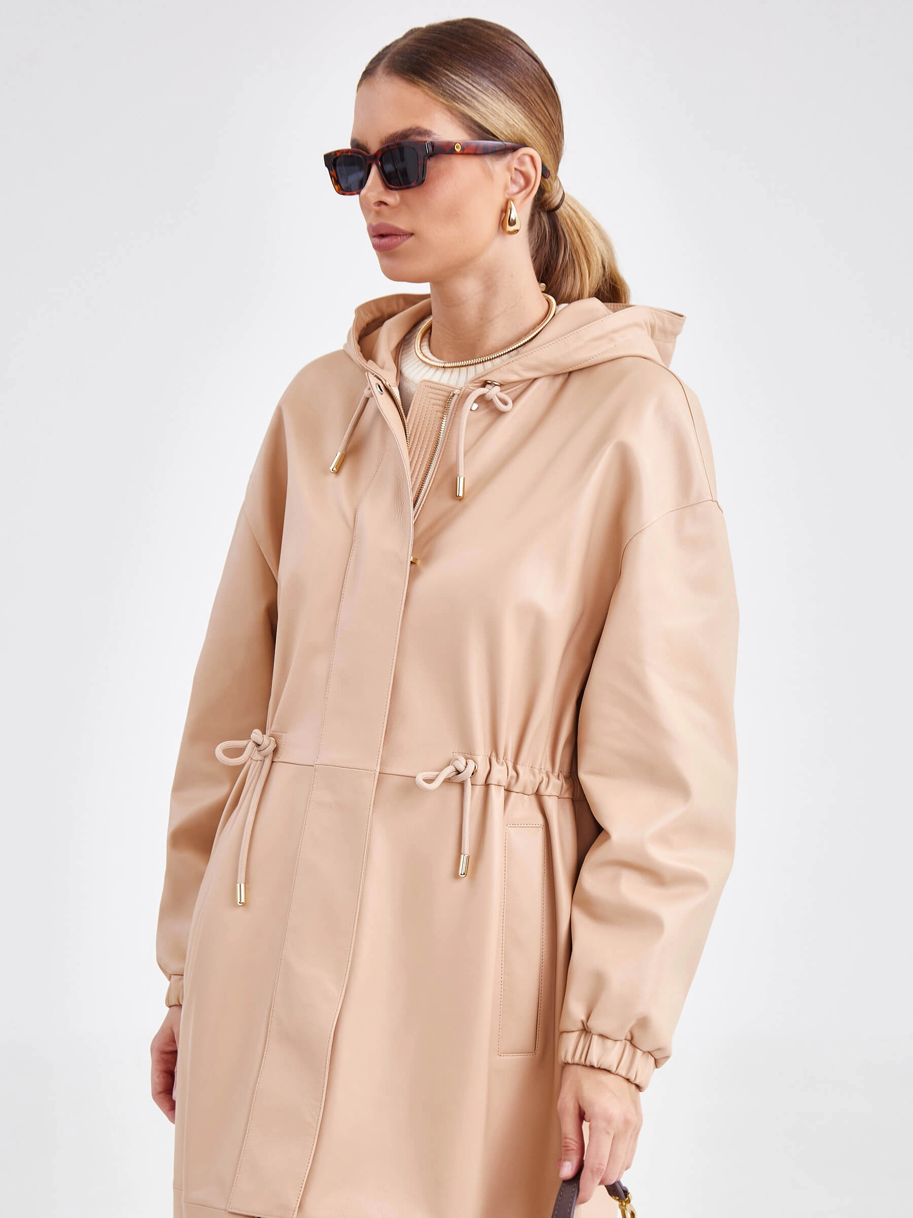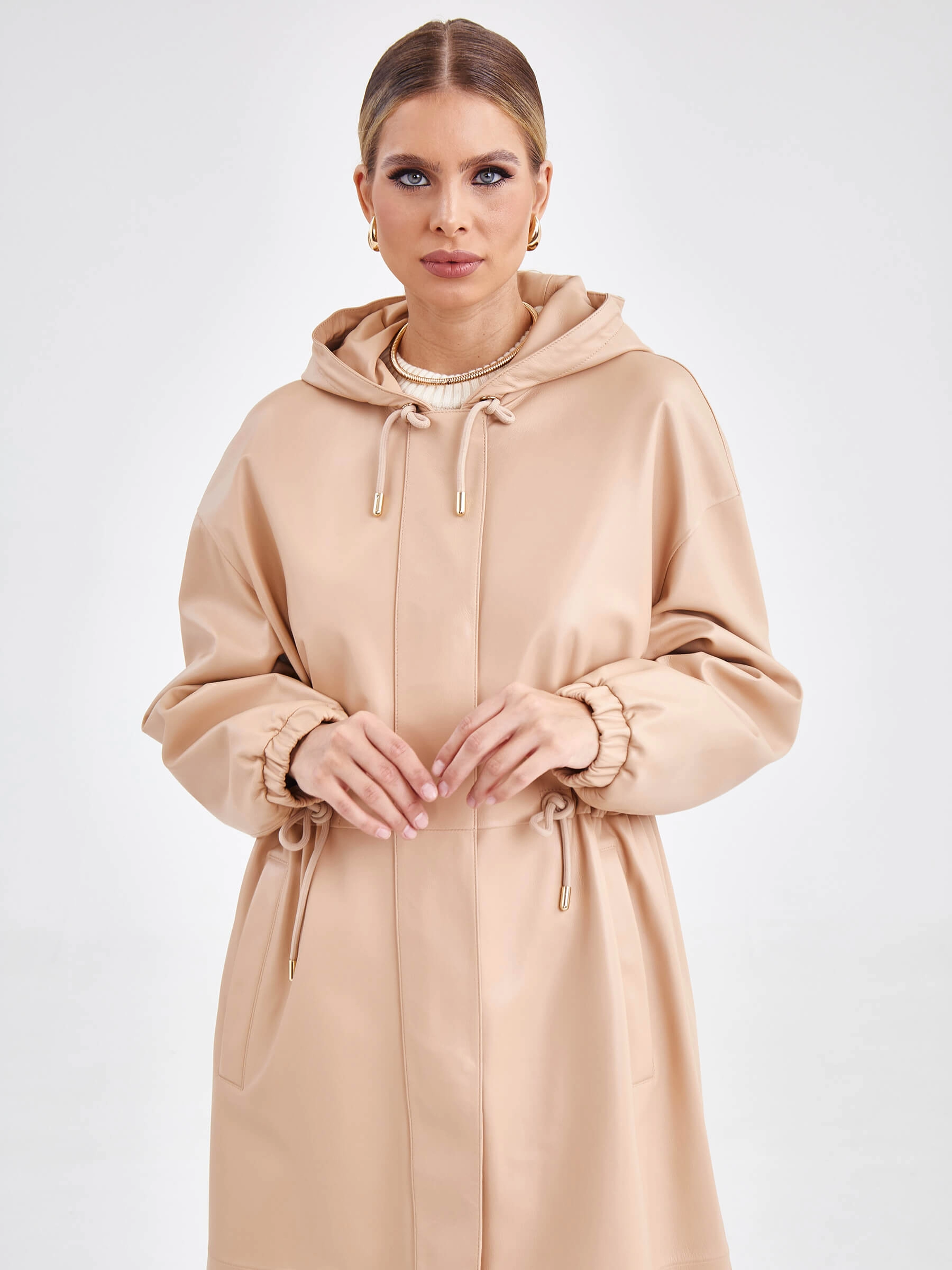 Пальто бежевого цвета непременно впишется в ваш весенний гардероб. Изделие выполнили из мягкой кожи премиум класса. Прямой крой, удобный капюшон, глубокие боковые карманы, застежка - молния, закрывается широкой планкой. Легко изменить силуэт помогут кулиски.