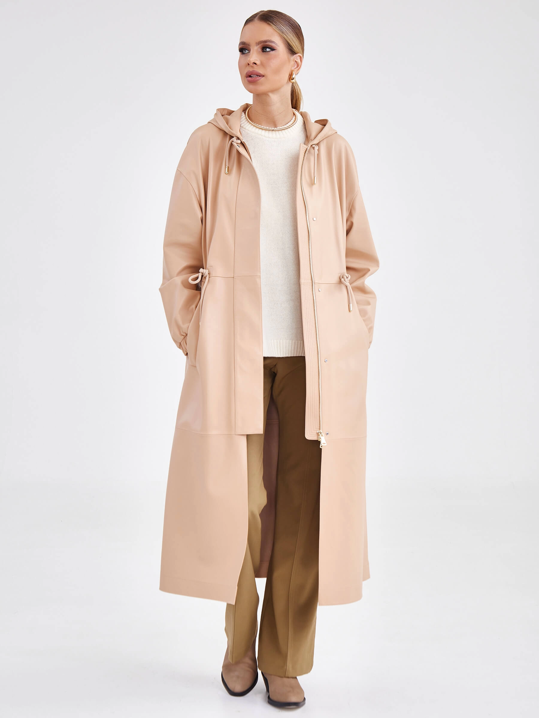 Товар женское кожаное пальто с капюшоном на молнии премиум класса 3033, бежевое, размер 44, артикул 63470 выполнен из натуральной кожи с застежкой молния. Рассчитан на сезон: весна-лето. Длина изделия 125 см, силуэт прямой.
