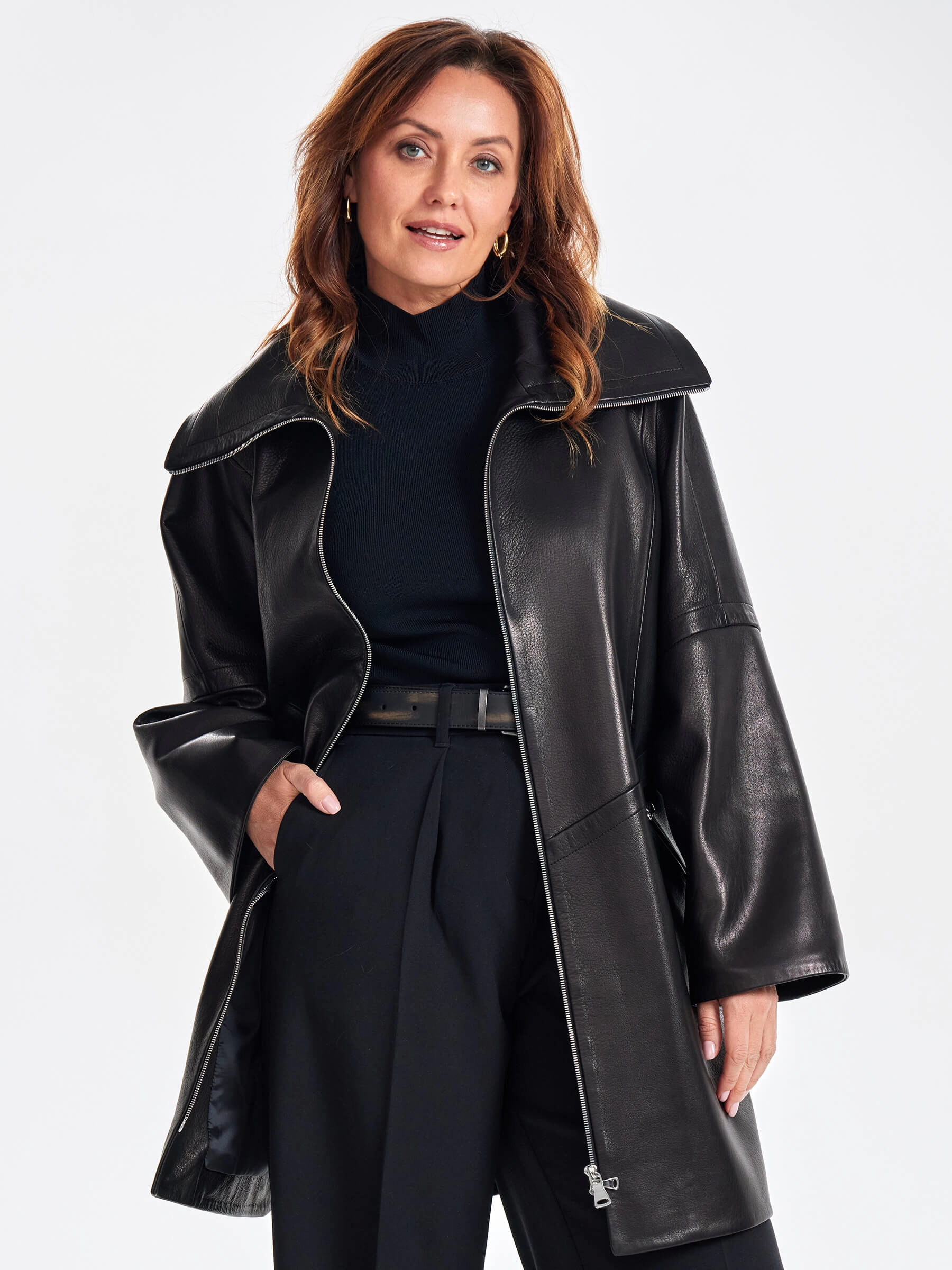 Стильное полупальто выполненное из фактурной мягкой кожи премиум класса гармонично завершит ваш ежедневный образ. Изделие свободного кроя, со спущенной линией плеч застегивающейся встречной молнией серебристого цвета. Дополнительный комфорт в ветренную погоду добавит воротник-стойка, Для большей свободы движения предусмотрены боковые разрезы.