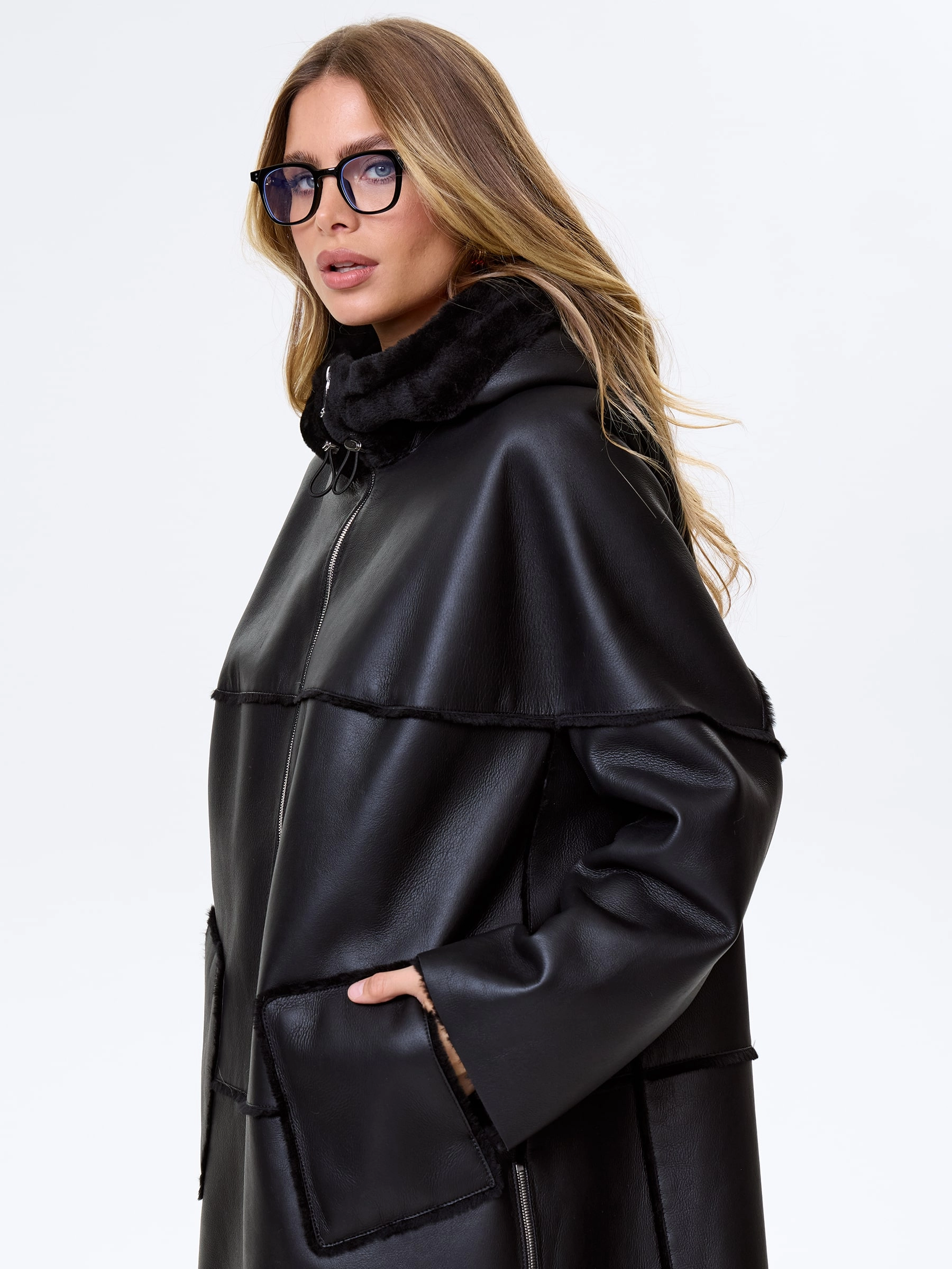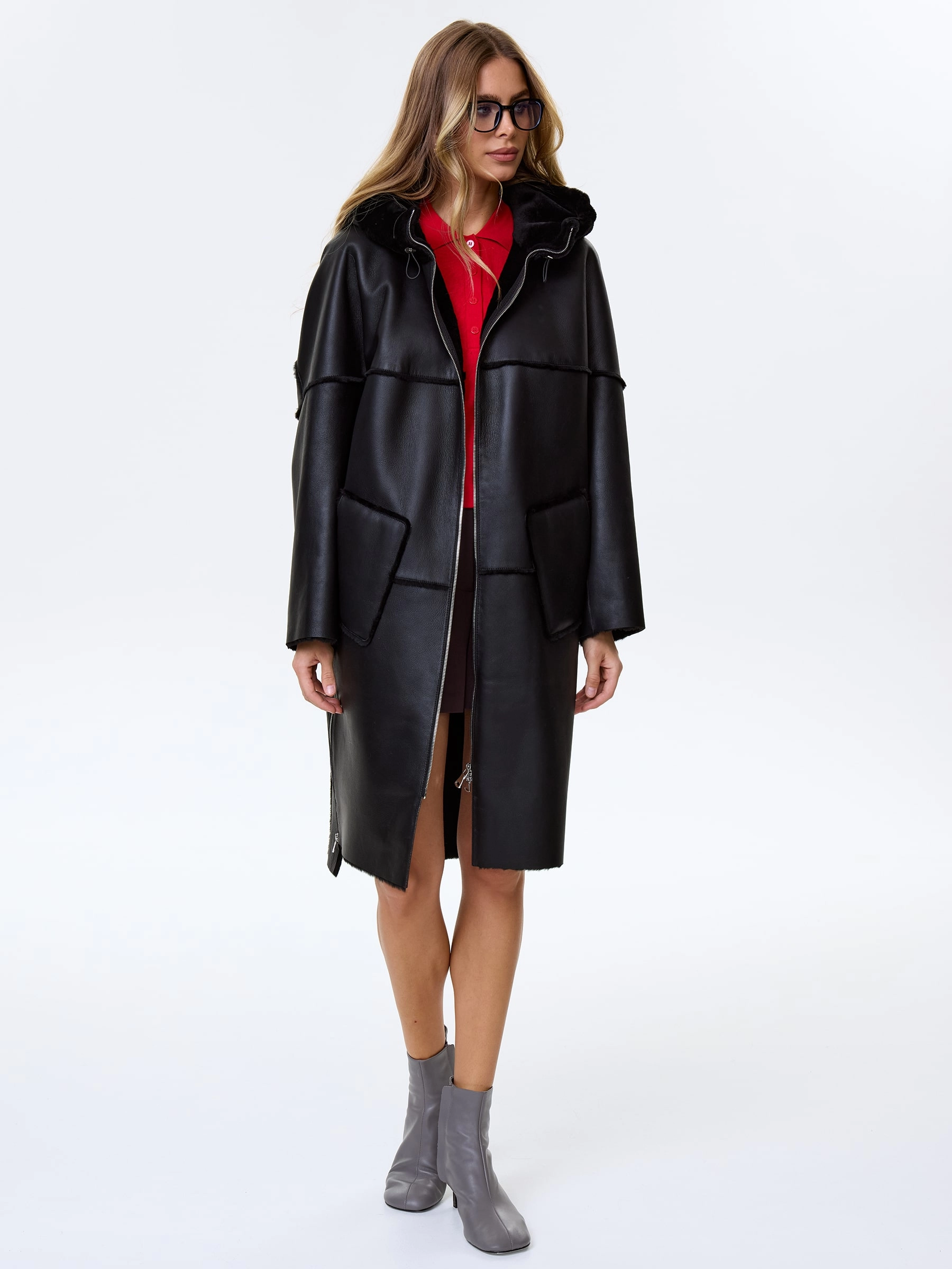 Длинное пальто свободного кроя выполнили из плотной овчины с гладкой фактурой и вывернутыми наружу швами. Меховое пальто получилась не только максимально теплым, но и комфортным. Боковые разрезы как и само изделие застегиваются крупными молниями. Объемный регулируемый капюшон, позволяет обойтись без головного убора.
