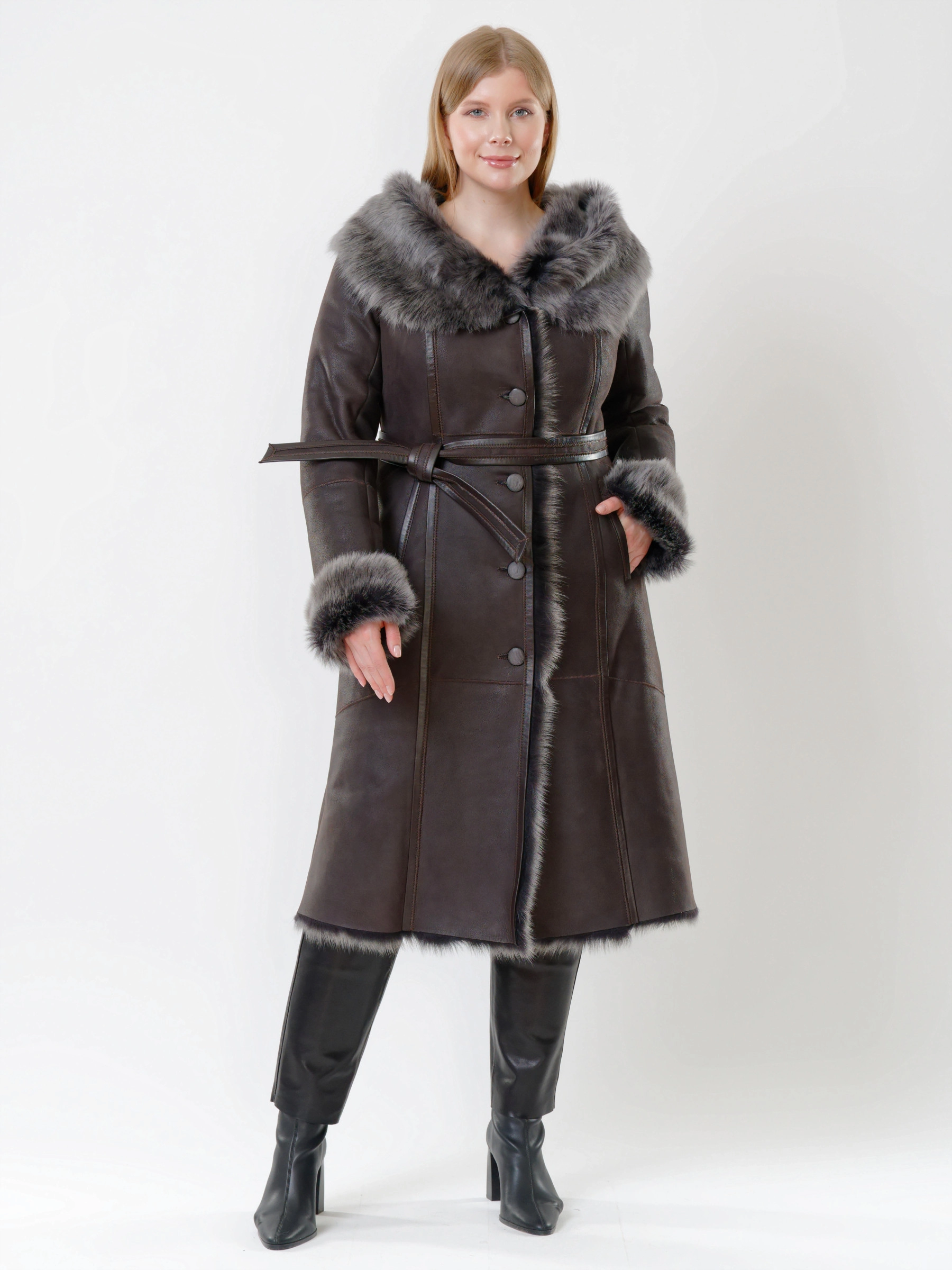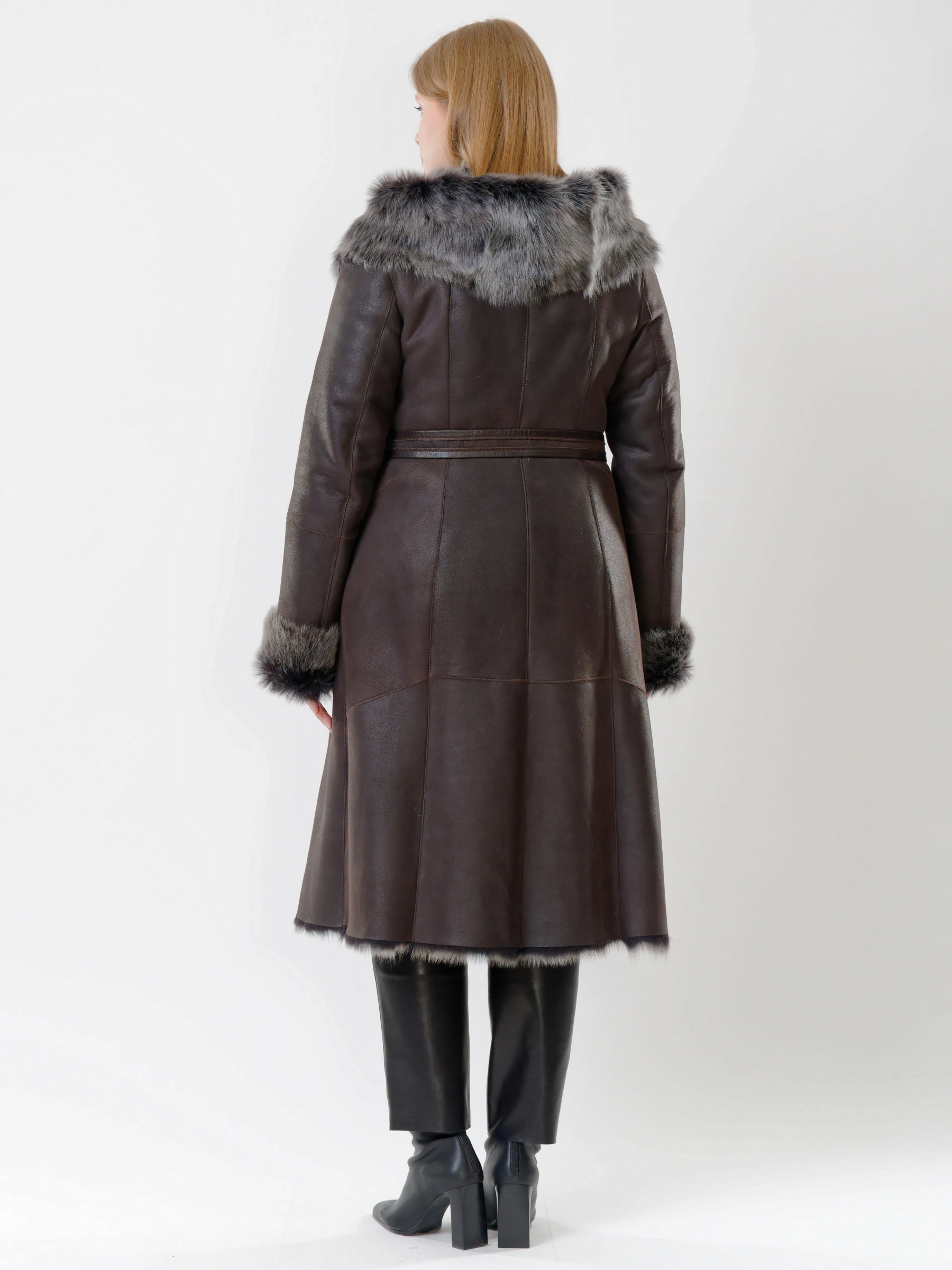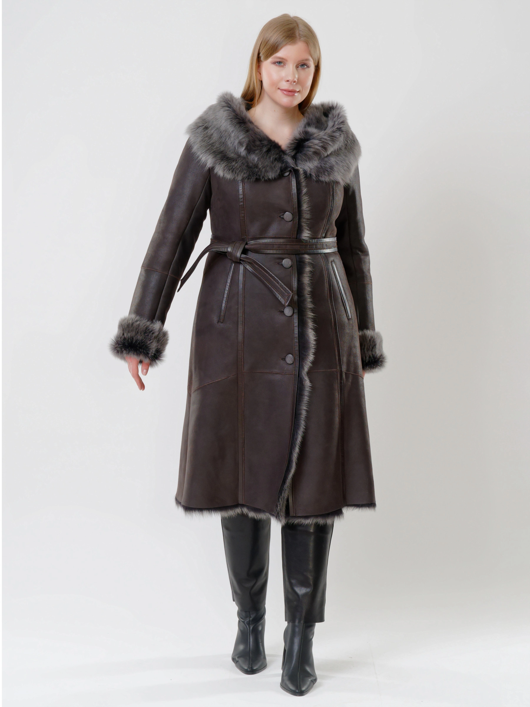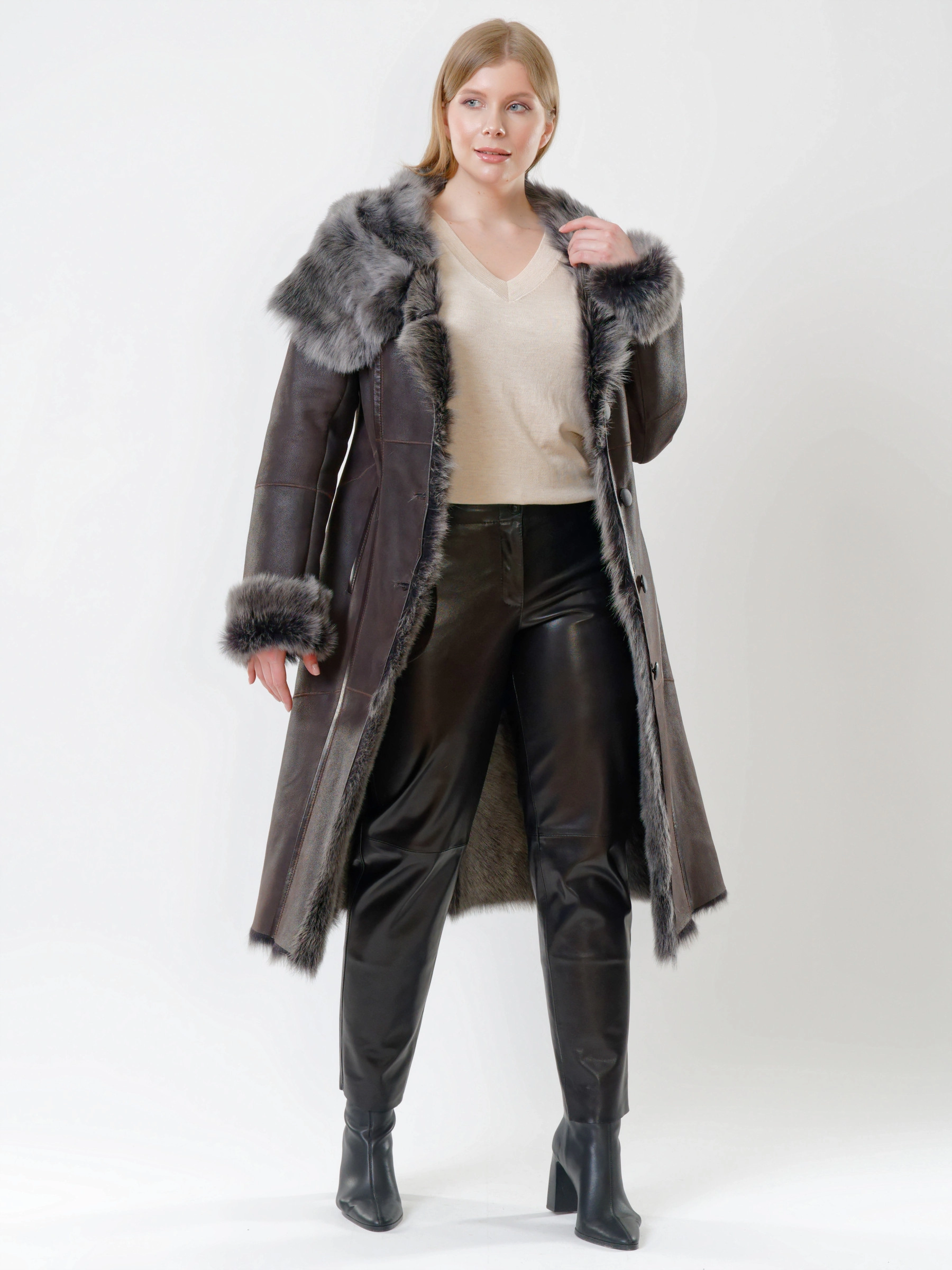 Прекрасная дубленка из тосканской овчины сумеет противостоять любым морозам. Модель получилась легкой и теплой. Отличным дополнением к образу, послужат брюки из натуральной кожи высшего качества. Супер комфорт.