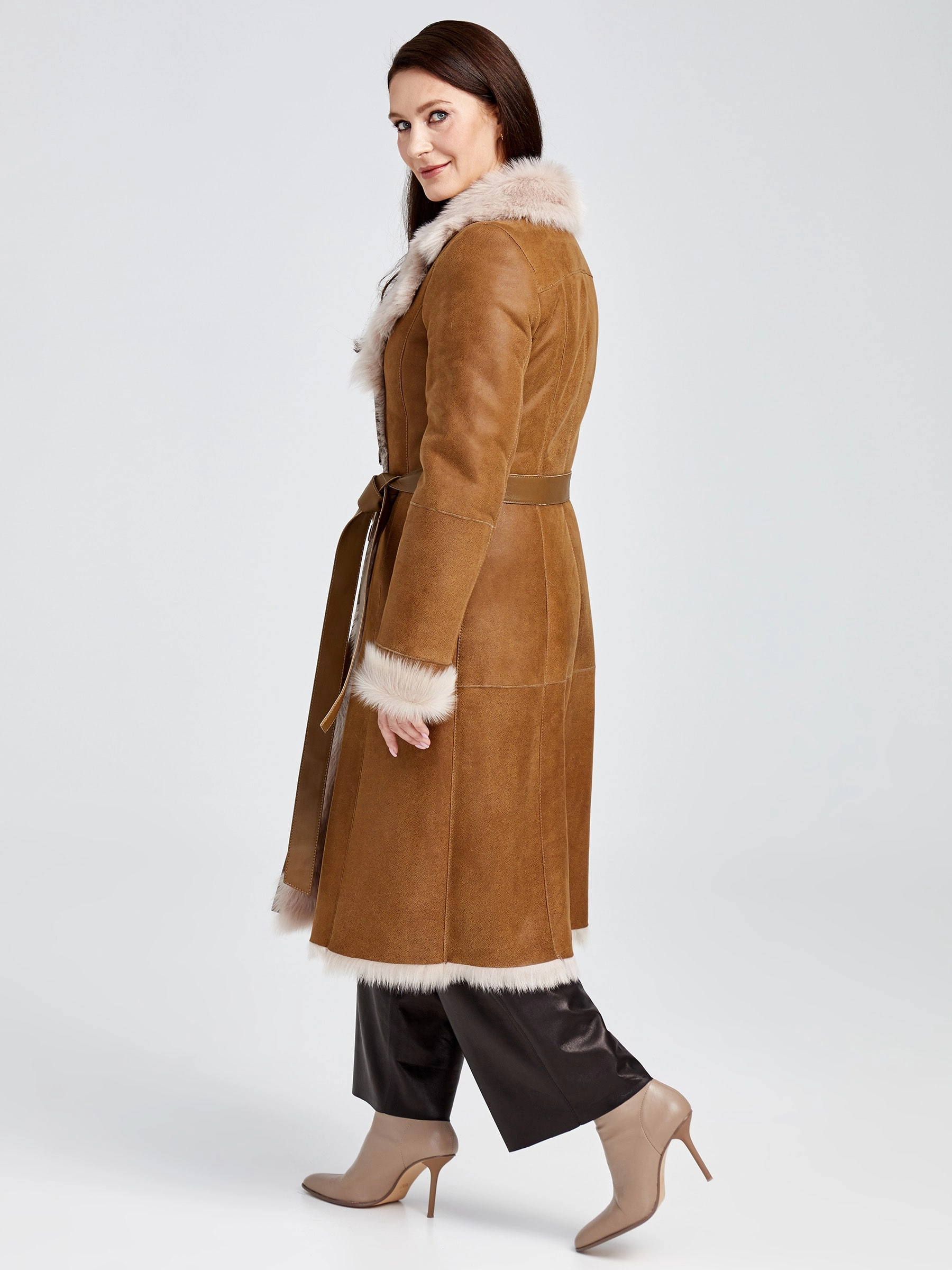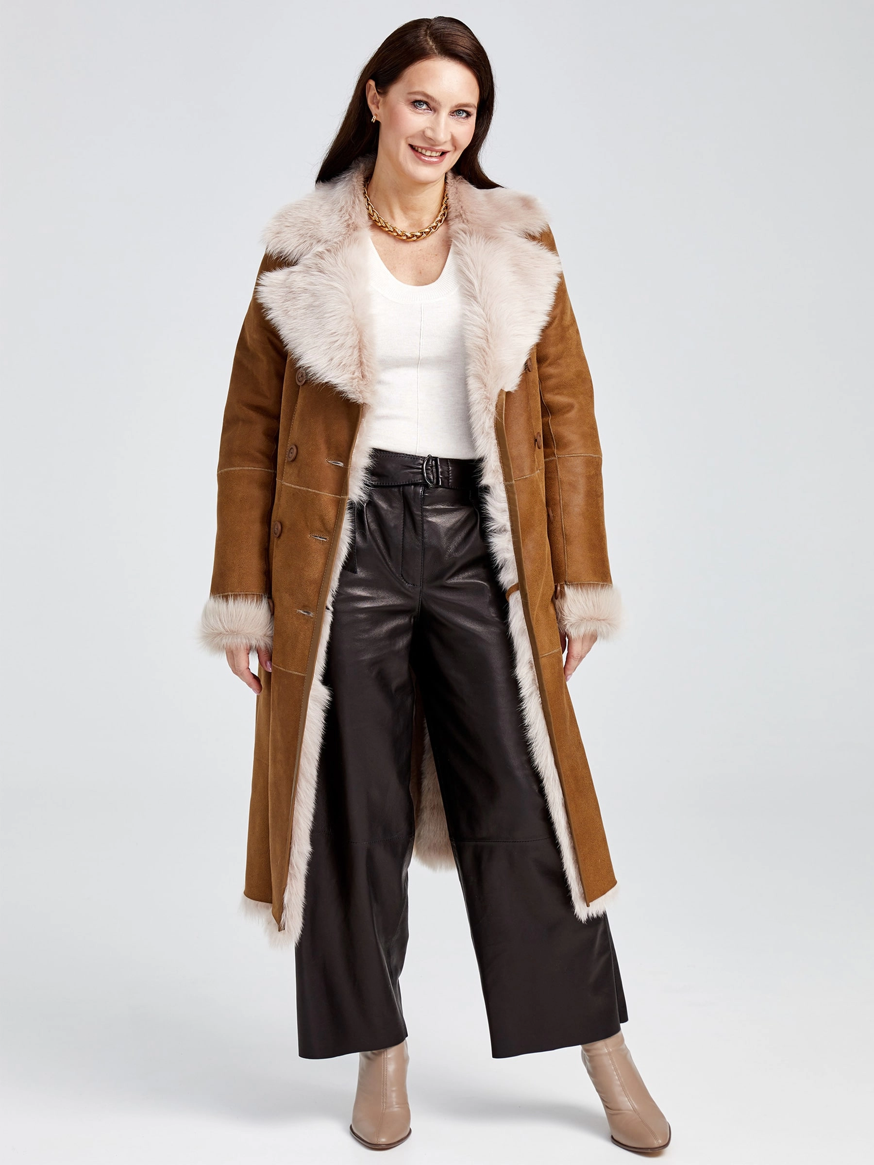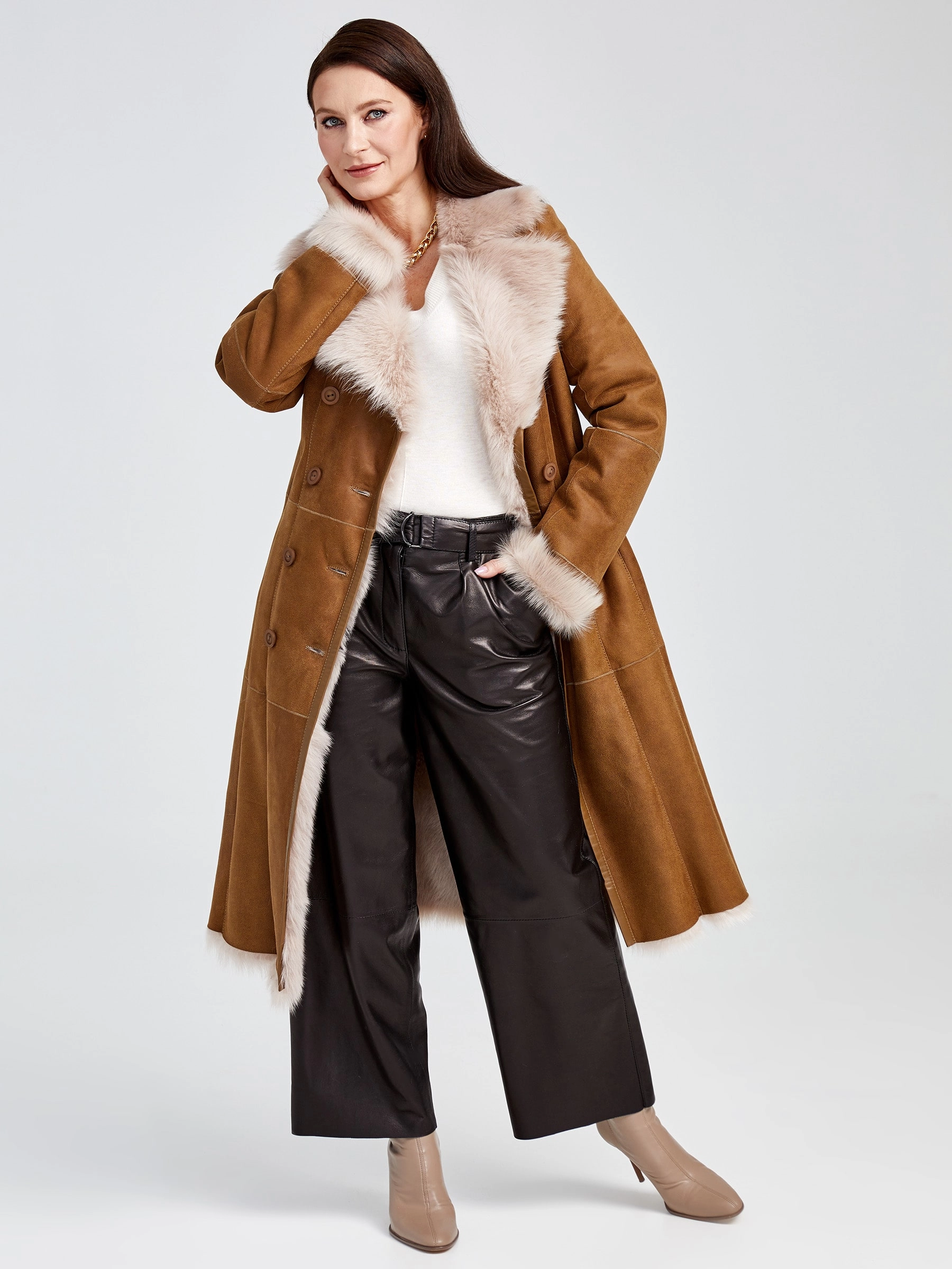 Классику еще никто не отменял, она всегда вне моды. Дубленка в благородном бежевом цвете из мягкой овчины с шелковистым густым ворсом, легко справиться с самым лютым морозом. Приталенный силуэт выгодно подчеркнет фигуру, английский воротник добавит элегантности. Великолепное сочетание с широкими кожаными брюками. Почувствуйте комфорт!
