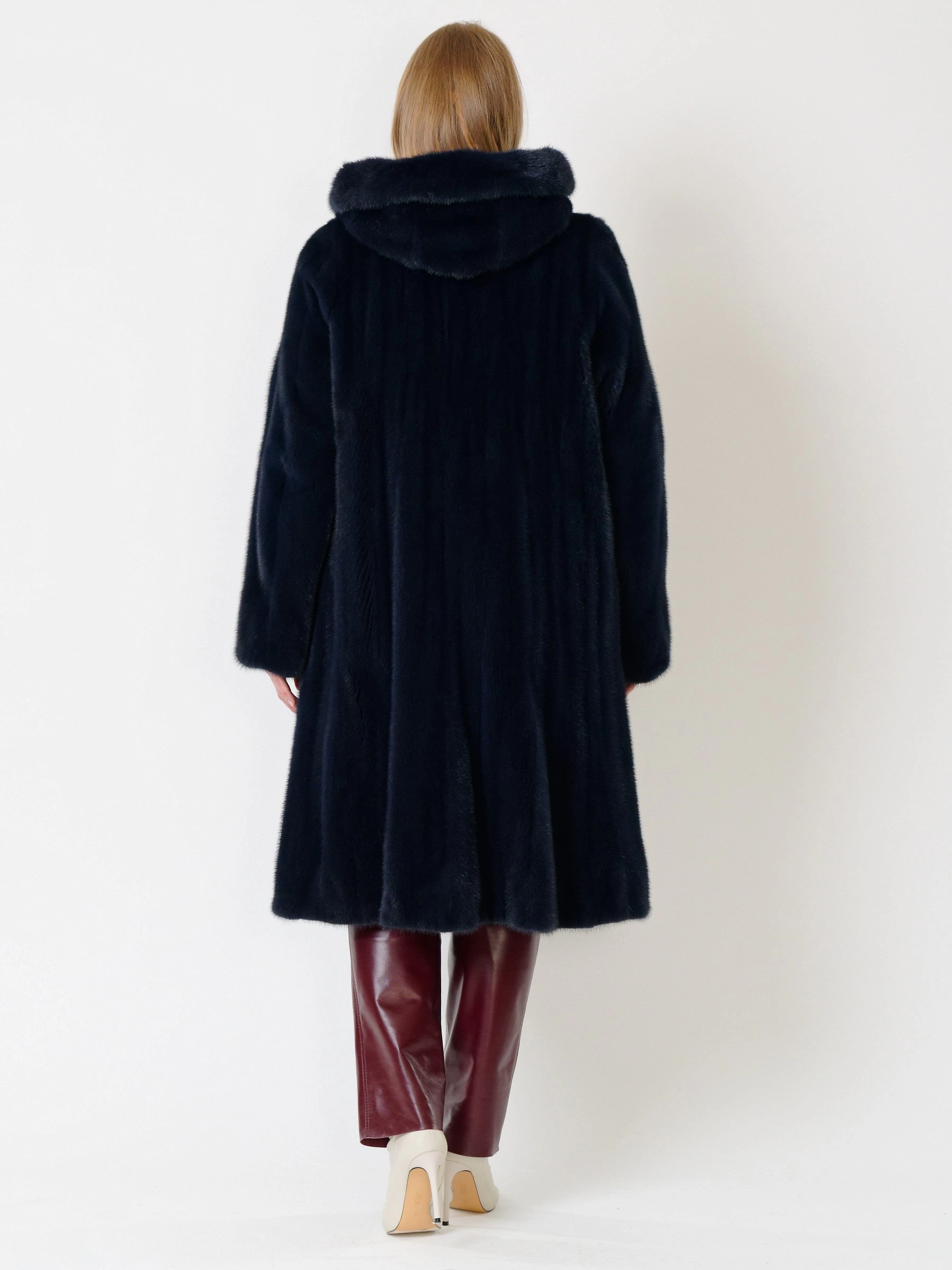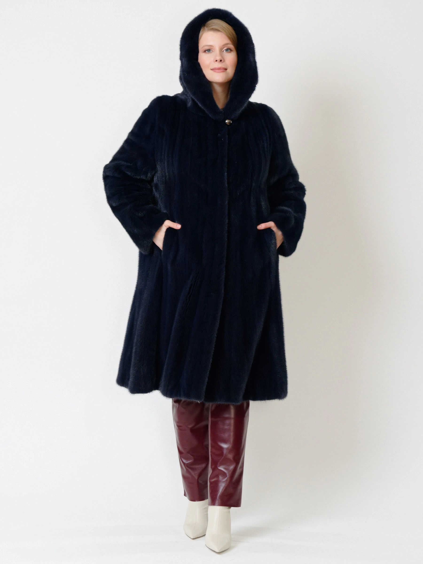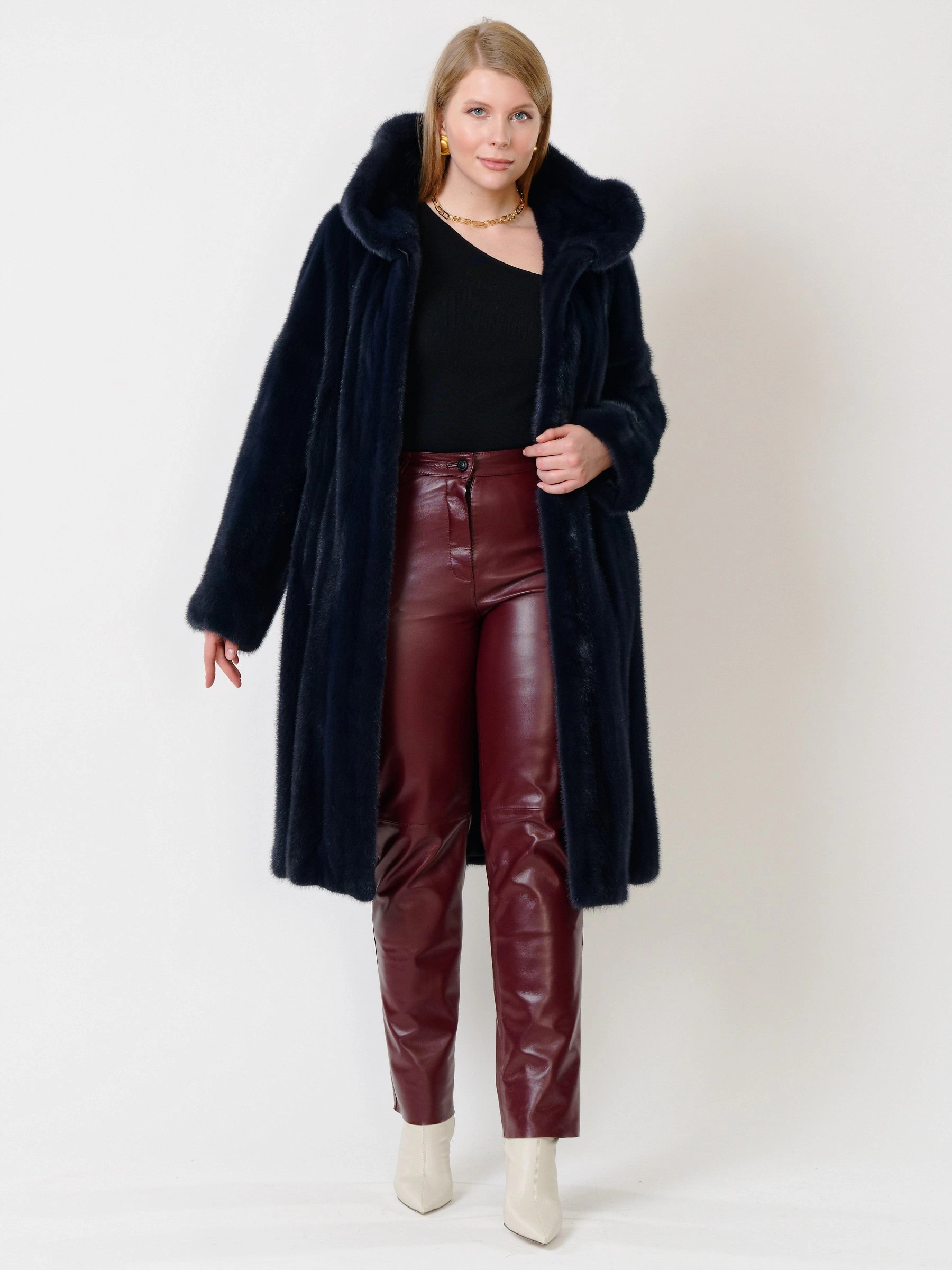 Эффектное пальто из нежного, густого меха норки. Удобный капюшон, комфортная посадка, правильная длина. Пальто получилось легким и теплым. Удачным сочетанием станут кожаные брюки свободного кроя премиум-класса.