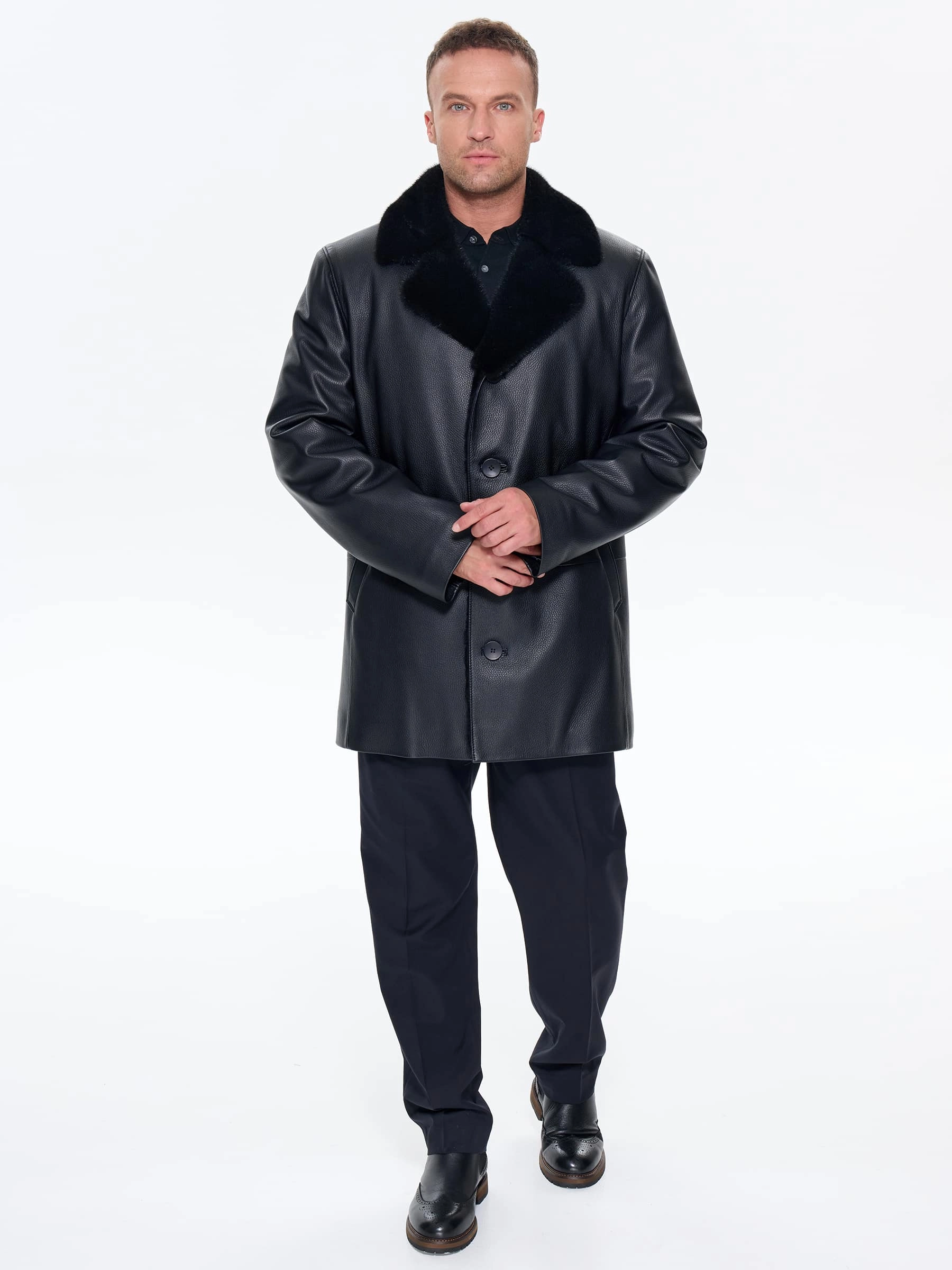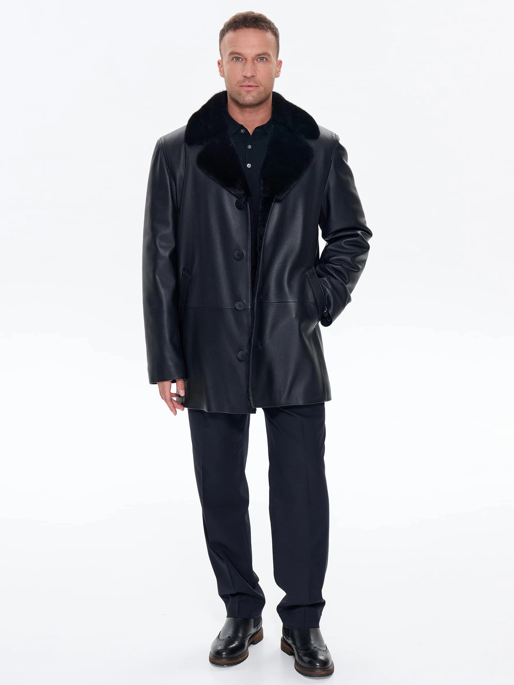 Товар зимняя кожаная куртка с норковым воротником для мужчин премиум класса 21/1мех, черная, размер 50, артикул 41170 выполнен из овчина "мерино" с застежкой пуговицы. Рассчитан на сезон: осень-зима.силуэт прямой.