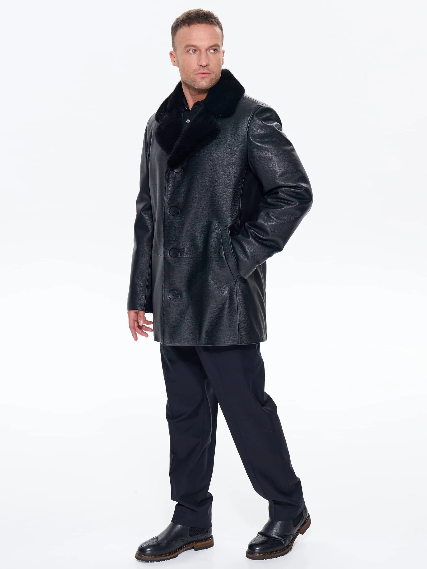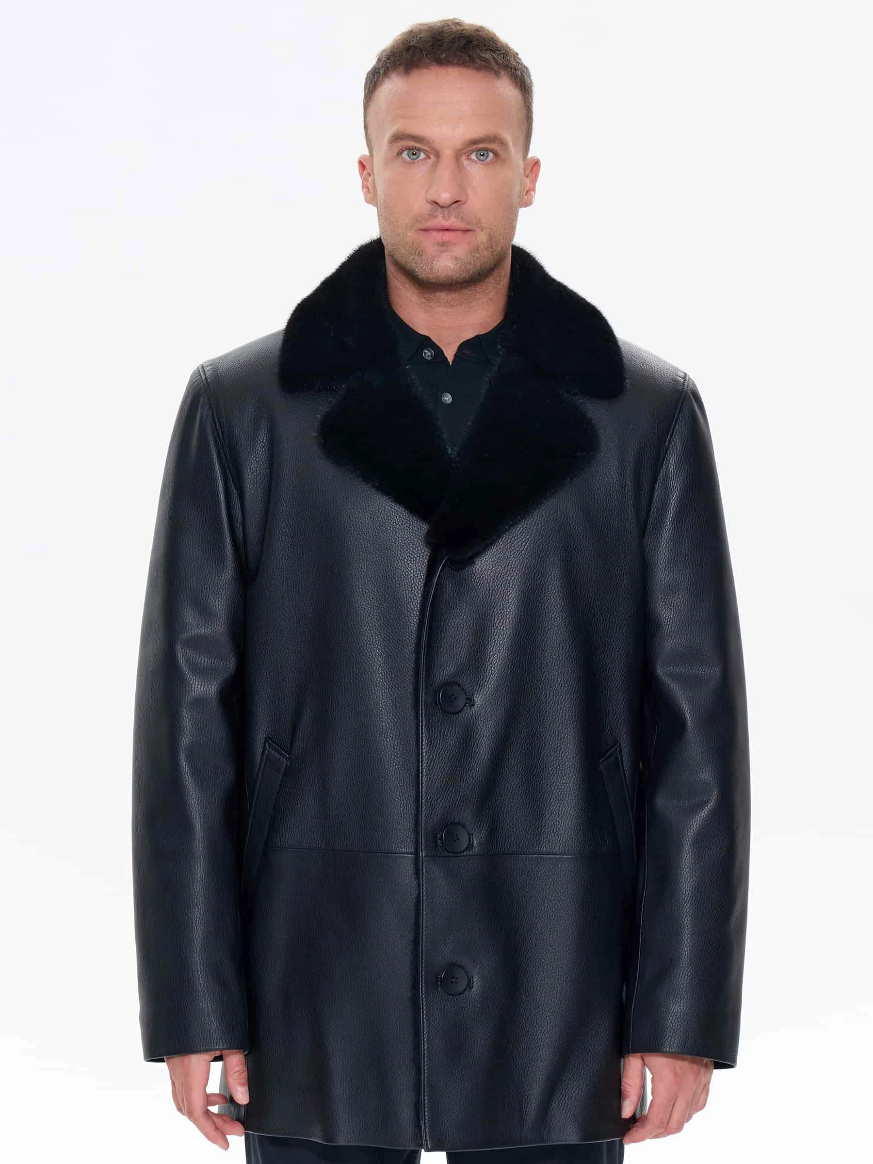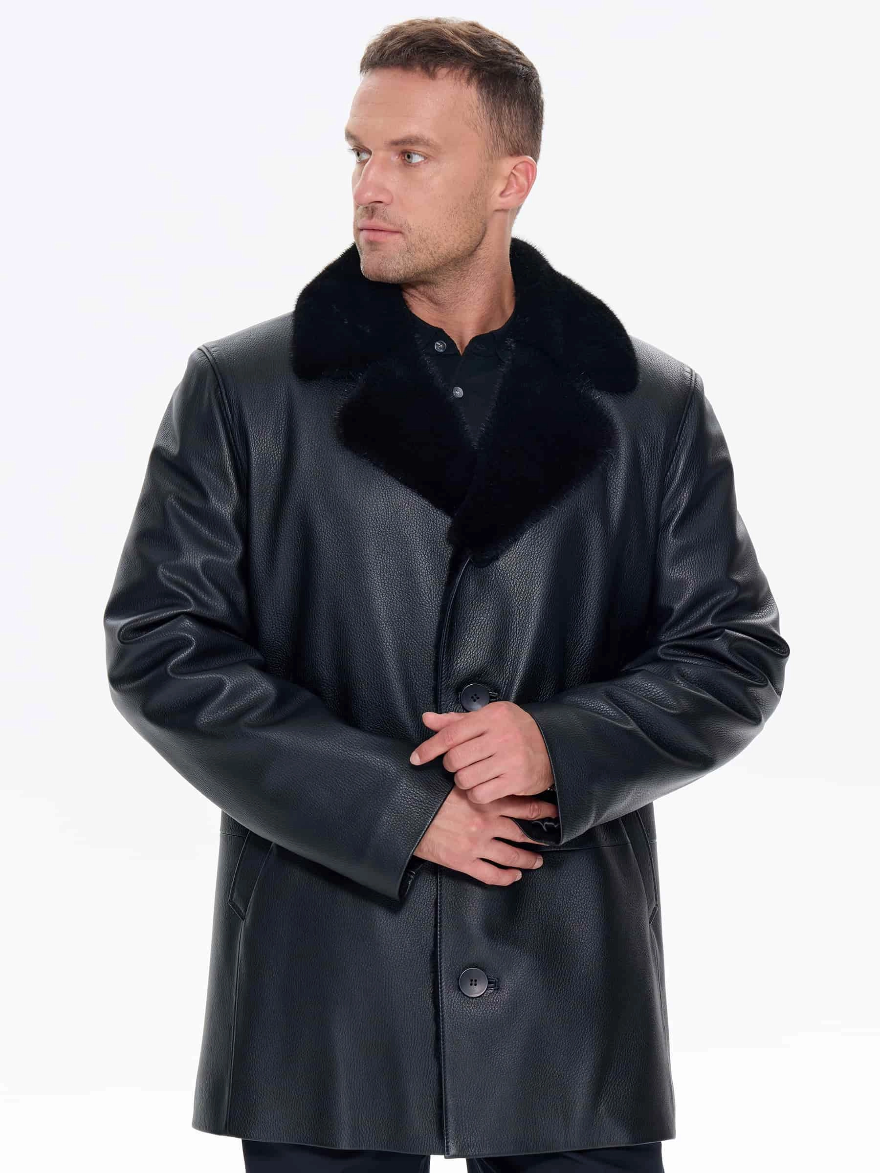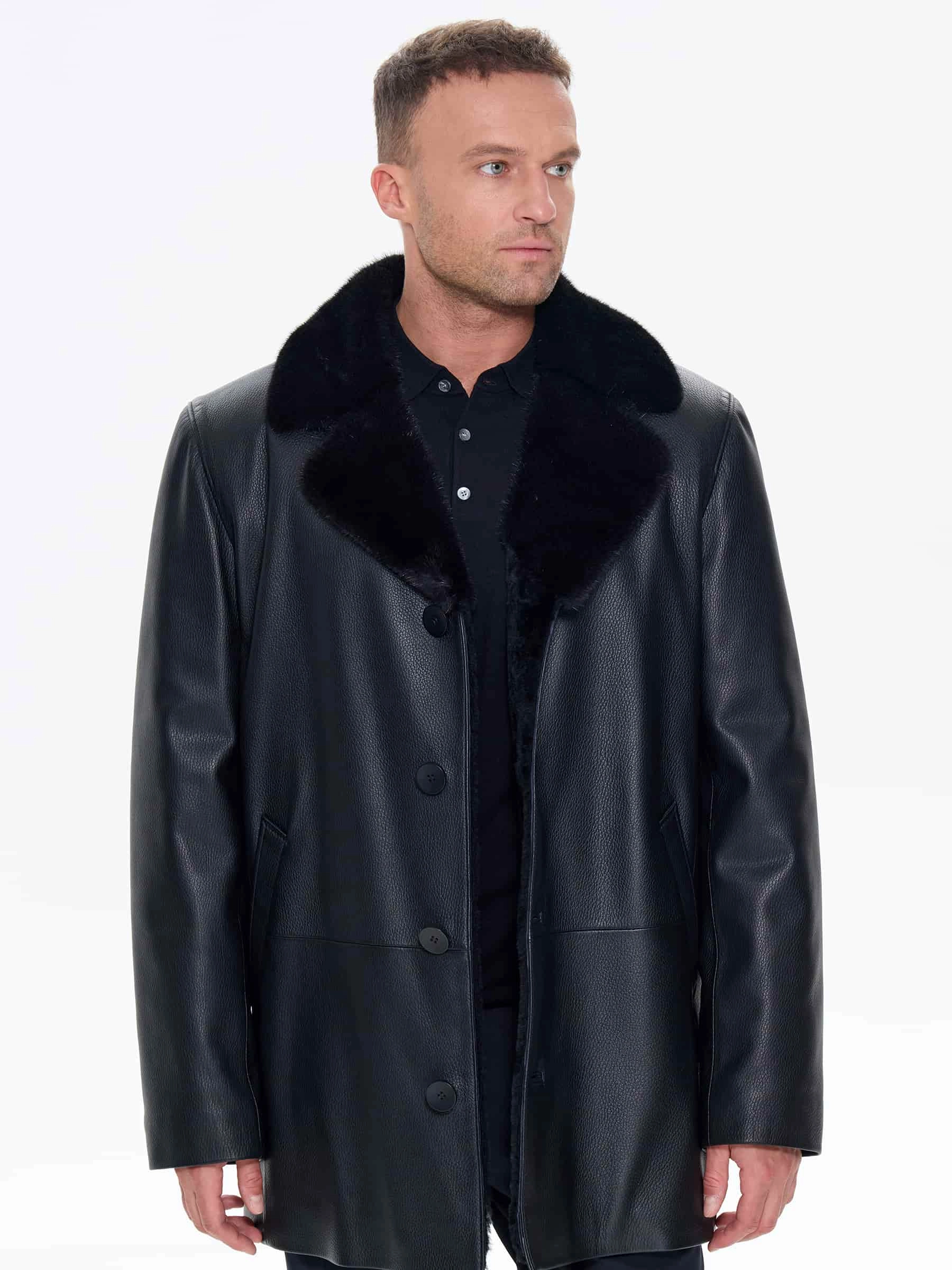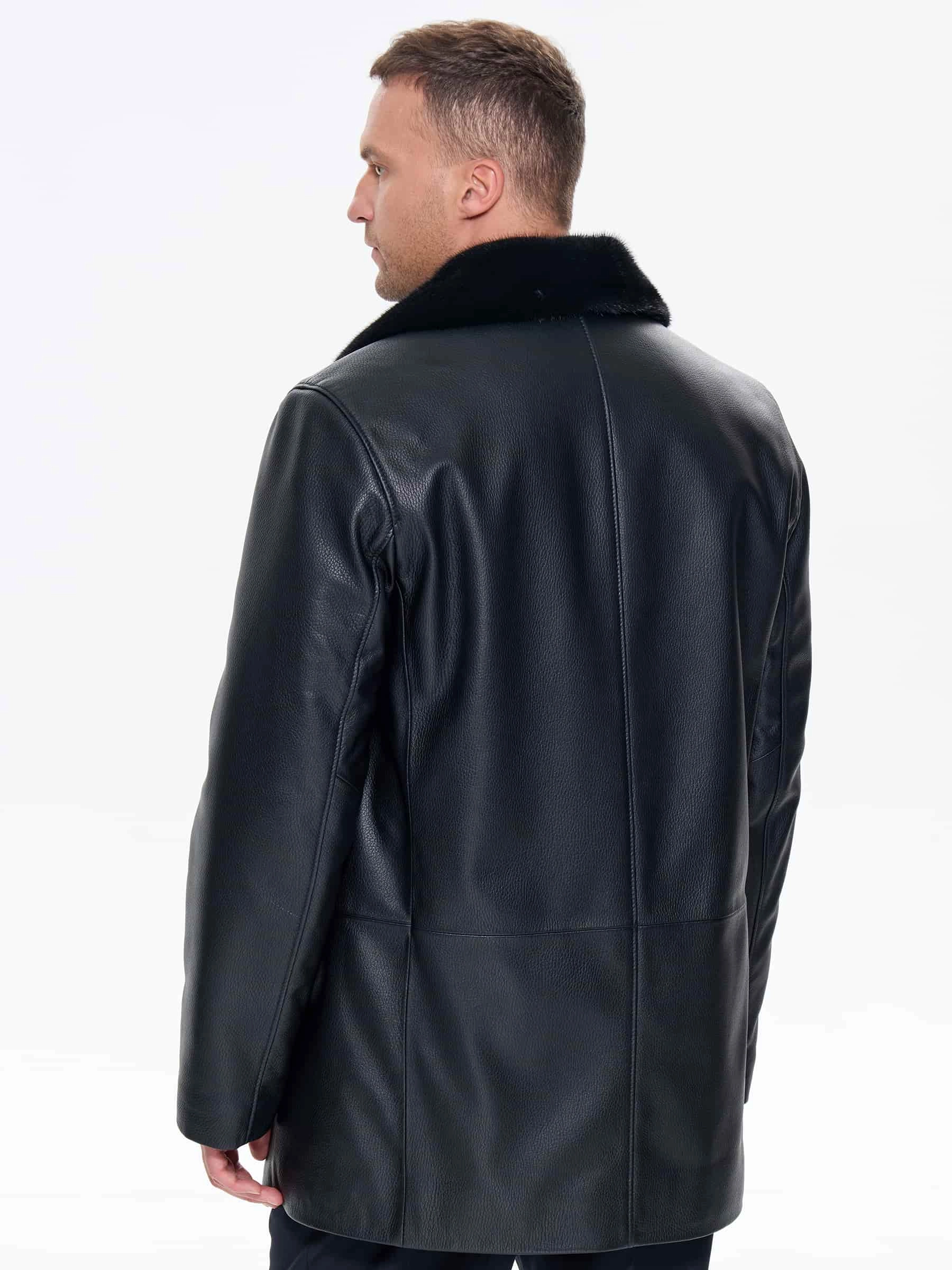 Зимняя кожаная куртка с норковым воротником для мужчин премиум класса 21/1мех, черная, размер 50, артикул 41170